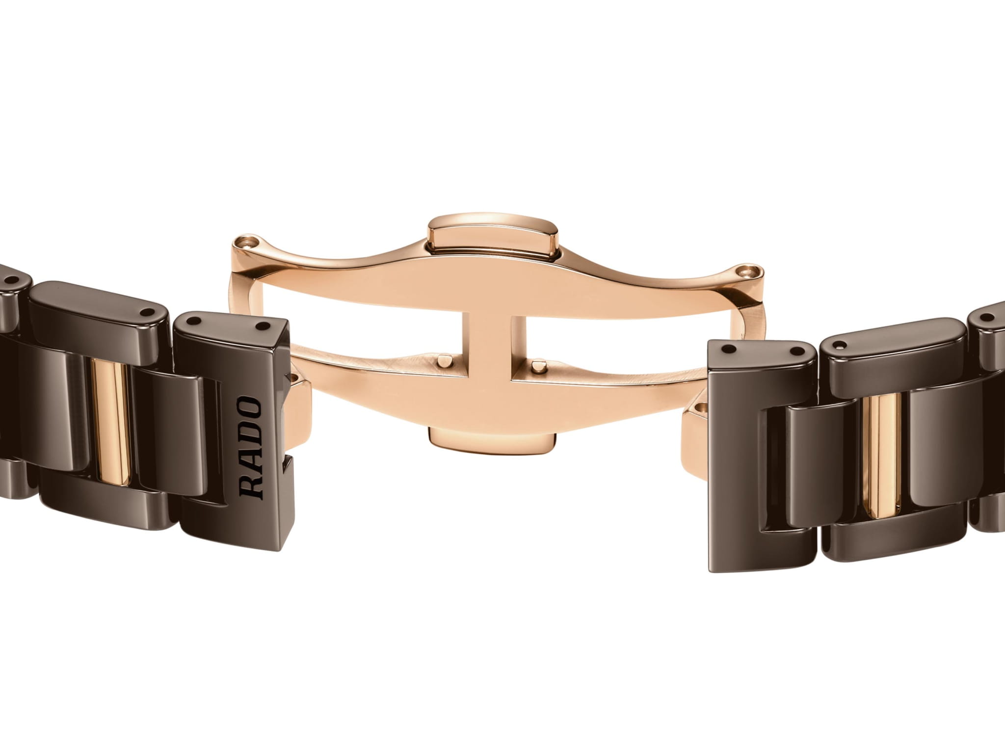 Женские кварцевые часы Rado — это изысканный аксессуар с современным дизайном. Корпус диаметром 31 мм выполнен из высокотехнологичной керамикиВысокотехнологичная керамикаИнновационный запатентованный Rado материал с гладкой или матовой поверхностью. Керамика за счёт кристаллической структуры обладает повышенной устойчивостью от возникновения царапин. Материал способен принимать температуру тела человека, обеспечивая невероятный комфорт при ношении. и нержавеющей стали с PVD-покрытиемPVDУльтратонкое покрытие наносится в технике вакуумного напыления, сочетает в себе нитрид титана особой прочности со слоем золота или оксида хрома. Несёт в себе декоративную или защитную функцию. розового золота. Циферблат коричневого цвета оформлен аналоговым дисплеем. Циферблат защищён выпуклым сапфировым стекломСапфировое стеклоПрочный и надёжный материал из кристалла сапфира синтетического происхождения, характеризующийся особой твёрдостью и устойчивостью к царапинам и повреждениям.. Окошко даты расположено в положении 3 часов. Механизм — кварцевый. Часы оснащены браслетом из комбинации керамики и стали с PVD-покрытиемPVDУльтратонкое покрытие наносится в технике вакуумного напыления, сочетает в себе нитрид титана особой прочности со слоем золота или оксида хрома. Несёт в себе декоративную или защитную функцию. и застёжкой «бабочка» с кнопкамиЗастёжка "бабочка"Такой вид застёжки дополняется предохранителями, помогающими избежать случайного раскрытия браслета. Обладают изящным исполнением. . Водонепроницаемость 50 м позволяет использовать часы в повседневных условиях. Гарантия — 5 лет на механизм, 2 года на изделие. Идеальный выбор для тех, кто ценит стиль, качество и универсальность.