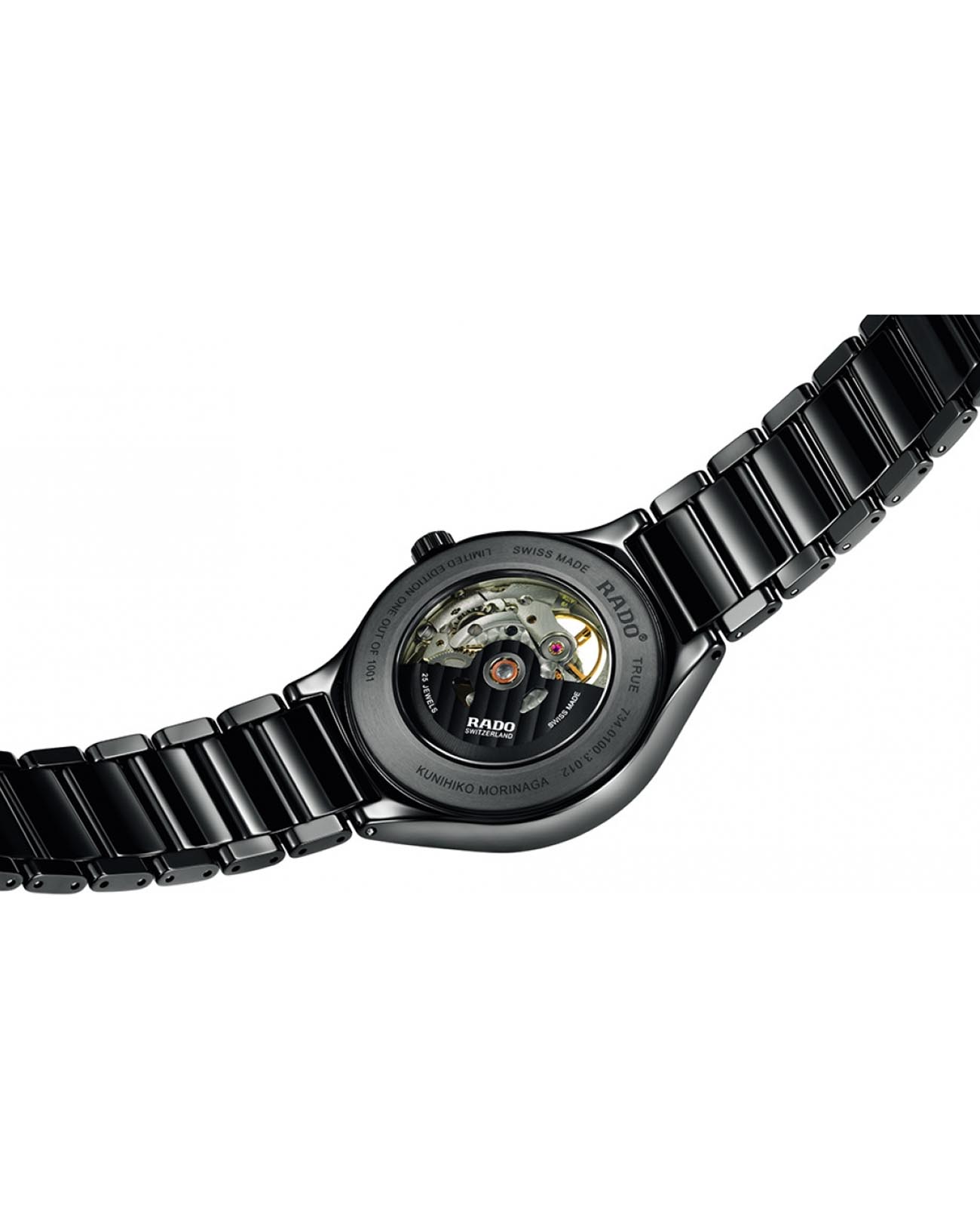 Женские механические швейцарские часы-скелетоны Rado True Shadow Automatic Limited Edition R27100122. Лимитированный выпуск (1001 экземпляр) Kunihiko Morinaga - модель создана при участии известного японского дизайнера Кунихико Моринаги. Сапфировое стеклоСапфировое стеклоПрочный и надёжный материал из кристалла сапфира синтетического происхождения, характеризующийся особой твёрдостью и устойчивостью к царапинам и повреждениям. устойчивое к мелким механическим повреждениям. Корпус часов изготовлен из высокотехнологичной керамикиВысокотехнологичная керамикаИнновационный запатентованный Rado материал с гладкой или матовой поверхностью. Керамика за счёт кристаллической структуры обладает повышенной устойчивостью от возникновения царапин. Материал способен принимать температуру тела человека, обеспечивая невероятный комфорт при ношении.. Скелетонизированный циферблат. Класс водозащиты: 50 метров, позволит защитить корпус от случайных брызг или капель дождя. Браслет высокотехнологичной керамикиВысокотехнологичная керамикаИнновационный запатентованный Rado материал с гладкой или матовой поверхностью. Керамика за счёт кристаллической структуры обладает повышенной устойчивостью от возникновения царапин. Материал способен принимать температуру тела человека, обеспечивая невероятный комфорт при ношении. на застёжке «бабочка» с кнопкамиЗастёжка "бабочка"Такой вид застёжки дополняется предохранителями, помогающими избежать случайного раскрытия браслета. Обладают изящным исполнением. .
