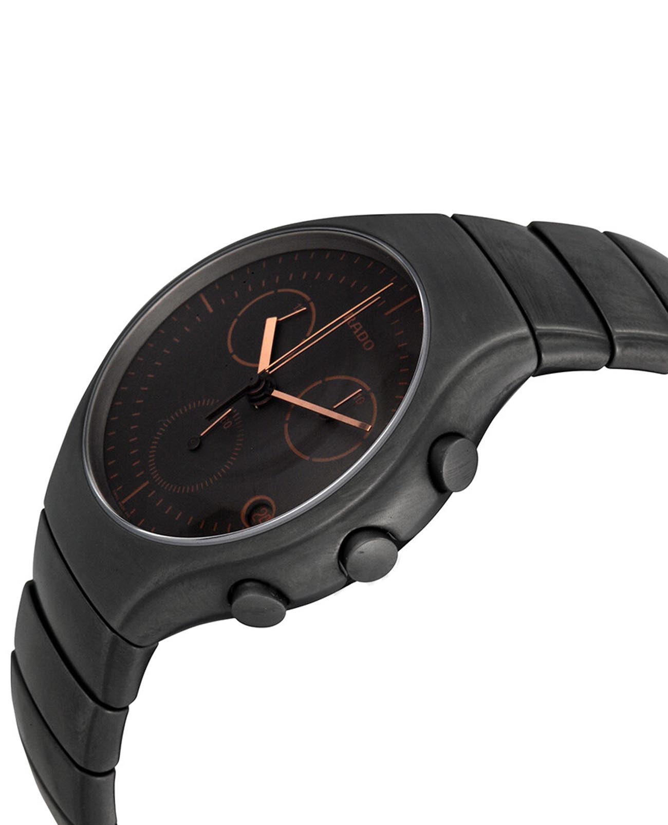 Мужские швейцарские часы-хронографХронографФункция позволяет измерять отрезки времени с особой точностью: часы, минуты, секунды. Верным признаком хронографа является наличие на циферблате 3 дополнительных окошек-счётчиков. Rado True R27897402. Сапфировое стеклоСапфировое стеклоПрочный и надёжный материал из кристалла сапфира синтетического происхождения, характеризующийся особой твёрдостью и устойчивостью к царапинам и повреждениям. устойчивое к мелким механическим повреждениям. Корпус часов изготовлен из высокотехнологичной керамикиВысокотехнологичная керамикаИнновационный запатентованный Rado материал с гладкой или матовой поверхностью. Керамика за счёт кристаллической структуры обладает повышенной устойчивостью от возникновения царапин. Материал способен принимать температуру тела человека, обеспечивая невероятный комфорт при ношении.. Класс водозащиты: 30 метров, позволит защитить корпус от случайных брызг или капель дождя. Браслет из высокотехнологичной керамикиВысокотехнологичная керамикаИнновационный запатентованный Rado материал с гладкой или матовой поверхностью. Керамика за счёт кристаллической структуры обладает повышенной устойчивостью от возникновения царапин. Материал способен принимать температуру тела человека, обеспечивая невероятный комфорт при ношении. на раскладной застёжкеРаскладная застёжкаТакой тип застёжки используется только на браслетах из металла. Она никогда не раскрывается полностью, происходит разделение на 2 и более частей. Раскладывающая застёжка снизит вероятность потери часов к минимуму..