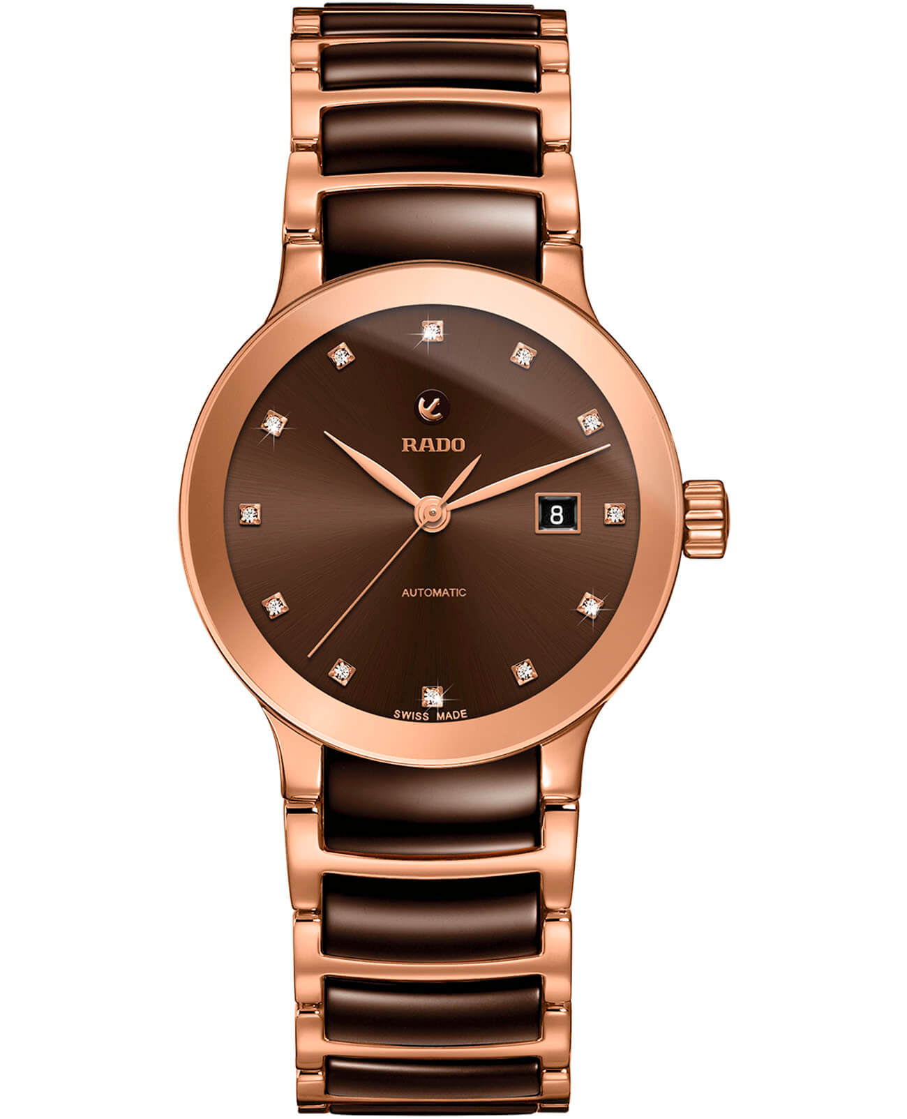 Изысканная модель в минималистичном исполнении грамотно завершит образ. Благодаря роскошному циферблату премиальный аксессуар сразу притягивает внимание, перед блеском 12 бриллиантов в 0,025 карат. Автоподзавод. Швейцарский калибр ETA 2671 имеет запас хода до 38 часов. Скелетонизированная задняя крышка стального корпуса. Сапфировое стекло. Браслет из нержавеющей стали 316L с PVD-покрытиемPVDУльтратонкое покрытие наносится в технике вакуумного напыления, сочетает в себе нитрид титана особой прочности со слоем золота или оксида хрома. Несёт в себе декоративную или защитную функцию. и вставок из высокотехнологичной керамикиВысокотехнологичная керамикаИнновационный запатентованный Rado материал с гладкой или матовой поверхностью. Керамика за счёт кристаллической структуры обладает повышенной устойчивостью от возникновения царапин. Материал способен принимать температуру тела человека, обеспечивая невероятный комфорт при ношении.. Водонепроницаемость 30 метров. Надёжная . Отображение числа. Диаметр корпуса: 28 мм.