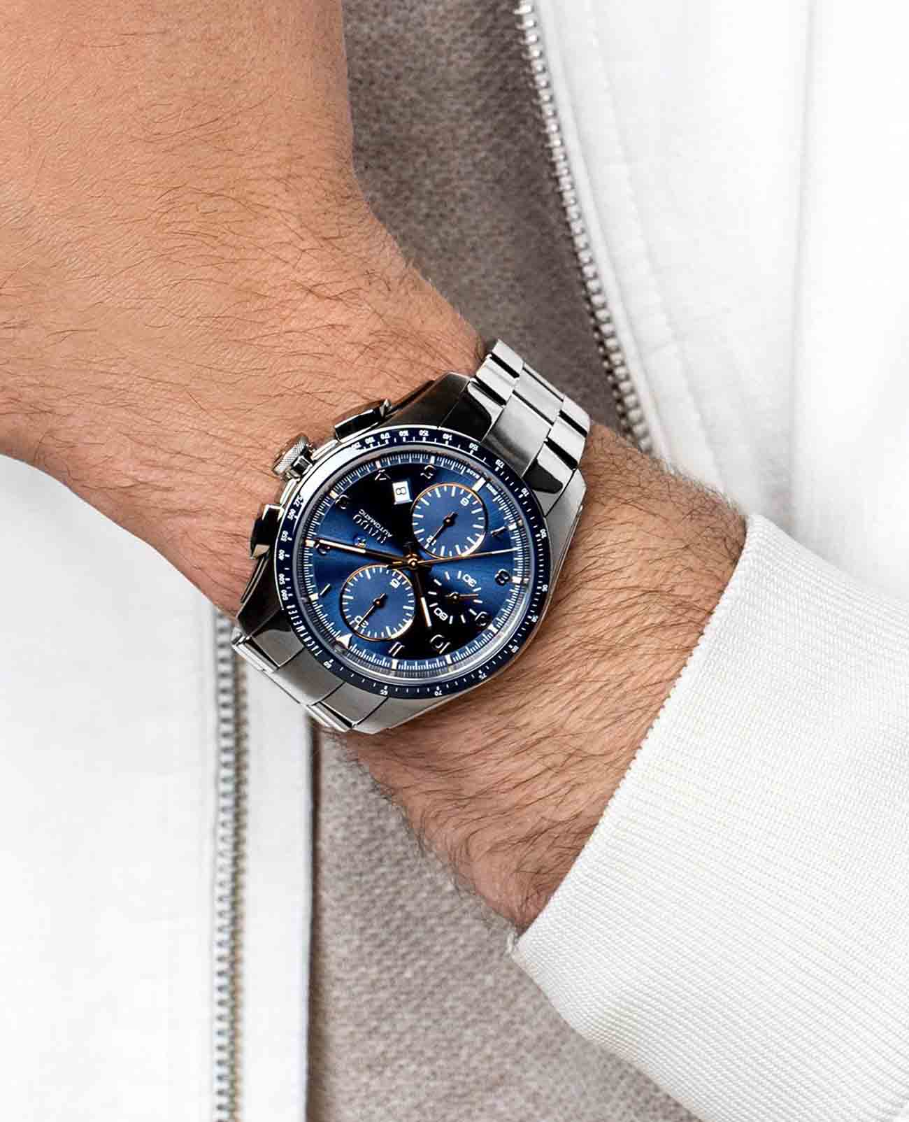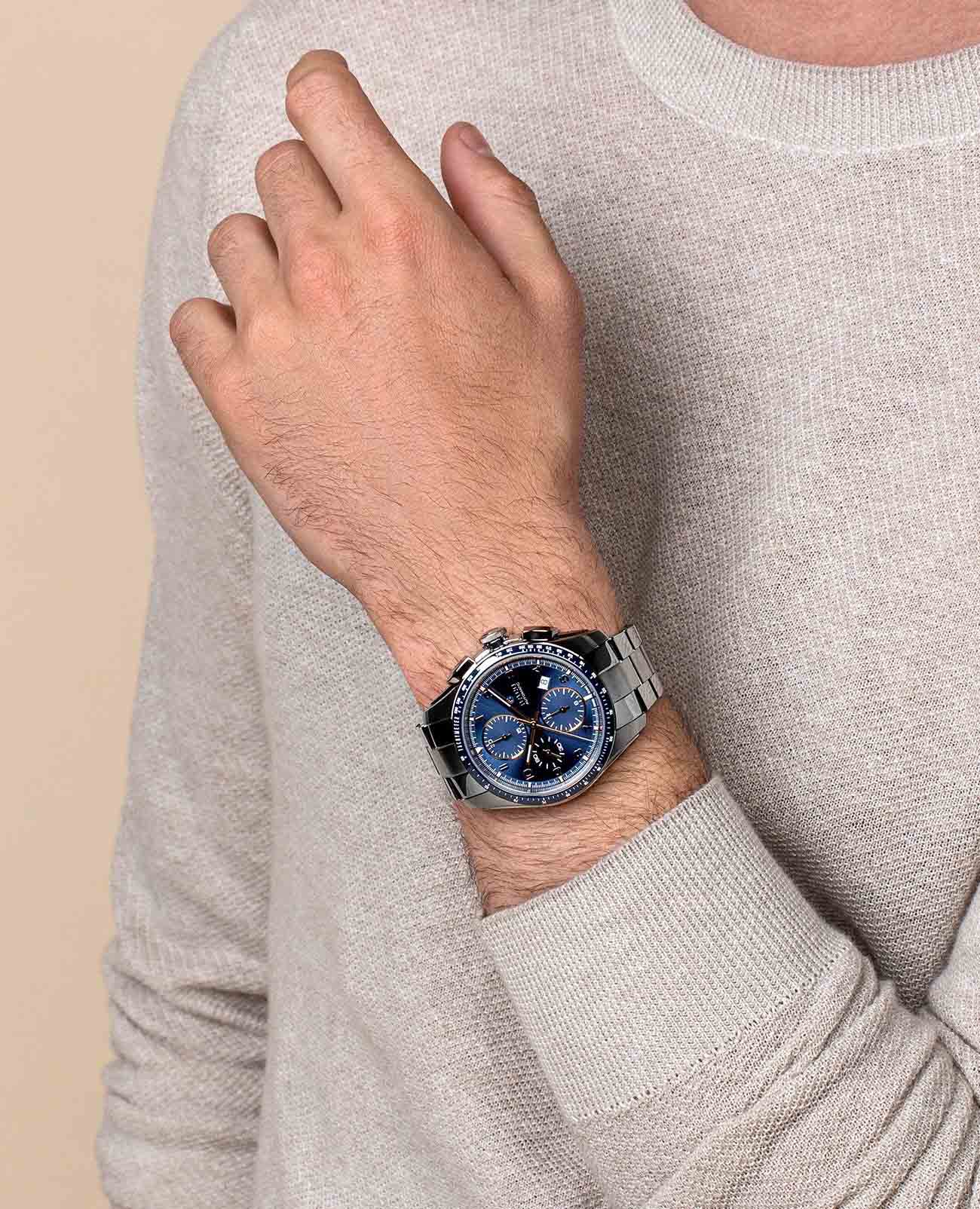 Мужские механические швейцарские часы-хронографХронографФункция позволяет измерять отрезки времени с особой точностью: часы, минуты, секунды. Верным признаком хронографа является наличие на циферблате 3 дополнительных окошек-счётчиков. с автоподзаводом Rado Hyperchrome Automatic Chronograph R32042303. Сапфировое стеклоСапфировое стеклоПрочный и надёжный материал из кристалла сапфира синтетического происхождения, характеризующийся особой твёрдостью и устойчивостью к царапинам и повреждениям. устойчивое к мелким механическим повреждениям. Корпус часов изготовлен из нержавеющей стали и титана. БезельБезельВнешний ободок, закрепляющий стекло. В спортивных часах так называется поворотное кольцо с делениями на циферблате, выполняет роль таймера – замеряет отрезки времени на шкале. Неподвижный безель – элемент декора. Однонаправленно вращающийся безель на дайверских часах позволяет фиксировать моменты погружения и выныривания на поверхность. со шкалой тахиметраТахиметрРазмеченная шкала, располагается на ободке или безеле часов. Тахиметр позволяет рассчитать скорость на определённом участке пути, расстояние измеряется в километрах или милях. из высокотехнологичной керамикиВысокотехнологичная керамикаИнновационный запатентованный Rado материал с гладкой или матовой поверхностью. Керамика за счёт кристаллической структуры обладает повышенной устойчивостью от возникновения царапин. Материал способен принимать температуру тела человека, обеспечивая невероятный комфорт при ношении.. Окошко даты находится в положении между 4 и 5 часами. Стрелки с люминесцентным покрытиемЛюминесцентное покрытиеПозволяет считывать показания времени в темноте. Производители наносят на стрелки, часовые индексы, безель или поверхность циферблата светонакопительный состав, дающий холодное свечение.. Класс водозащиты: 100 метров, позволит плавать, нырять и заниматься другими водными видами спорта. Браслет из нержавеющей стали и титана на раскладной застёжкеРаскладная застёжкаТакой тип застёжки используется только на браслетах из металла. Она никогда не раскрывается полностью, происходит разделение на 2 и более частей. Раскладывающая застёжка снизит вероятность потери часов к минимуму..