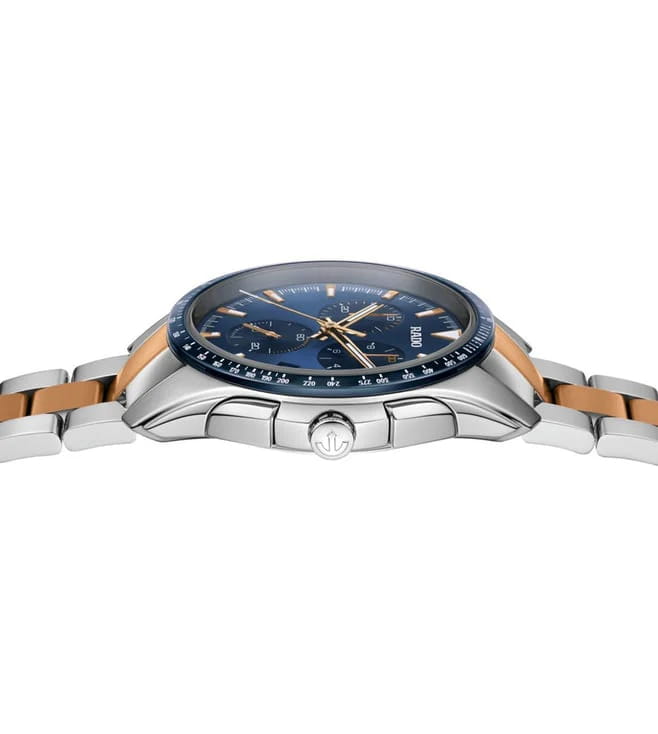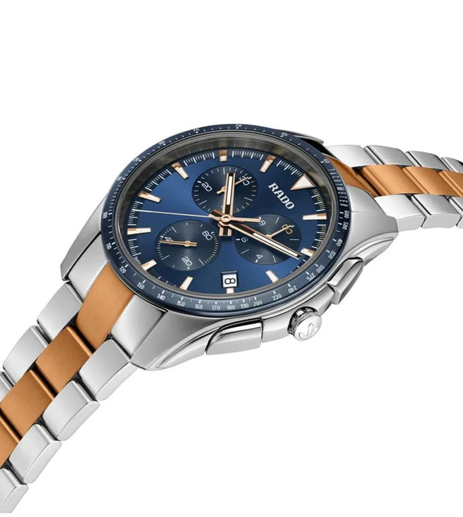 Мужские наручные часы-хронографХронографФункция позволяет измерять отрезки времени с особой точностью: часы, минуты, секунды. Верным признаком хронографа является наличие на циферблате 3 дополнительных окошек-счётчиков. Rado Hyperchrome Chronograph. Корпус часов изготовлен из нержавеющей стали. Стальной браслет с частичным PVD-покрытиемPVDУльтратонкое покрытие наносится в технике вакуумного напыления, сочетает в себе нитрид титана особой прочности со слоем золота или оксида хрома. Несёт в себе декоративную или защитную функцию. на застёжкой «бабочка» с кнопкамиЗастёжка "бабочка"Такой вид застёжки дополняется предохранителями, помогающими избежать случайного раскрытия браслета. Обладают изящным исполнением. . БезельБезельВнешний ободок, закрепляющий стекло. В спортивных часах так называется поворотное кольцо с делениями на циферблате, выполняет роль таймера – замеряет отрезки времени на шкале. Неподвижный безель – элемент декора. Однонаправленно вращающийся безель на дайверских часах позволяет фиксировать моменты погружения и выныривания на поверхность. со шкалой тахиметраТахиметрРазмеченная шкала, располагается на ободке или безеле часов. Тахиметр позволяет рассчитать скорость на определённом участке пути, расстояние измеряется в километрах или милях.. Окошко даты находится в положении 4 часа. Стрелки и метки с люминесцентным покрытиемЛюминесцентное покрытиеПозволяет считывать показания времени в темноте. Производители наносят на стрелки, часовые индексы, безель или поверхность циферблата светонакопительный состав, дающий холодное свечение.. Сапфировое стеклоСапфировое стеклоПрочный и надёжный материал из кристалла сапфира синтетического происхождения, характеризующийся особой твёрдостью и устойчивостью к царапинам и повреждениям. с антибликовым покрытиемАнтибликовое покрытиеСлой оксида металла в 0,13-0,3 микрон, благодаря которому стекло часов не бликует и не отражает свет. Антибликовое покрытие уменьшает отражение света в 10 раз, обеспечивая отличную читаемость показателей циферблата. устойчивое к мелким механическим повреждениям. Класс водозащиты: 100 метров, позволит плавать, нырять и заниматься другими водными видами спорта.