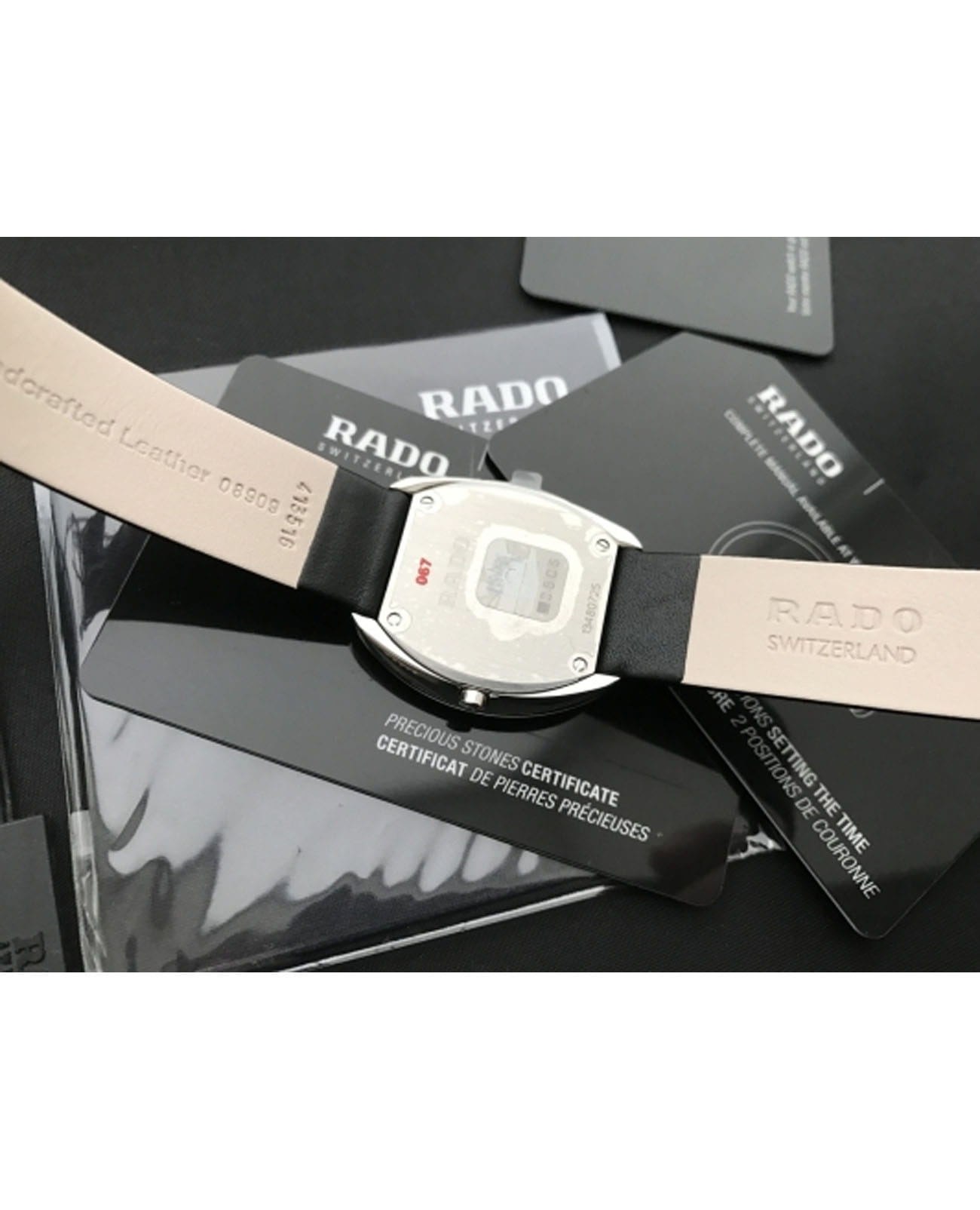 Швейцарские женские Rado Esenza R53739715, кварцевый механизм с высокой точностью. Сапфировое стеклоСапфировое стеклоПрочный и надёжный материал из кристалла сапфира синтетического происхождения, характеризующийся особой твёрдостью и устойчивостью к царапинам и повреждениям. устойчивое к появлению царапин, обладающее высокой прозрачностью. Корпус часов изготовлен из нержавеющей стали. Циферблат украшен бриллиантами. Класс водозащиты: 30 метров, позволит защитить корпус от случайных брызг или капель дождя. Кожаный браслет на стандартной застежке.