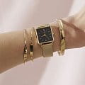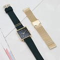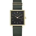 Женские кварцевые часы. Центральные часовая, минутная и секундная стрелки. Апертура даты в позиции 3 часов. Черный циферблат. Корпус выполнен из полированной нержавеющей стали с IP покрытием цвета желтого золота. Размер корпуса составляет 26х28 мм, толщина 7 мм. Кожаный ремешок темно-зеленого цвета шириной 16 мм, стандартная застежка. Прочное минеральное стекло устойчивое к мелким механическим повреждениям. Водостойкость WR 30 (брызги). В комплекте стальной браслет с IP покрытием цвета желтого золота выполненный в технике миланского плетения.