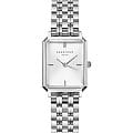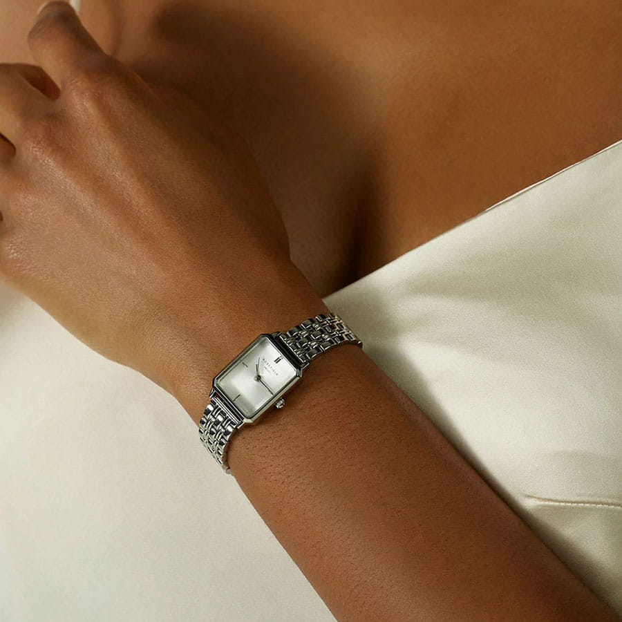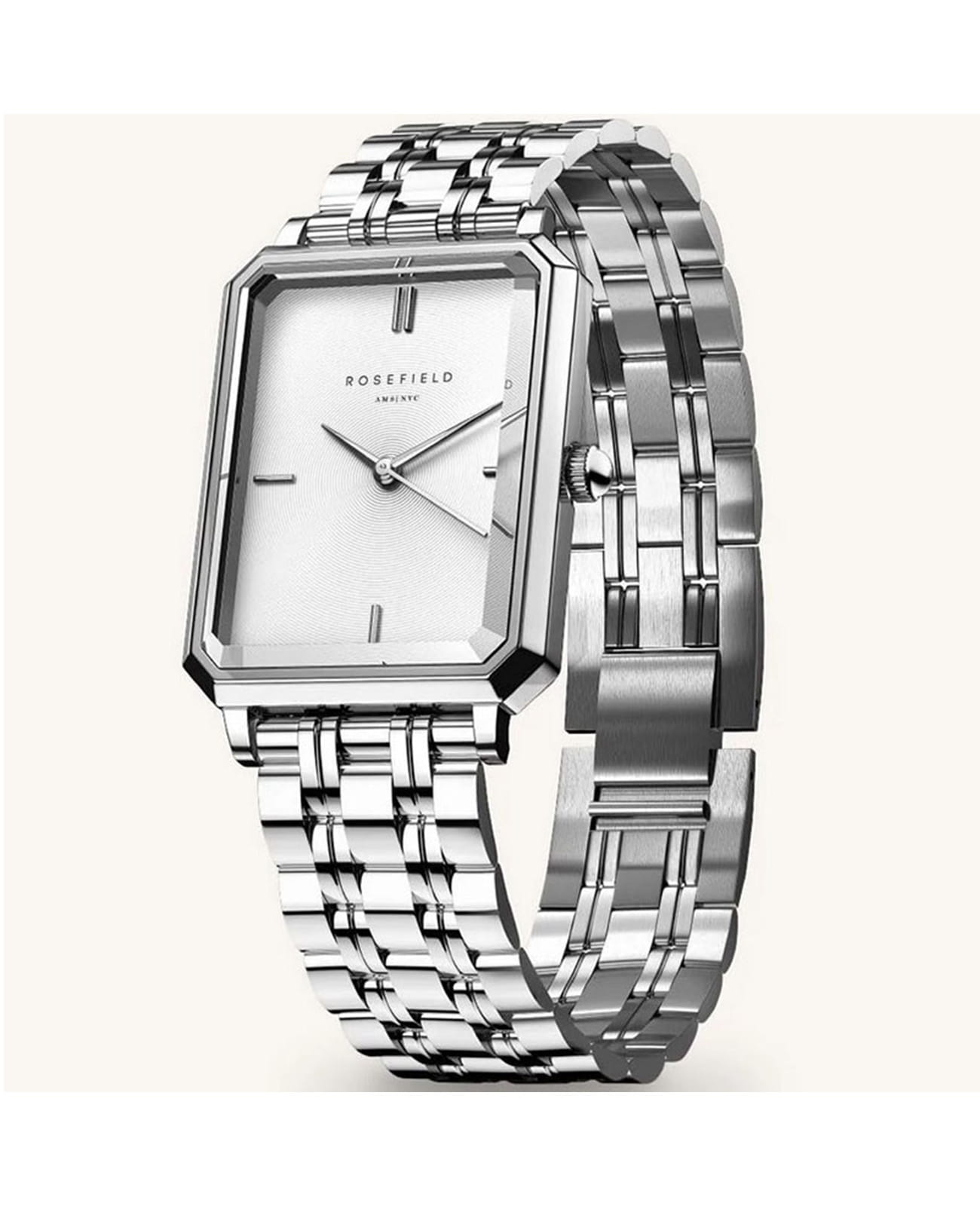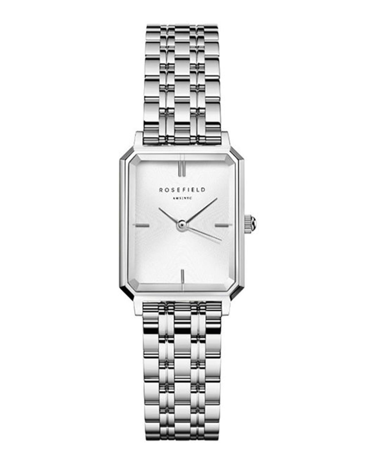 Женские кварцевые часы. Центральные часовая, минутная и секундная стрелки. Серебристый циферблат. Восьмиугольный корпус выполнен из металла с серебристым IP покрытием. Размер корпуса составляет 19,5 х 24 мм, толщина 7 мм. Стальной браслет, браслетная застежка. Прочное минеральное стекло устойчивое к мелким механическим повреждениям. Водостойкость WR 30 (брызги).