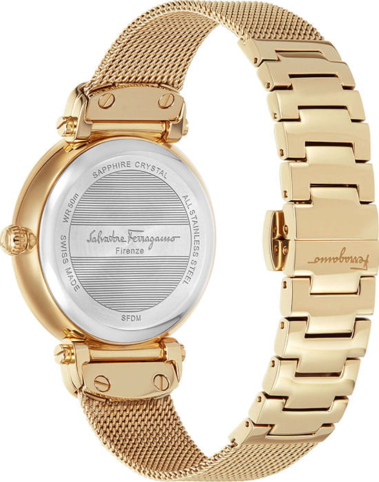 Женские швейцарские часы с сапфировым стеклом Salvatore Ferragamo SFDM00718, кварцевый механизм с высокой точностью. Сапфировое стекло устойчивое к появлению царапин, обладающее высокой прозрачностью. Класс водозащиты: 50 метров, позволит защитить корпус от случайных брызг или капель дождя. Корпус часов изготовлен из стали, позолоченного цвета.