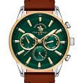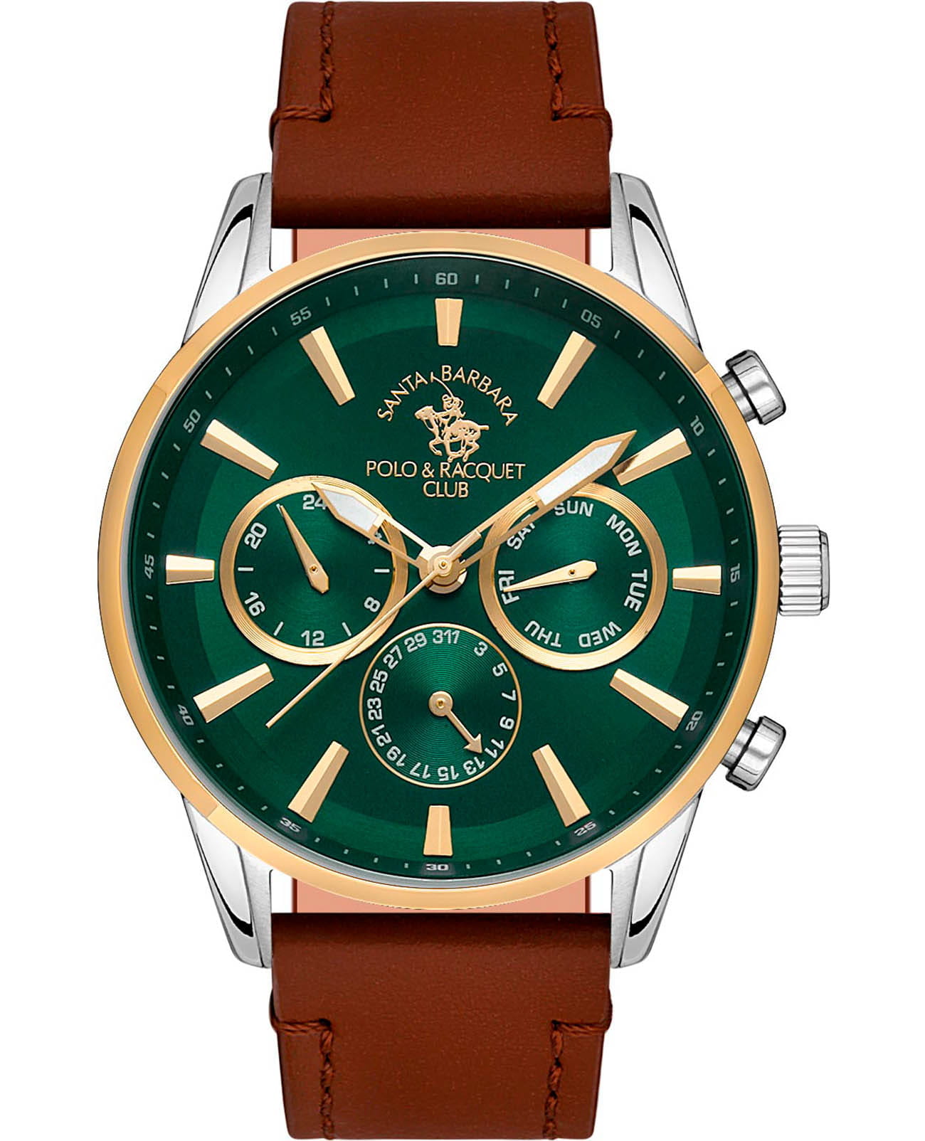 Мужские кварцевые часы Santa Barbara Polo & Racquet Club — это стильный и функциональный аксессуар для современного джентльмена. Корпус диаметром 44 мм выполнен из стали с матовой и полированной отделкой. Безель из нержавеющей стали с IP-покрытиемIP-покрытиеМетод ионного напыления. Демонстрирует повышенную устойчивость к истиранию, окислению и химическим веществам. Под воздействием высокого давления и температуры около 1500°C молекулы металла надёжно соединяются с частицами корпуса часов.. Циферблат зелёного цвета оформлен по технологии Sunray («солнечные лучи»), дополнен накладными метками в виде штрихов и фирменным логотипом. Указатели дня недели и даты вынесены на отдельные субциферблаты, также присутствует индикация 24-часового формата времени. Стрелки мечевидной формы с люминесцентным покрытиемЛюминесцентное покрытиеПозволяет считывать показания времени в темноте. Производители наносят на стрелки, часовые индексы, безель или поверхность циферблата светонакопительный состав, дающий холодное свечение., обеспечивающим хорошую читаемость в темноте. Циферблат защищён минеральным стекломМинеральное стеклоМинеральное стекло представляет собой искусственно выращенный минерал кварца. Такое стекло отличается особой устойчивостью к повреждениям и царапинам. Уступает по некоторым качествам сапфировому стеклу.. Механизм — кварцевый калибр VX9JE. Часы оснащены кожаным ремешком с классической пряжкой. Водонепроницаемость 50 м позволяет использовать часы в повседневных условиях. Идеальный выбор для тех, кто ценит элегантность, точность и надёжность.