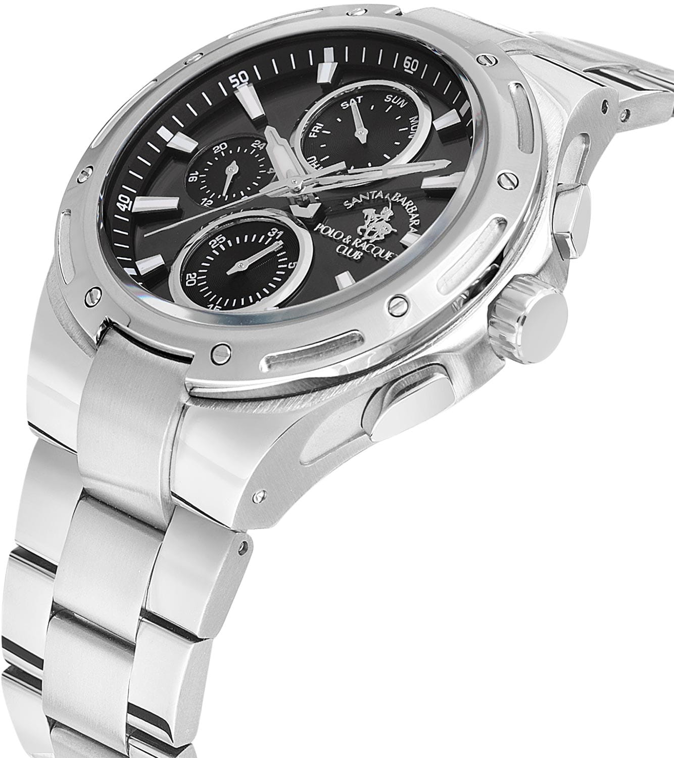 Мужские кварцевые часы Santa Barbara Polo & Racquet Club — это эффектный и функциональный аксессуар. Корпус диаметром 44 мм выполнен из стали с матовой и полированной отделкой. Циферблат чёрного цвета оформлен по технологии Sunray («солнечные лучи»), дополнен накладными метками в виде штрихов и фирменным логотипом. Указатели дня недели и даты вынесены на отдельные субциферблаты, также присутствует индикация 24-часового формата времени. Стрелки заострённые, прямоугольные, в стиле Baton, с люминесцентным покрытиемЛюминесцентное покрытиеПозволяет считывать показания времени в темноте. Производители наносят на стрелки, часовые индексы, безель или поверхность циферблата светонакопительный состав, дающий холодное свечение., обеспечивающим хорошую читаемость в темноте. Метки также имеют люминесцентное покрытие. Циферблат защищён минеральным стекломМинеральное стеклоМинеральное стекло представляет собой искусственно выращенный минерал кварца. Такое стекло отличается особой устойчивостью к повреждениям и царапинам. Уступает по некоторым качествам сапфировому стеклу.. Часы оснащены стальным браслетом с раскладной застёжкойРаскладная застёжкаТакой тип застёжки используется только на браслетах из металла. Она никогда не раскрывается полностью, происходит разделение на 2 и более частей. Раскладывающая застёжка снизит вероятность потери часов к минимуму.. Водонепроницаемость 50 м позволяет использовать часы в повседневных условиях. Идеальный выбор для тех, кто ценит стиль, точность и надёжность.