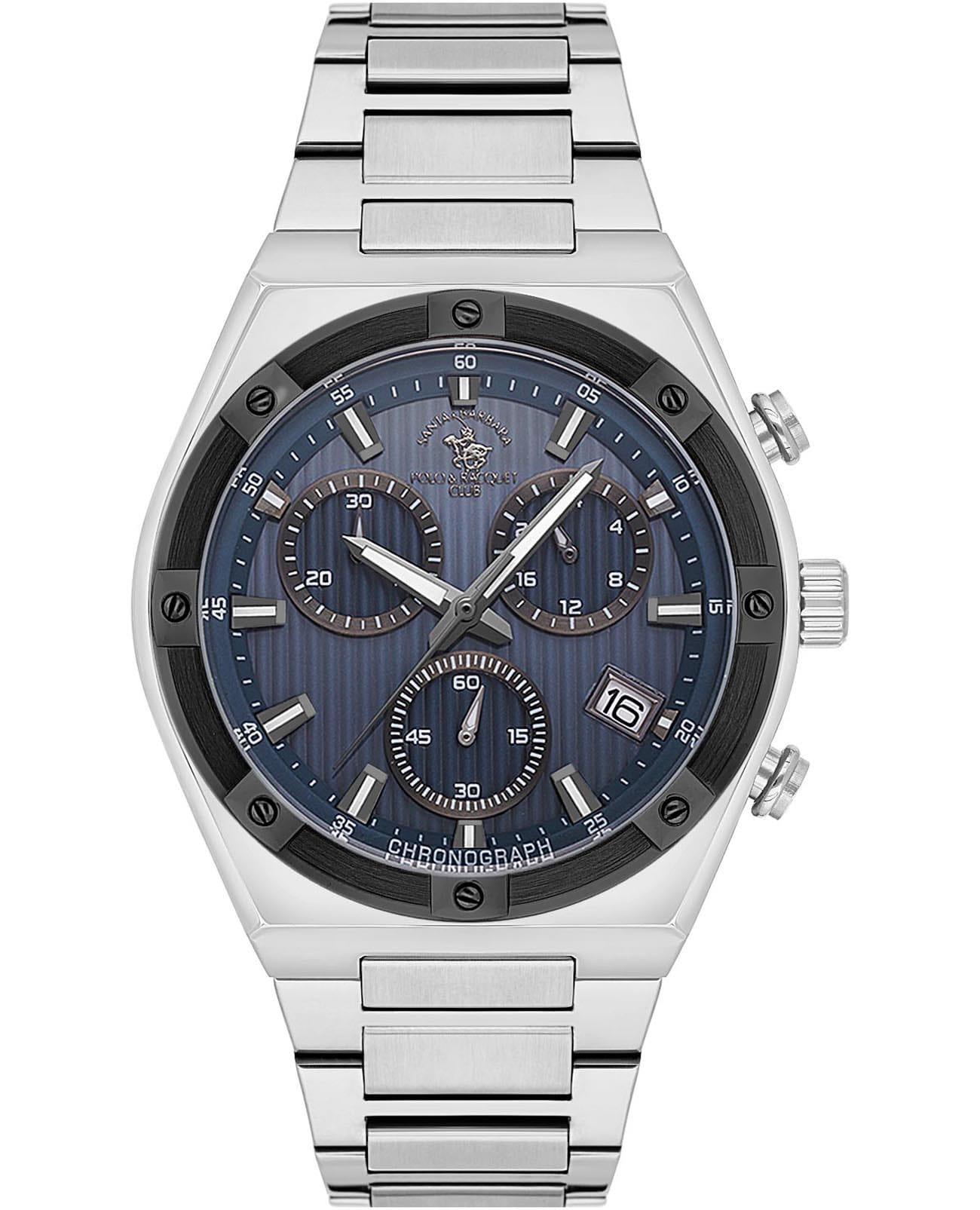 Santa Barbara Polo & Racquet Club Legend SB.1.10583-5 — стильные кварцевые мужские наручные часы-хронографХронографФункция позволяет измерять отрезки времени с особой точностью: часы, минуты, секунды. Верным признаком хронографа является наличие на циферблате 3 дополнительных окошек-счётчиков. с секундомеромСекундомерСекундоме́р — прибор, способный измерять интервалы времени с точностью до долей секунды., сочетающие спортивную динамику и функциональность. Крупный корпус выполнен из нержавеющей стали и гармонично дополнен стальным браслетом на раскладной застёжкеРаскладная застёжкаТакой тип застёжки используется только на браслетах из металла. Она никогда не раскрывается полностью, происходит разделение на 2 и более частей. Раскладывающая застёжка снизит вероятность потери часов к минимуму.. Неподвижный безельБезельВнешний ободок, закрепляющий стекло. В спортивных часах так называется поворотное кольцо с делениями на циферблате, выполняет роль таймера – замеряет отрезки времени на шкале. Неподвижный безель – элемент декора. Однонаправленно вращающийся безель на дайверских часах позволяет фиксировать моменты погружения и выныривания на поверхность. с IP-покрытиемIP-покрытиеМетод ионного напыления. Демонстрирует повышенную устойчивость к истиранию, окислению и химическим веществам. Под воздействием высокого давления и температуры около 1500°C молекулы металла надёжно соединяются с частицами корпуса часов. черного цвета. Циферблат с акцентными метками и стрелками с люминесцентным покрытиемЛюминесцентное покрытиеПозволяет считывать показания времени в темноте. Производители наносят на стрелки, часовые индексы, безель или поверхность циферблата светонакопительный состав, дающий холодное свечение. оформлен в многослойной структуре и оснащён вспомогательными индикаторами, включая 24-часовой формат времени. В нижней части расположено окошко даты, что делает модель ещё более практичной. Минеральное стеклоМинеральное стеклоМинеральное стекло представляет собой искусственно выращенный минерал кварца. Такое стекло отличается особой устойчивостью к повреждениям и царапинам. Уступает по некоторым качествам сапфировому стеклу. защищает циферблат от царапин, а кварцевый механизм обеспечивает высокую точность. Благодаря своей универсальной эстетике эти часы уместны и в деловой среде, и в повседневном образе.
