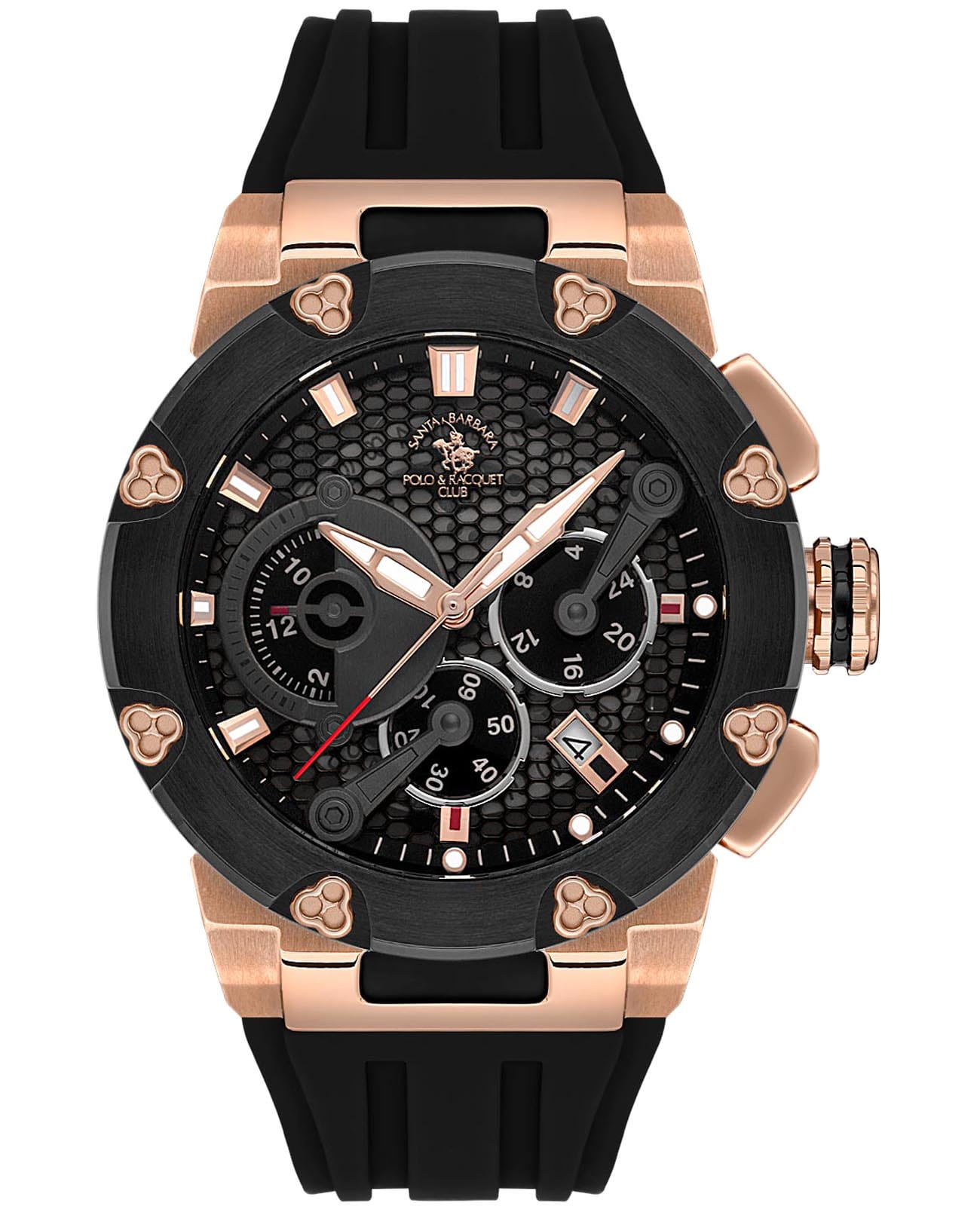 Мужские кварцевые Santa Barbara Polo & Racquet Club SB.5.10001-5 — воплощение элегантности и технического совершенства. Корпус из нержавеющей стали с IP-покрытиемIP-покрытиеМетод ионного напыления. Демонстрирует повышенную устойчивость к истиранию, окислению и химическим веществам. Под воздействием высокого давления и температуры около 1500°C молекулы металла надёжно соединяются с частицами корпуса часов., диаметром 45 мм, что делает их устойчивыми к внешним воздействиям и придает благородный вид. Неподвижный безельБезельВнешний ободок, закрепляющий стекло. В спортивных часах так называется поворотное кольцо с делениями на циферблате, выполняет роль таймера – замеряет отрезки времени на шкале. Неподвижный безель – элемент декора. Однонаправленно вращающийся безель на дайверских часах позволяет фиксировать моменты погружения и выныривания на поверхность. с IP-покрытиемIP-покрытиеМетод ионного напыления. Демонстрирует повышенную устойчивость к истиранию, окислению и химическим веществам. Под воздействием высокого давления и температуры около 1500°C молекулы металла надёжно соединяются с частицами корпуса часов. черного цвета. Стрелки и метки с люминесцентным покрытиемЛюминесцентное покрытиеПозволяет считывать показания времени в темноте. Производители наносят на стрелки, часовые индексы, безель или поверхность циферблата светонакопительный состав, дающий холодное свечение., обеспечивающим хорошую читаемость в темноте. Циферблат защищён минеральным стекломМинеральное стеклоМинеральное стекло представляет собой искусственно выращенный минерал кварца. Такое стекло отличается особой устойчивостью к повреждениям и царапинам. Уступает по некоторым качествам сапфировому стеклу. устойчивое к царапинам и механическим повреждениям. 12-ти и 24-х часовой формат времени. Окошко даты находится между отметками 4 и 5 часов. Второй часовой поясВторой часовой поясФункция, позволяющая отображать время двух часовых поясов одновременно.. Силиконовый ремешок на стандартной застёжке обеспечивает комфортное и безопасное ношение. Водонепроницаемость 100 метров позволит плавать, нырять и заниматься другими водными видами спорта. Идеальный выбор для тех, кто ценит элегантный дизайн и качество.