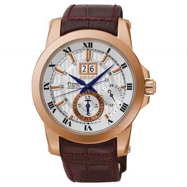 Японские мужские часы с механизмом Seiko Kinetic. Оснащены функцией вечного календаря. Корпус часов выполнен из высокопрочной стали с полным PVD покрытием золотого цвета. Светлый фон циферблата, золотые элементы дизайна, контрастные синие стрелки. Часы снабжены сапфировым стеклом, устойчивым к царапинам. Водонепроницаемость 10 ATM. Система индикации низкого заряда батареи.