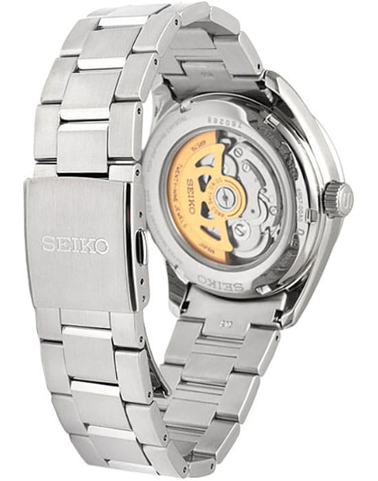 Высокую точность хода обеспечивает японский калибр Seiko 4R57 с резервом хода до 40 часов, есть возможность ручного и автоматического завода. Прозрачная задняя крышка позволяет просматривать движение деталей механизма. Корпус и браслет изготовлены из стали 316L. Полезные опции: отображение даты, ретроградный индикатор хода.