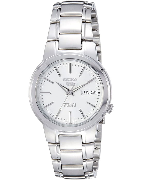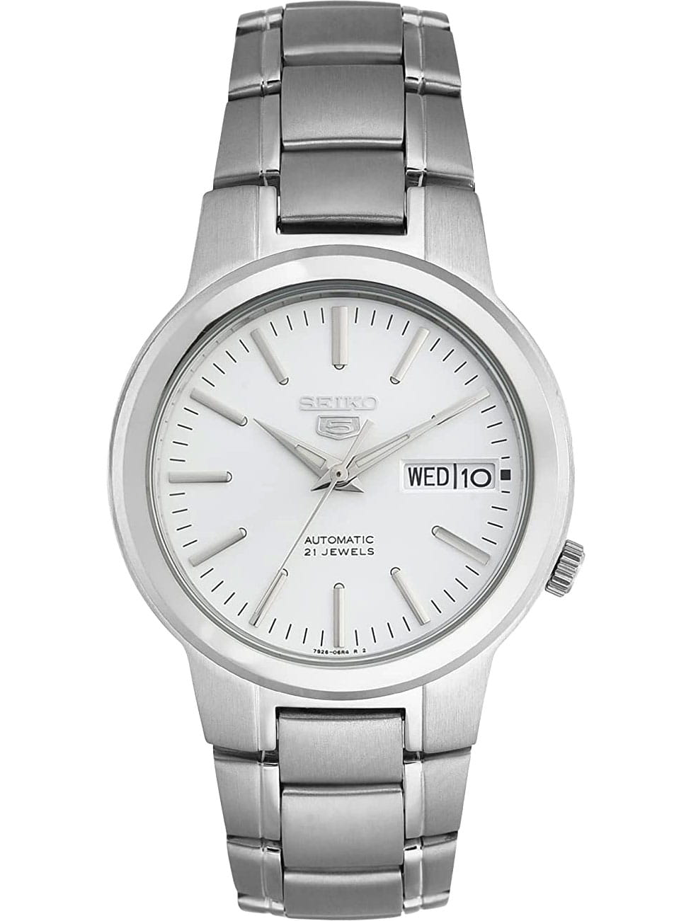 Seiko 5 SNKA01K1 — мужская автоматическая модель из классической линейки Seiko 5 Regular, сочетающая практичность и сдержанный дизайн. Корпус диаметром 37 мм и браслет выполнены из нержавеющей стали, создавая универсальный и надёжный образ. Защитную функцию выполняет минеральное стеклоМинеральное стеклоМинеральное стекло представляет собой искусственно выращенный минерал кварца. Такое стекло отличается особой устойчивостью к повреждениям и царапинам. Уступает по некоторым качествам сапфировому стеклу. Hardlex, устойчивое к повседневным повреждениям. В основе модели лежит автоматический калибр 7S26 с функциями часов, минут, секунд, даты и дня недели. Водозащита составляет 30 м, что защищает часы от брызг и дождя. Циферблат оформлен в лаконичном стиле с арабскими цифрами и стрелками, покрытыми люминесцентным покрытиемЛюминесцентное покрытиеПозволяет считывать показания времени в темноте. Производители наносят на стрелки, часовые индексы, безель или поверхность циферблата светонакопительный состав, дающий холодное свечение. для читаемости в темноте. Браслет из нержавеющей стали оснащён раскладной застёжкойРаскладная застёжкаТакой тип застёжки используется только на браслетах из металла. Она никогда не раскрывается полностью, происходит разделение на 2 и более частей. Раскладывающая застёжка снизит вероятность потери часов к минимуму., обеспечивающей удобство и надёжность при ежедневном использовании.