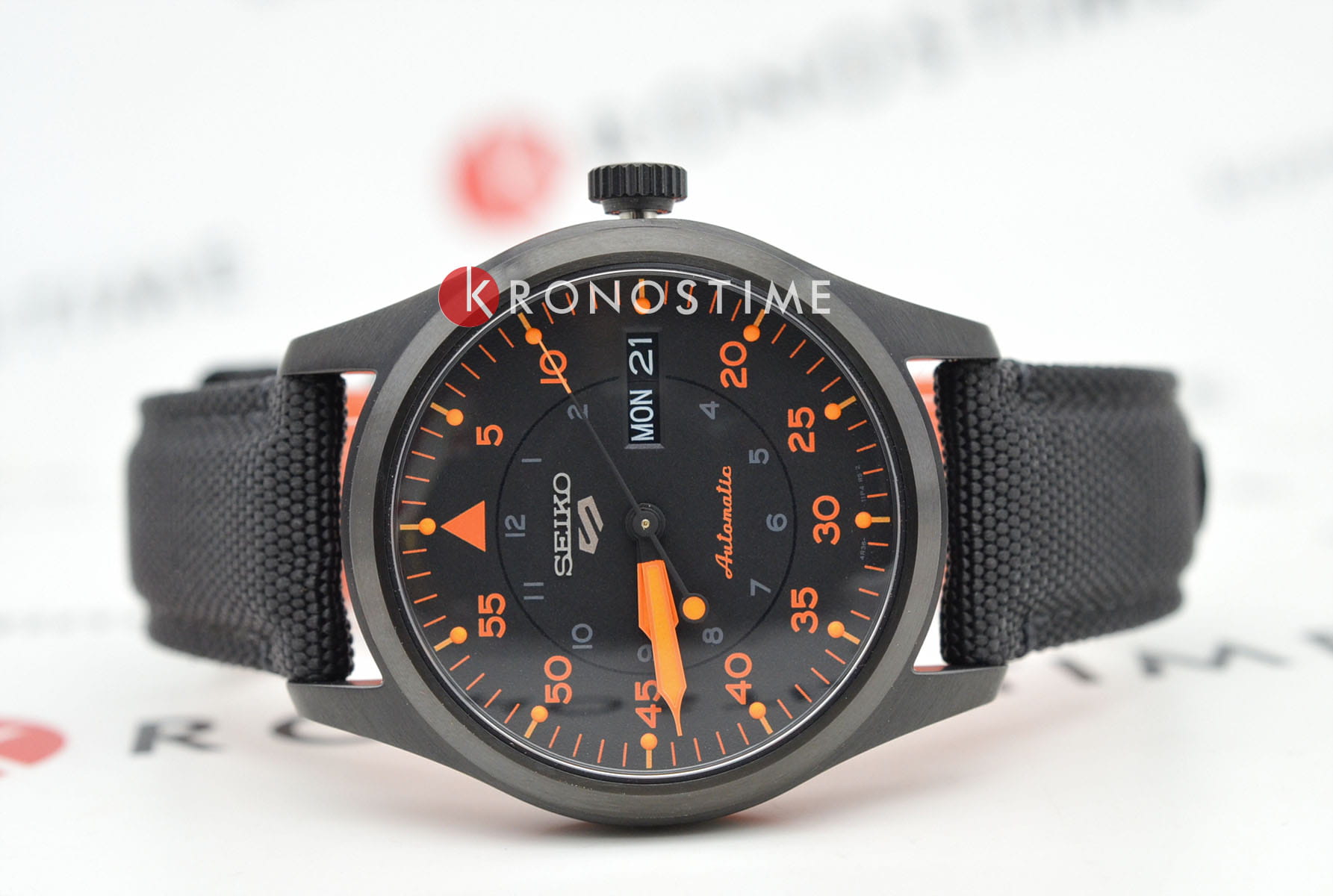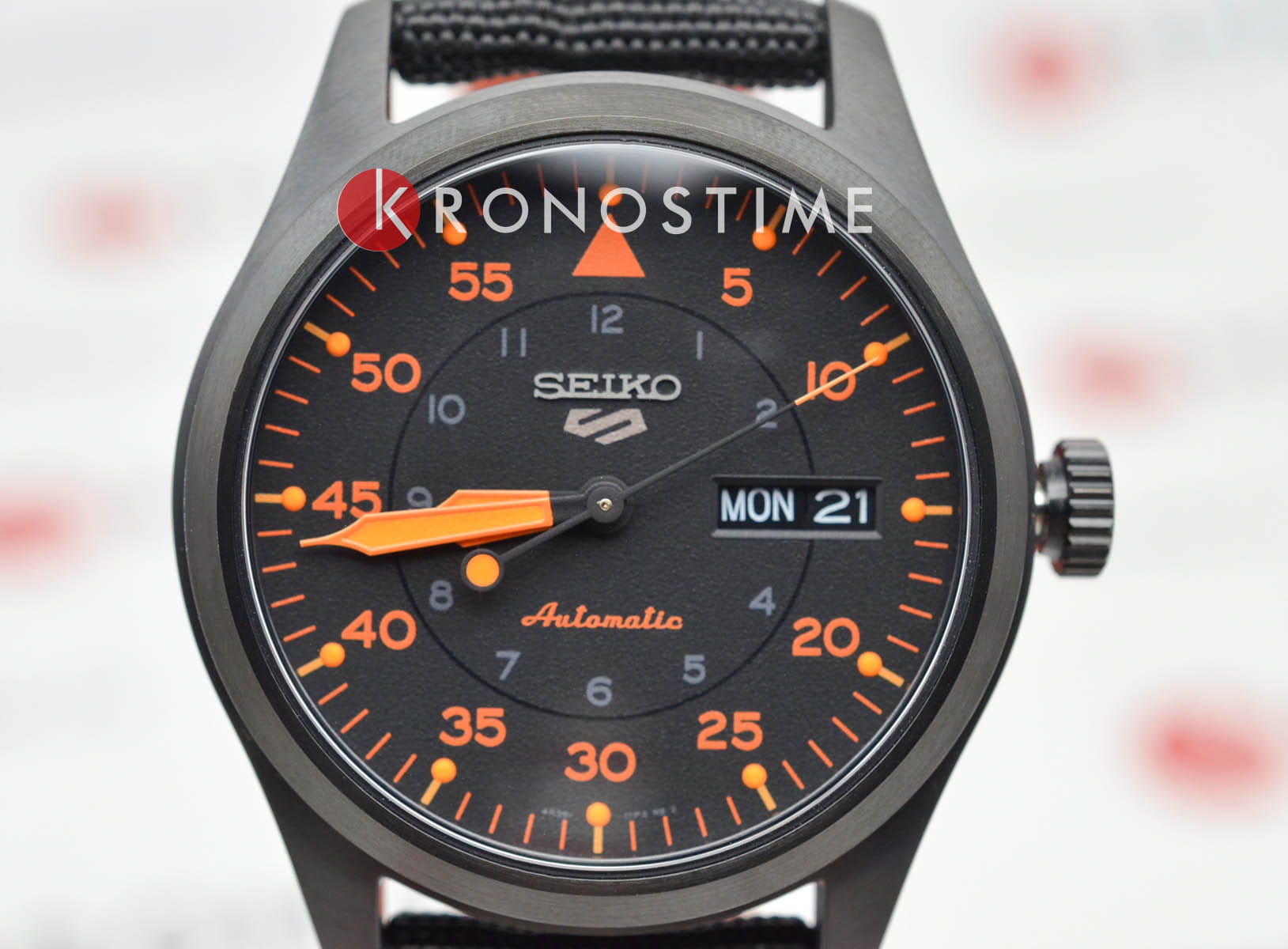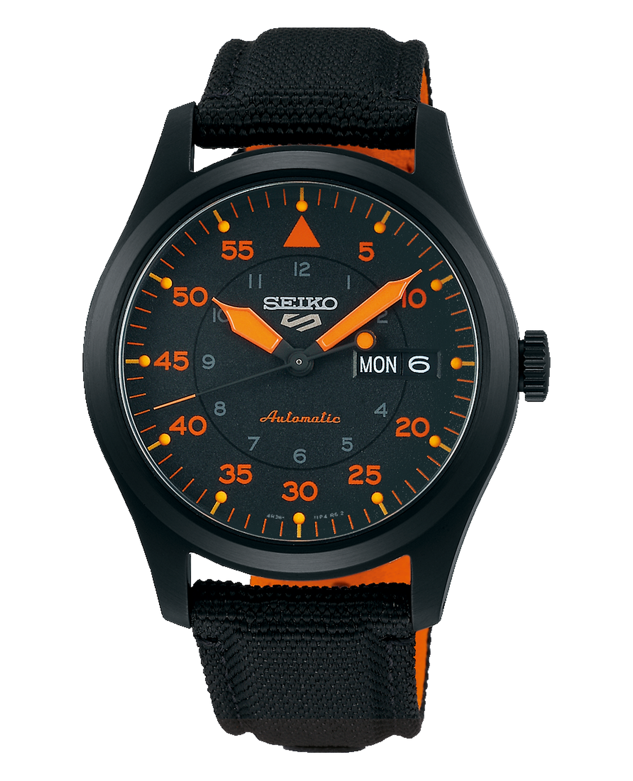 Seiko 5 Sports SRPH33K1 — мужская автоматическая модель из спортивной коллекции Seiko 5, выполненная в стиле авиационных часов. Корпус диаметром 39 мм изготовлен из нержавеющей стали с PVD-покрытиемPVDУльтратонкое покрытие наносится в технике вакуумного напыления, сочетает в себе нитрид титана особой прочности со слоем золота или оксида хрома. Несёт в себе декоративную или защитную функцию. и дополнен текстильным ремешком с классической застёжкой, подчёркивающим универсальность модели. Защитную функцию выполняет минеральное стеклоМинеральное стеклоМинеральное стекло представляет собой искусственно выращенный минерал кварца. Такое стекло отличается особой устойчивостью к повреждениям и царапинам. Уступает по некоторым качествам сапфировому стеклу. Hardlex, устойчивое к механическим повреждениям. В основе лежит надёжный автоматический калибр 4R36 с функциями часов, минут, секунд, даты и дня недели, возможностью ручного завода и стоп-секундой. Водозащита составляет 100 м, что делает модель подходящей для плавания и повседневного использования. Чёрный циферблат с ярко-оранжевыми акцентами оформлен в авиационном стиле: крупные минутные деления по внешней шкале и часовые метки во внутреннем круге. Стрелки и индексы покрыты люминесцентным покрытиемЛюминесцентное покрытиеПозволяет считывать показания времени в темноте. Производители наносят на стрелки, часовые индексы, безель или поверхность циферблата светонакопительный состав, дающий холодное свечение., обеспечивающим отличную читаемость даже в темноте.