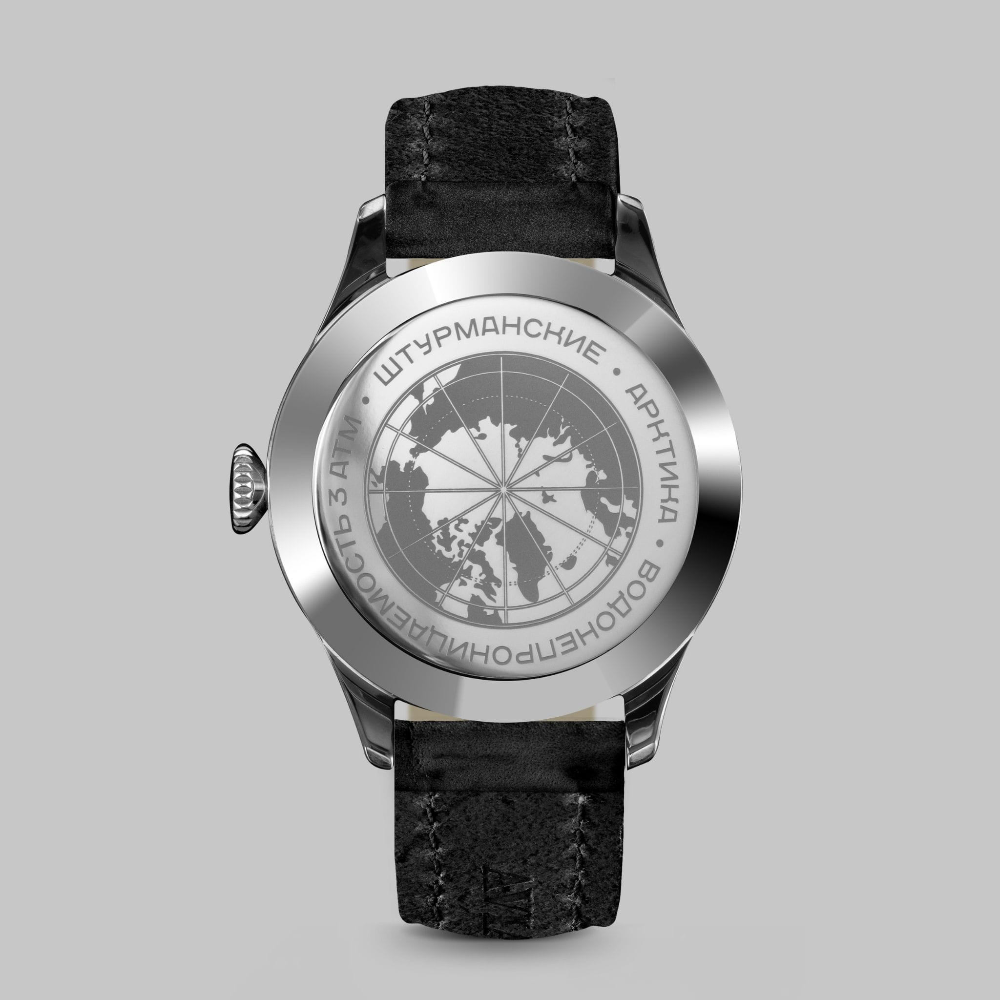 Штурманские мужские российские механические часы с механизмом высокой точности. Класс водозащиты: 30 метров, позволит защитить корпус от случайных брызг или капель дождя. Корпус часов изготовлен из стали. Кожаный ремешок на стандартной застёжке. Стрелки и метки с люминесцентным покрытиемЛюминесцентное покрытиеПозволяет считывать показания времени в темноте. Производители наносят на стрелки, часовые индексы, безель или поверхность циферблата светонакопительный состав, дающий холодное свечение.. Задняя крышка украшена картой Арктики.