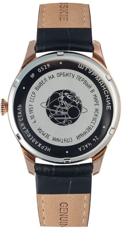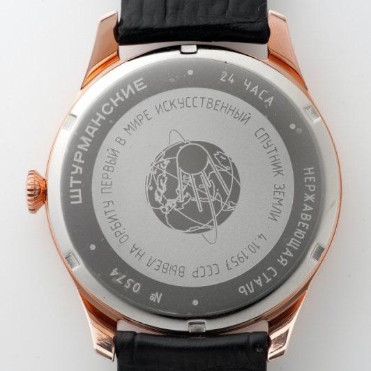 Штурманские мужские российские кварцевые часы с минеральным стекломМинеральное стеклоМинеральное стекло представляет собой искусственно выращенный минерал кварца. Такое стекло отличается особой устойчивостью к повреждениям и царапинам. Уступает по некоторым качествам сапфировому стеклу. Штурманские Наследие Спутник 51524/1079664, кварцевый механизм с высокой точностью. Класс водозащиты: 50 метров, позволит защитить корпус от случайных брызг или капель дождя. Корпус часов изготовлен из стали с PVD-покрытиемPVDУльтратонкое покрытие наносится в технике вакуумного напыления, сочетает в себе нитрид титана особой прочности со слоем золота или оксида хрома. Несёт в себе декоративную или защитную функцию.. Кожаный ремешок на стандартной застёжке. Стрелки и метки с люминесцентным покрытиемЛюминесцентное покрытиеПозволяет считывать показания времени в темноте. Производители наносят на стрелки, часовые индексы, безель или поверхность циферблата светонакопительный состав, дающий холодное свечение.. Индексы стандартной 12-часовой шкалы выполнены в ретро-стиле, светятся в темноте. Вокруг нее расположена вторая шкала – 24-часовая GMT с отдельной стрелкой. Окошко даты находится в положении 3 часа.