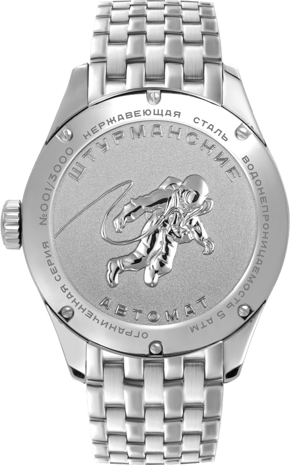 Мужские российские механические часы с минеральным стекломМинеральное стеклоМинеральное стекло представляет собой искусственно выращенный минерал кварца. Такое стекло отличается особой устойчивостью к повреждениям и царапинам. Уступает по некоторым качествам сапфировому стеклу. Штурманские Открытый Космос Day-Date Автомат NH36/1899773, механический механизм (автоматический калибр) с высокой точностью. Лимитированная серия - 3000 экземпляров. Класс водозащиты: 50 метров, позволит защитить корпус от случайных брызг или капель дождя. Корпус часов изготовлен из стали. Стальной браслет на раскладной застёжкеРаскладная застёжкаТакой тип застёжки используется только на браслетах из металла. Она никогда не раскрывается полностью, происходит разделение на 2 и более частей. Раскладывающая застёжка снизит вероятность потери часов к минимуму.. Окошки дня недели и даты находятся в положении 3 часа. Сзади украшены изображением астронавта в открытом космосе по мотивам картины Алексея Леонова. 12-ти и 24-х часовой формат времени. В механизме 24 камня, частота 21600 полуколебаний в час. Запас хода 41 час. Противоударное устройство оси баланса. Автоматический подзавод пружины. Накладные метки в виде штрихов сложной формы. Дата и день недели в накладной рамке с двойным окошком. Рифленая заводная головка. Индивидуальная нумерация.