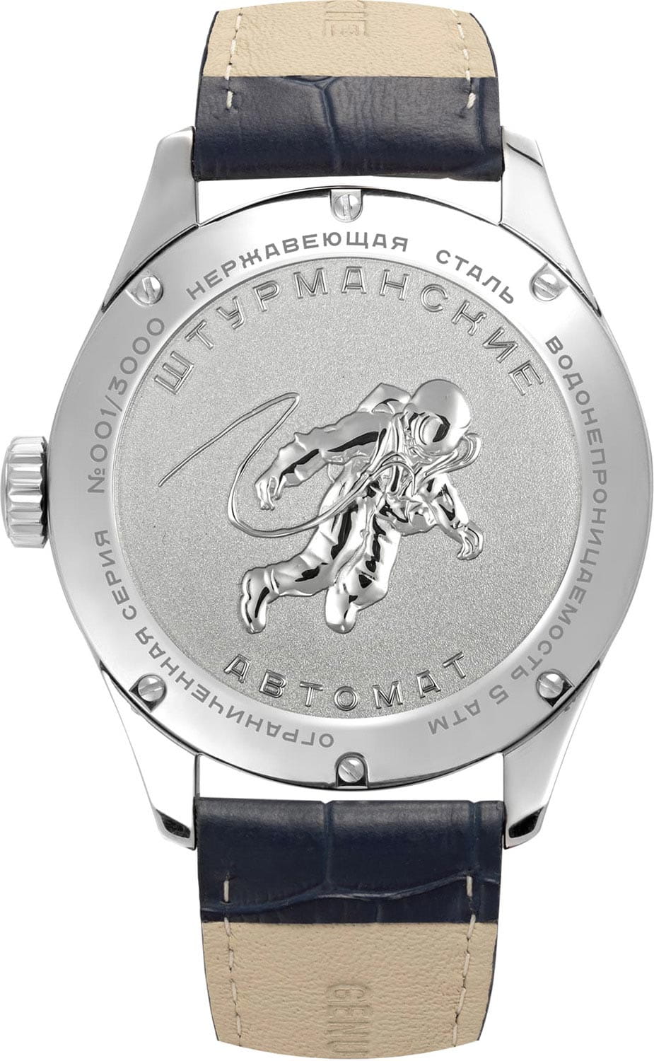 Мужские российские механические часы с минеральным стекломМинеральное стеклоМинеральное стекло представляет собой искусственно выращенный минерал кварца. Такое стекло отличается особой устойчивостью к повреждениям и царапинам. Уступает по некоторым качествам сапфировому стеклу. Штурманские Открытый Космос Day-Date Автомат NH36/1891774, механический механизм (автоматический калибр) с высокой точностью. Лимитированная серия - 3000 экземпляров. Класс водозащиты: 50 метров, позволит защитить корпус от случайных брызг или капель дождя. Корпус часов изготовлен из стали. Кожаный ремешок на стандартной застёжке. Окошки дня недели и даты находятся в положении 3 часа. Сзади украшены изображением астронавта в открытом космосе по мотивам картины Алексея Леонова. 12-ти и 24-х часовой формат времени. В механизме 24 камня, частота 21600 полуколебаний в час. Запас хода 41 час. Противоударное устройство оси баланса. Автоматический подзавод пружины. Накладные метки в виде штрихов сложной формы. Дата и день недели в накладной рамке с двойным окошком. Рифленая заводная головка. Индивидуальная нумерация.