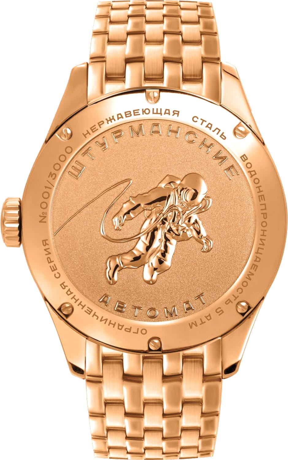Мужские российские механические часы с минеральным стекломМинеральное стеклоМинеральное стекло представляет собой искусственно выращенный минерал кварца. Такое стекло отличается особой устойчивостью к повреждениям и царапинам. Уступает по некоторым качествам сапфировому стеклу. Штурманские Открытый Космос Day-Date Автомат NH36/1899773B, механический механизм (автоматический калибр) с высокой точностью. Лимитированная серия - 3000 экземпляров. Класс водозащиты: 50 метров, позволит защитить корпус от случайных брызг или капель дождя. Корпус часов изготовлен из стали с PVD-покрытиемPVDУльтратонкое покрытие наносится в технике вакуумного напыления, сочетает в себе нитрид титана особой прочности со слоем золота или оксида хрома. Несёт в себе декоративную или защитную функцию.. Стальной браслетс PVD-покрытиемPVDУльтратонкое покрытие наносится в технике вакуумного напыления, сочетает в себе нитрид титана особой прочности со слоем золота или оксида хрома. Несёт в себе декоративную или защитную функцию. на раскладной застёжкеРаскладная застёжкаТакой тип застёжки используется только на браслетах из металла. Она никогда не раскрывается полностью, происходит разделение на 2 и более частей. Раскладывающая застёжка снизит вероятность потери часов к минимуму.. Окошки дня недели и даты находятся в положении 3 часа. Сзади украшены изображением астронавта в открытом космосе по мотивам картины Алексея Леонова. 12-ти и 24-х часовой формат времени. В механизме 24 камня, частота 21600 полуколебаний в час. Запас хода 41 час. Противоударное устройство оси баланса. Автоматический подзавод пружины. Накладные метки в виде штрихов сложной формы. Дата и день недели в накладной рамке с двойным окошком. Рифленая заводная головка. Индивидуальная нумерация.