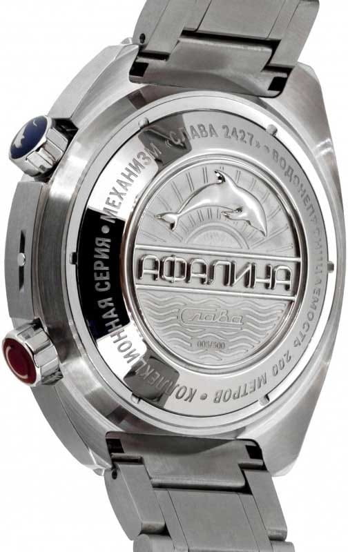 Коллекционные часы Слава Афалина 2430582/100-2427 — это превосходный выбор для тех, кто ценит стиль и функциональность. Модель из лимитированной серии, состоящей всего из 500 экземпляров, отличается прочным стальным корпусом и предназначена для любителей дайвинга. Часы оснащены надежным механическим механизмом с автоподзаводом и водозащитой до 200 метров, что делает их идеальными для подводных приключений. Белый циферблат дополняется стрелками с люминесцентным покрытиемЛюминесцентное покрытиеПозволяет считывать показания времени в темноте. Производители наносят на стрелки, часовые индексы, безель или поверхность циферблата светонакопительный состав, дающий холодное свечение. для отличной видимости в условиях низкой освещенности, а сапфировое стеклоСапфировое стеклоПрочный и надёжный материал из кристалла сапфира синтетического происхождения, характеризующийся особой твёрдостью и устойчивостью к царапинам и повреждениям. с антибликовым покрытиемАнтибликовое покрытиеСлой оксида металла в 0,13-0,3 микрон, благодаря которому стекло часов не бликует и не отражает свет. Антибликовое покрытие уменьшает отражение света в 10 раз, обеспечивая отличную читаемость показателей циферблата. защищает от царапин и бликов. Основная заводная головка расположена на корпусе ближе к отметке ''4 часа'', она позволяет настраивать время и заводить часы перед погружением. С помощью второй головки, расположенной у отметки ''2 часа'', можно управлять вращающимся внутренним кольцом безеляБезельВнешний ободок, закрепляющий стекло. В спортивных часах так называется поворотное кольцо с делениями на циферблате, выполняет роль таймера – замеряет отрезки времени на шкале. Неподвижный безель – элемент декора. Однонаправленно вращающийся безель на дайверских часах позволяет фиксировать моменты погружения и выныривания на поверхность. с PVDPVDУльтратонкое покрытие наносится в технике вакуумного напыления, сочетает в себе нитрид титана особой прочности со слоем золота или оксида хрома. Несёт в себе декоративную или защитную функцию. покрытием белого цвета и фиксировать его в нужном положении. Окошко даты и дня недели удобно расположено на отметке "3 часа", а профессиональная "дайвинг-застежка" стального браслета имеет удлинение для гидрокостюма. Особая забота о природе: часть средств от продажи данной модели перечисляется в центр спасения дельфинов "Дельфа". Часы серии "Афалина" — это не только функциональный аксессуар, но и символ вашей поддержки благородного дела.