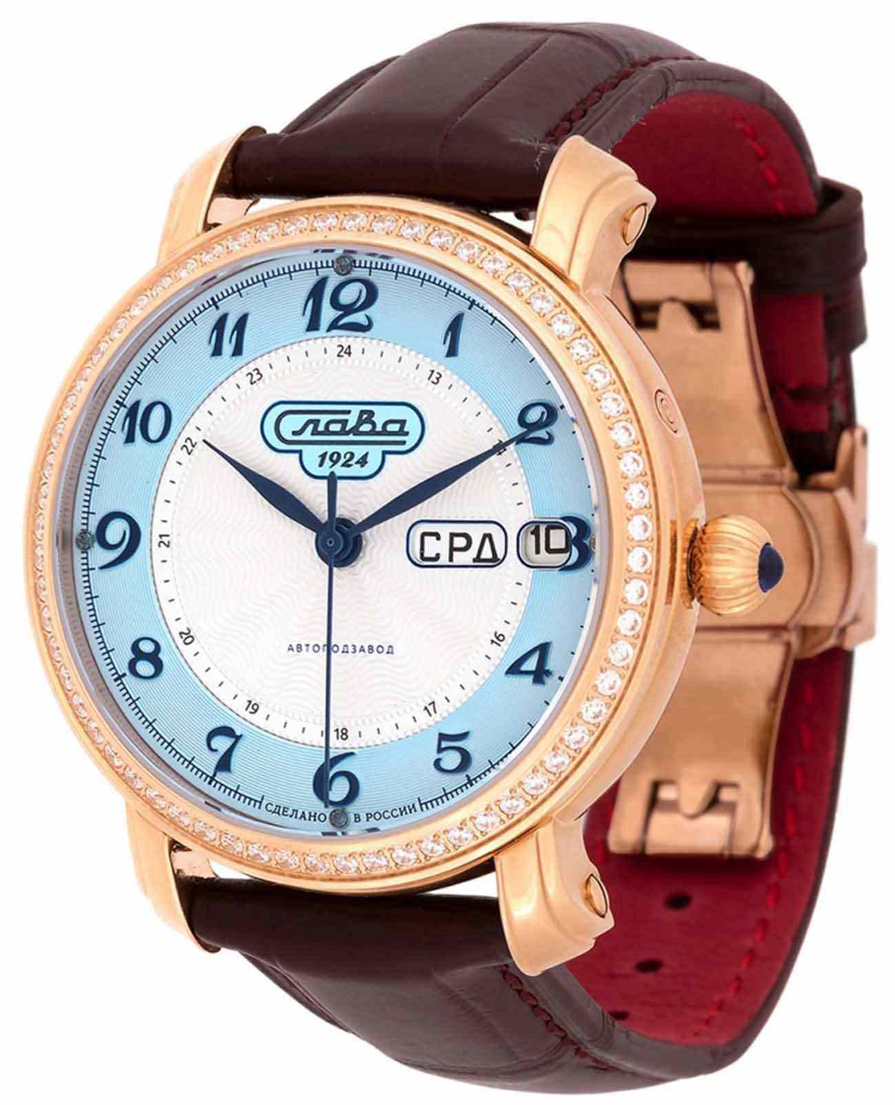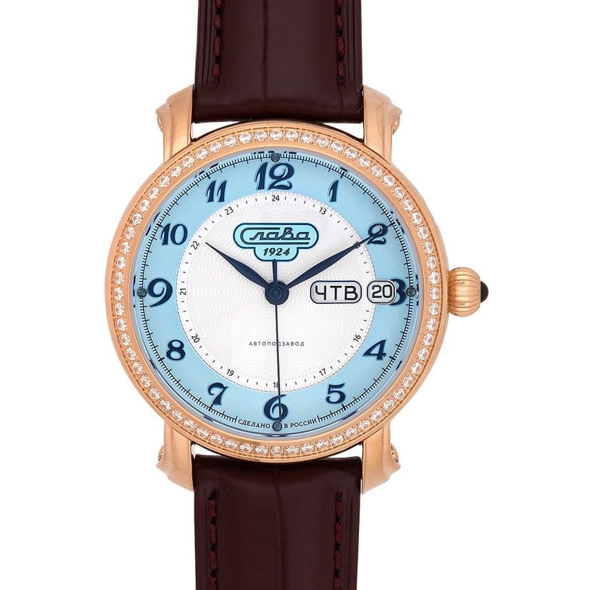 Наручные часы Слава Слава России 7443616/300-2427-68 — воплощение классического стиля и исключительного качества, произведенные в России. Эта модель из лимитированной коллекции станет великолепным дополнением к вашему образу. Часы оснащены надежным механическим механизмом "Слава 2427" с автоподзаводом, обеспечивающим точный ход и оснащены двойным календарем, что позволяет всегда быть в курсе текущей даты. Корпус из нержавеющей стали с золотистым PVDPVDУльтратонкое покрытие наносится в технике вакуумного напыления, сочетает в себе нитрид титана особой прочности со слоем золота или оксида хрома. Несёт в себе декоративную или защитную функцию.-покрытием диаметром 41 мм и толщиной 14,2 мм отличается высокой прочностью и водозащитой до 5 ATM. БезельБезельВнешний ободок, закрепляющий стекло. В спортивных часах так называется поворотное кольцо с делениями на циферблате, выполняет роль таймера – замеряет отрезки времени на шкале. Неподвижный безель – элемент декора. Однонаправленно вращающийся безель на дайверских часах позволяет фиксировать моменты погружения и выныривания на поверхность. часов с вставками из камней циркона. Серебристо-голубой циферблат с арабскими цифрами защищен сапфировым стекломСапфировое стеклоПрочный и надёжный материал из кристалла сапфира синтетического происхождения, характеризующийся особой твёрдостью и устойчивостью к царапинам и повреждениям., устойчивым к царапинам, что позволяет надолго сохранить безупречный вид часов. На 3 часах расположено окошко с указателем даты и дня недели. Кожаный ремень из крокодила с застежкой «бабочка»Застёжка "бабочка"Такой вид застёжки дополняется предохранителями, помогающими избежать случайного раскрытия браслета. Обладают изящным исполнением. добавляет элегантности и комфорта, создавая ощущение роскоши и изысканности. Эта модель станет идеальным выбором для тех, кто ценит традиции и высокое качество в сочетании с современным дизайном.
