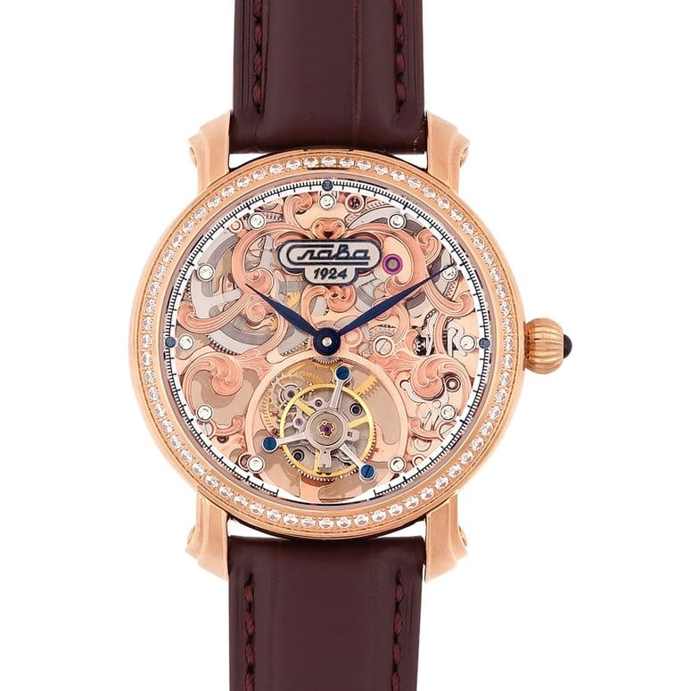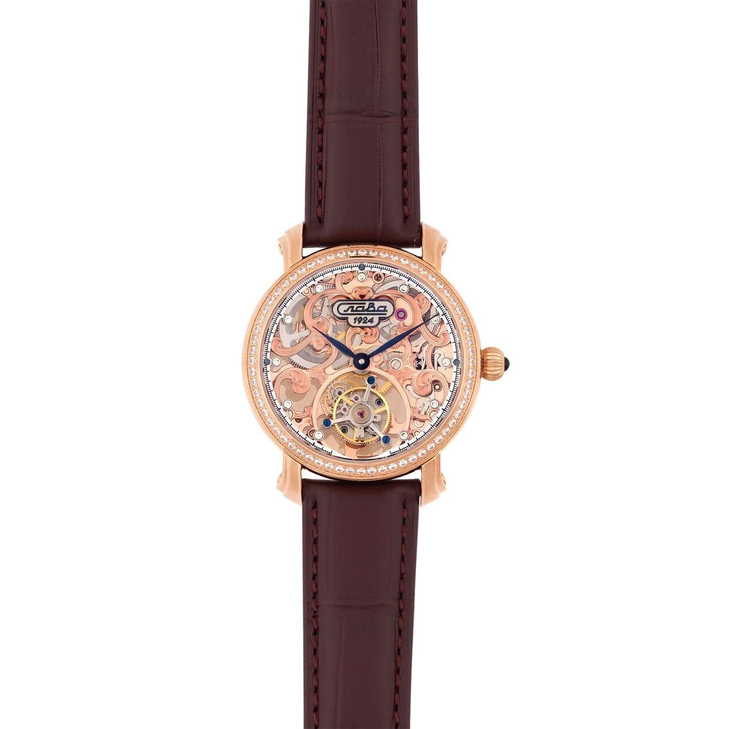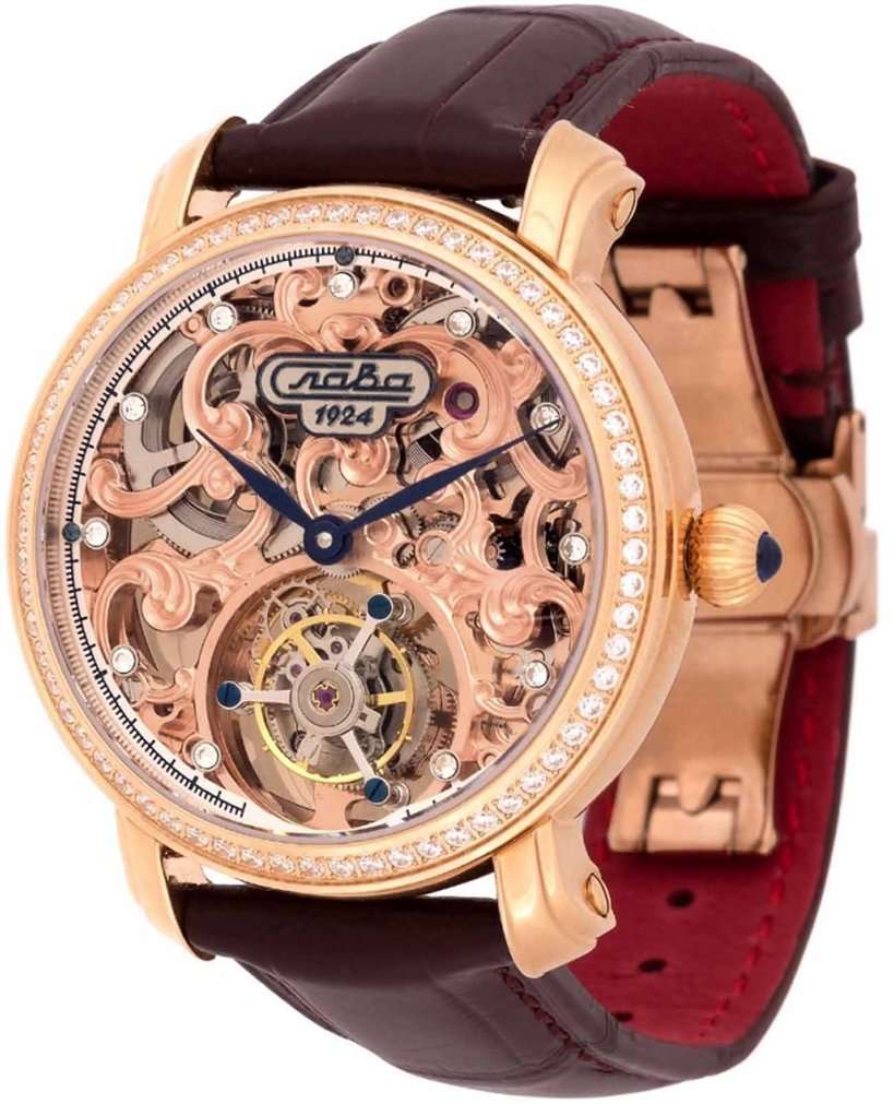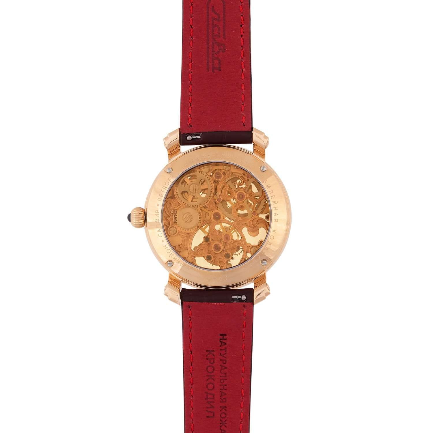 Наручные часы Слава Слава России 7463619/300-3451Р-68 — воплощение классического стиля и исключительного качества, произведенные в России. Эта модель из лимитированной коллекции станет великолепным дополнением к вашему образу. Часы оснащены надежным механическим механизмом Hangzhou SL3451 с автоподзаводом, обеспечивающим точный ход и оснащены скелетоном, позволяющим любоваться механизмом. Корпус из нержавеющей стали с PVDPVDУльтратонкое покрытие наносится в технике вакуумного напыления, сочетает в себе нитрид титана особой прочности со слоем золота или оксида хрома. Несёт в себе декоративную или защитную функцию. покрытием оттенка розового золота диаметром 41 мм и толщиной 14,2 мм отличается высокой прочностью и водозащитой до 5 ATM. БезельБезельВнешний ободок, закрепляющий стекло. В спортивных часах так называется поворотное кольцо с делениями на циферблате, выполняет роль таймера – замеряет отрезки времени на шкале. Неподвижный безель – элемент декора. Однонаправленно вращающийся безель на дайверских часах позволяет фиксировать моменты погружения и выныривания на поверхность. часов с вставками из камней циркона. Золотистый циферблат с открытым механизмом защищен сапфировым стекломСапфировое стеклоПрочный и надёжный материал из кристалла сапфира синтетического происхождения, характеризующийся особой твёрдостью и устойчивостью к царапинам и повреждениям., устойчивым к царапинам, что позволяет надолго сохранить безупречный вид часов. Кожаный ремень из крокодила с застежкой «бабочка»Застёжка "бабочка"Такой вид застёжки дополняется предохранителями, помогающими избежать случайного раскрытия браслета. Обладают изящным исполнением. добавляет элегантности и комфорта, создавая ощущение роскоши и изысканности. Эта модель станет идеальным выбором для тех, кто ценит традиции и высокое качество в сочетании с современным дизайном.