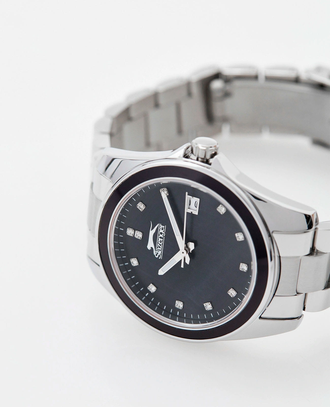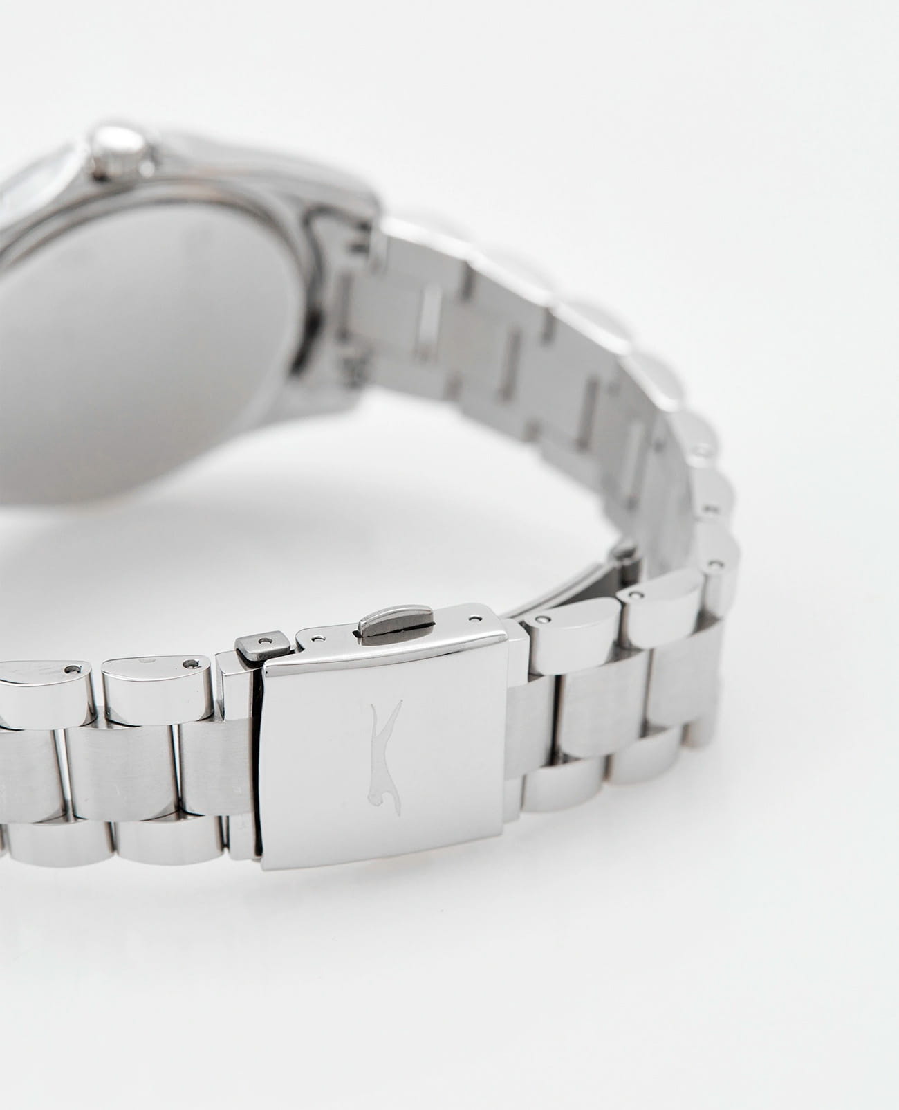 Женские наручные часы Slazenger SL.09.2142.3.01 сочетают в себе элегантный дизайн и надежность современных технологий. Модель обладает круглым корпусом диаметром 37 мм, изготовленным из нержавеющей стали, что обеспечивает высокую устойчивость к внешним воздействиям. Браслет на раскладной застёжкеРаскладная застёжкаТакой тип застёжки используется только на браслетах из металла. Она никогда не раскрывается полностью, происходит разделение на 2 и более частей. Раскладывающая застёжка снизит вероятность потери часов к минимуму., гарантирует комфортное ношение и стильный внешний вид. Циферблат черного цвета декорирован стрелками, которые обеспечивают читаемость времени даже в условиях недостаточной освещенности. Для защиты используется минеральное стеклоМинеральное стеклоМинеральное стекло представляет собой искусственно выращенный минерал кварца. Такое стекло отличается особой устойчивостью к повреждениям и царапинам. Уступает по некоторым качествам сапфировому стеклу., обеспечивающее прочную защиту от царапин. БезельБезельВнешний ободок, закрепляющий стекло. В спортивных часах так называется поворотное кольцо с делениями на циферблате, выполняет роль таймера – замеряет отрезки времени на шкале. Неподвижный безель – элемент декора. Однонаправленно вращающийся безель на дайверских часах позволяет фиксировать моменты погружения и выныривания на поверхность. с IP-покрытиемIP-покрытиеМетод ионного напыления. Демонстрирует повышенную устойчивость к истиранию, окислению и химическим веществам. Под воздействием высокого давления и температуры около 1500°C молекулы металла надёжно соединяются с частицами корпуса часов.. Часы работают на кварцевом механизме, что гарантирует точное время без необходимости подзаводки. Модель также оснащена функцией отображения даты, делая ее практичной для повседневного использования. Водонепроницаемость часов достигает 3 атмосфер, что позволяет использовать их при мытье рук или хождении под мелким дождем, однако не рекомендуется для плавания или других водных видов спорта.