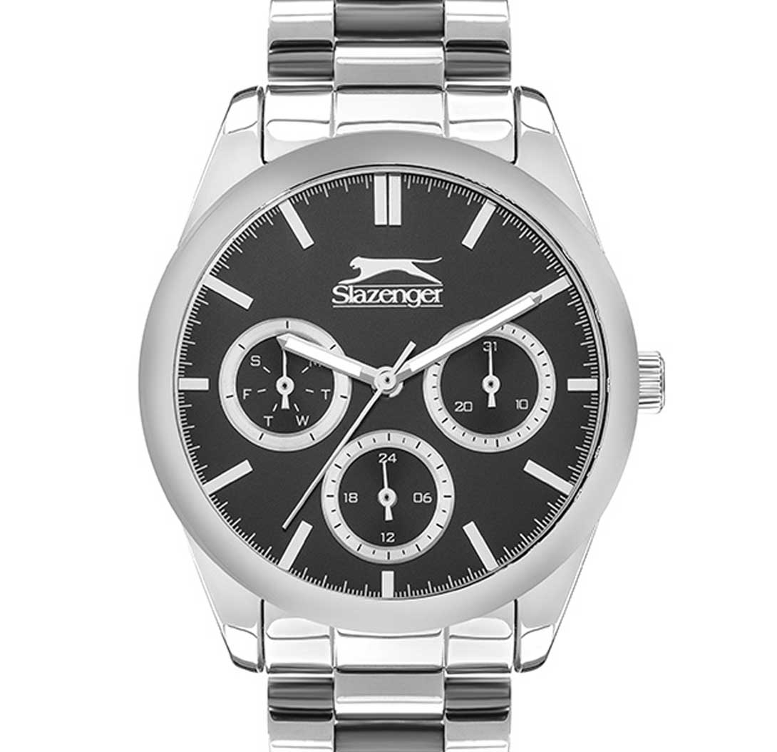 Женские наручные часы Slazenger SL.09.2063.4.01 сочетают в себе классический дизайн и высокое качество исполнения. Модель обладает круглым корпусом диаметром 36 мм, изготовленным из суперметалла с серебристым покрытием, что обеспечивает устойчивость к внешним воздействиям. Браслет выполнен из суперметалла на раскладной застёжкеРаскладная застёжкаТакой тип застёжки используется только на браслетах из металла. Она никогда не раскрывается полностью, происходит разделение на 2 и более частей. Раскладывающая застёжка снизит вероятность потери часов к минимуму.. Черный циферблат украшен логотипом бренда и метками времени. Имеются дополнительные малые циферблаты для отображения даты, дня недели и текущего времени в 24-часовом формате. Для защиты используется минеральное стеклоМинеральное стеклоМинеральное стекло представляет собой искусственно выращенный минерал кварца. Такое стекло отличается особой устойчивостью к повреждениям и царапинам. Уступает по некоторым качествам сапфировому стеклу., обеспечивающее прочную защиту от царапин. Стрелки и метки имеют люминесцентное покрытиеЛюминесцентное покрытиеПозволяет считывать показания времени в темноте. Производители наносят на стрелки, часовые индексы, безель или поверхность циферблата светонакопительный состав, дающий холодное свечение., что позволяет легко читать время в темноте. Часы работают на японском кварцевом механизме, который обеспечивает точность хода без необходимости подзаводки. Водонепроницаемость часов составляет 3 атмосферы (WR30), что позволяет защитить корпус от случайных брызг или капель дождя.