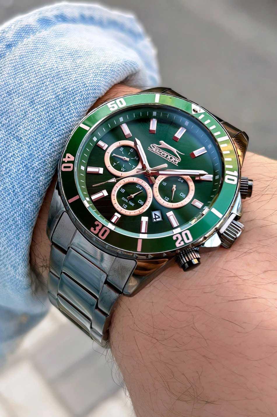 Мужские кварцевые часы Slazenger SL.09.2091.2.03 — это стильный и функциональный аксессуар для тех, кто ценит актуальный дизайн и точность. Корпус круглой формы выполнен из прочного суперметалла с IP-покрытиемIP-покрытиеМетод ионного напыления. Демонстрирует повышенную устойчивость к истиранию, окислению и химическим веществам. Под воздействием высокого давления и температуры около 1500°C молекулы металла надёжно соединяются с частицами корпуса часов. и защищён минеральным стекломМинеральное стеклоМинеральное стекло представляет собой искусственно выращенный минерал кварца. Такое стекло отличается особой устойчивостью к повреждениям и царапинам. Уступает по некоторым качествам сапфировому стеклу.. Циферблат зелёного цвета выполнен по технологии Sunray с эффектом «солнечных лучей», оформлен штриховыми метками и украшен логотипом бренда. Часы отображают основное время в 12- и 24-часовом формате, а также оснащены отдельными циферблатами для индикации второго часового пояса, дня недели и текущего времени в 24-часовом формате. Окошко даты расположено между отметками 4 и 5 часов. Стрелки и метки покрыты люминесцентным покрытиемЛюминесцентное покрытиеПозволяет считывать показания времени в темноте. Производители наносят на стрелки, часовые индексы, безель или поверхность циферблата светонакопительный состав, дающий холодное свечение., обеспечивая хорошую читаемость в темноте. Рифлёная заводная головка с защитой гарантирует надёжность в повседневной эксплуатации. Браслет из суперметалла с IP-покрытиемIP-покрытиеМетод ионного напыления. Демонстрирует повышенную устойчивость к истиранию, окислению и химическим веществам. Под воздействием высокого давления и температуры около 1500°C молекулы металла надёжно соединяются с частицами корпуса часов. фиксируется на раскладной застёжкеРаскладная застёжкаТакой тип застёжки используется только на браслетах из металла. Она никогда не раскрывается полностью, происходит разделение на 2 и более частей. Раскладывающая застёжка снизит вероятность потери часов к минимуму.. Водонепроницаемость 50 м позволяет использовать часы в повседневных условиях, защищая от случайных брызг и капель дождя. Модель сочетает в себе современный дизайн, насыщенную функциональность и надёжность, подчёркивая индивидуальность владельца.