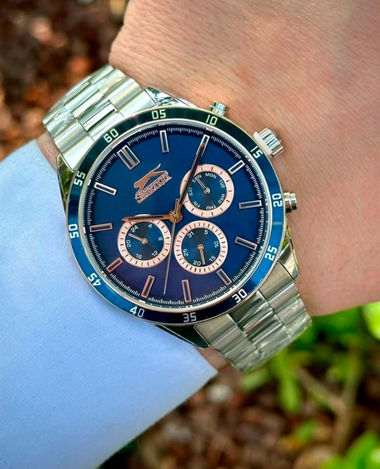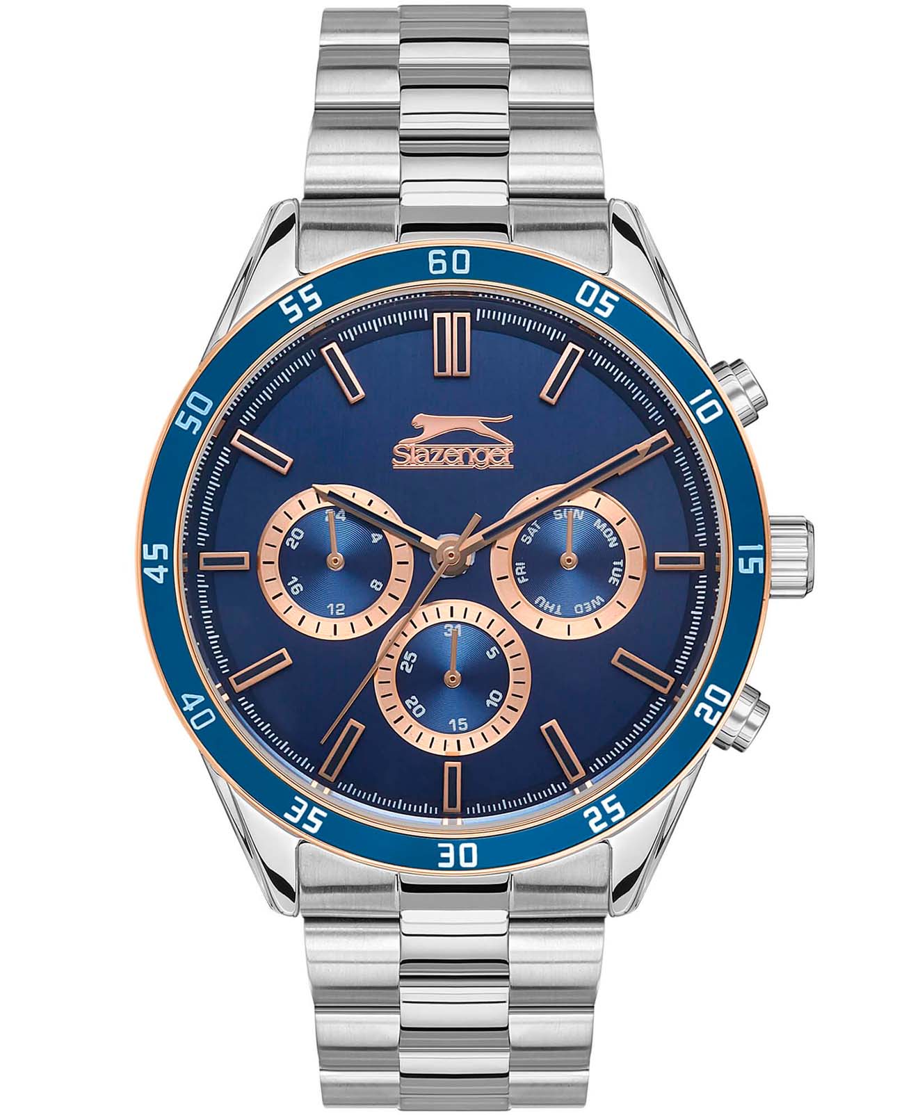 Мужские наручные часы Slazenger SL.09.2109.2.01 сочетают в себе классический дизайн и надежность современных технологий. Модель обладает круглым корпусом диаметром 45 мм, изготовленным из суперметалла, что обеспечивает высокую устойчивость к внешним воздействиям. Браслет выполнен из металла с раскладной застежкойРаскладной замокДанный вариант застежки используется только на часах с металлическим браслетом. Отличительная особенность такого крепления в том, что длина браслета становится универсальной и вы можете самостоятельно отрегулировать нужный вам размер – застежка просто двигается по браслету часов., гарантирующей комфортное ношение и безопасность. Циферблат синего цвета декорирован стрелками с люминесцентным покрытиемЛюминесцентное покрытиеПозволяет считывать показания времени в темноте. Производители наносят на стрелки, часовые индексы, безель или поверхность циферблата светонакопительный состав, дающий холодное свечение., которые обеспечивают читаемость времени даже в условиях недостаточной освещенности. БезельБезельВнешний ободок, закрепляющий стекло. В спортивных часах так называется поворотное кольцо с делениями на циферблате, выполняет роль таймера – замеряет отрезки времени на шкале. Неподвижный безель – элемент декора. Однонаправленно вращающийся безель на дайверских часах позволяет фиксировать моменты погружения и выныривания на поверхность. с IP-покрытиемIP-покрытиеМетод ионного напыления. Демонстрирует повышенную устойчивость к истиранию, окислению и химическим веществам. Под воздействием высокого давления и температуры около 1500°C молекулы металла надёжно соединяются с частицами корпуса часов.. Для защиты используется минеральное стеклоМинеральное стеклоМинеральное стекло представляет собой искусственно выращенный минерал кварца. Такое стекло отличается особой устойчивостью к повреждениям и царапинам. Уступает по некоторым качествам сапфировому стеклу., обеспечивающее прочную защиту от царапин . Часы работают на кварцевом механизме, что гарантирует точное время без необходимости подзаводки. Водонепроницаемость часов достигает 5 атмосфер (WR50), что позволяет использовать их во время плавания, однако они не предназначены для дайвинга или других водных видов спорта. Толщина модели составляет 12 мм.