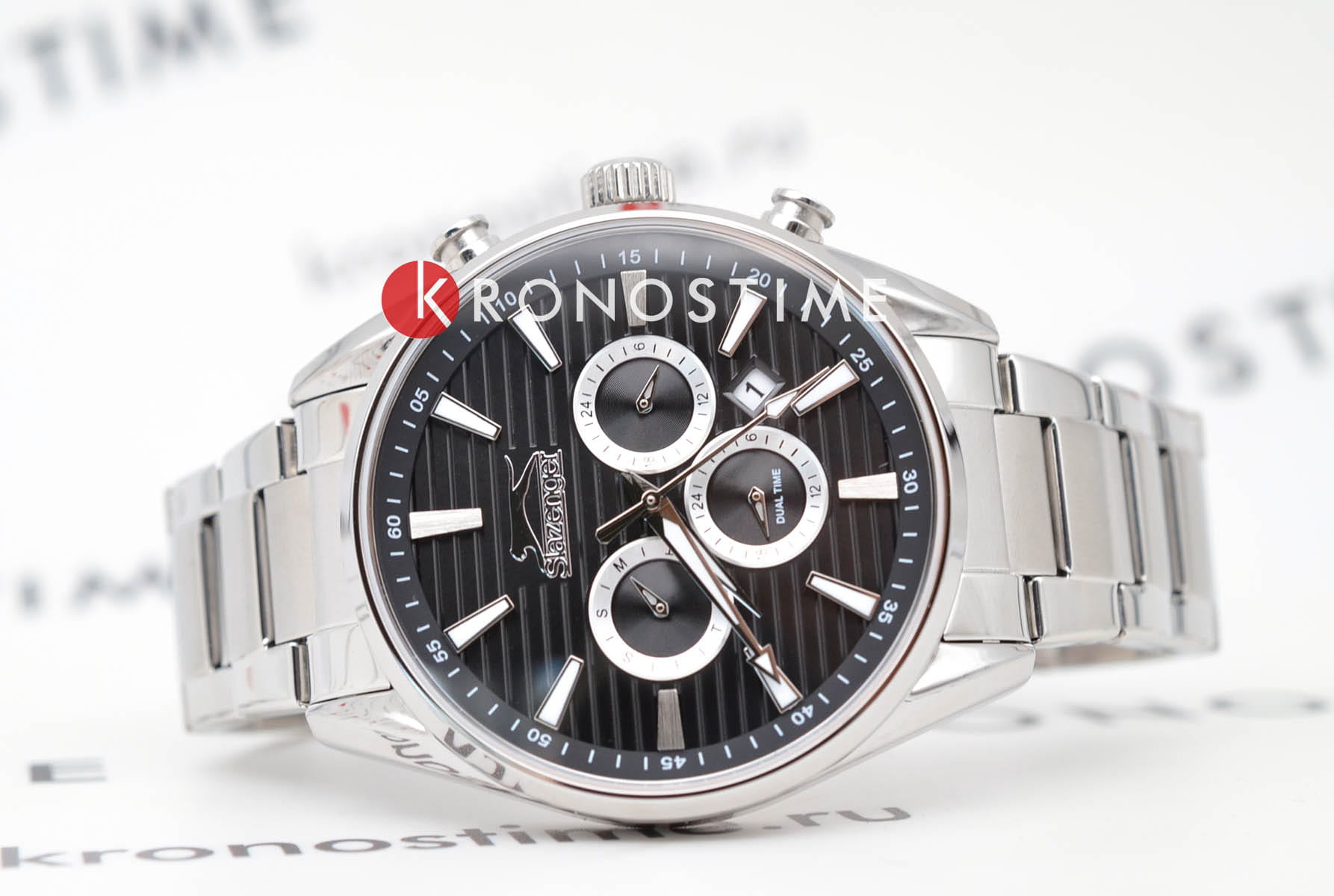 Мужские наручные часы Slazenger SL.09.2111.2.02 сочетают в себе классический дизайн и надежность современных технологий. Модель обладает круглым корпусом диаметром 44 мм, изготовленным из стали, что обеспечивает высокую устойчивость к внешним воздействиям. Браслет выполнен из металла с раскладной застежкойРаскладной замокДанный вариант застежки используется только на часах с металлическим браслетом. Отличительная особенность такого крепления в том, что длина браслета становится универсальной и вы можете самостоятельно отрегулировать нужный вам размер – застежка просто двигается по браслету часов., гарантирующей комфортное ношение и безопасность. Циферблат черного цвета декорирован стрелками с люминесцентным покрытиемЛюминесцентное покрытиеПозволяет считывать показания времени в темноте. Производители наносят на стрелки, часовые индексы, безель или поверхность циферблата светонакопительный состав, дающий холодное свечение., которые обеспечивают читаемость времени даже в условиях недостаточной освещенности. Для защиты используется минеральное стеклоМинеральное стеклоМинеральное стекло представляет собой искусственно выращенный минерал кварца. Такое стекло отличается особой устойчивостью к повреждениям и царапинам. Уступает по некоторым качествам сапфировому стеклу., обеспечивающее прочную защиту от царапин. Часы работают на кварцевом механизме, что гарантирует точное время без необходимости подзаводки. Модель также оснащена дополнительными функциями, такими как второй часовой поясВторой часовой поясФункция, позволяющая отображать время двух часовых поясов одновременно., отображение дня недели и текущего времени в 24-часовом формате, делая ее практичной для повседневного использования и путешествий. Водонепроницаемость часов достигает 5 атмосфер (WR50), что позволяет использовать их во время плавания, однако они не предназначены для дайвинга или других водных видов спорта. Толщина модели составляет 12 мм, а производитель предоставляет гарантию сроком 12 месяцев.