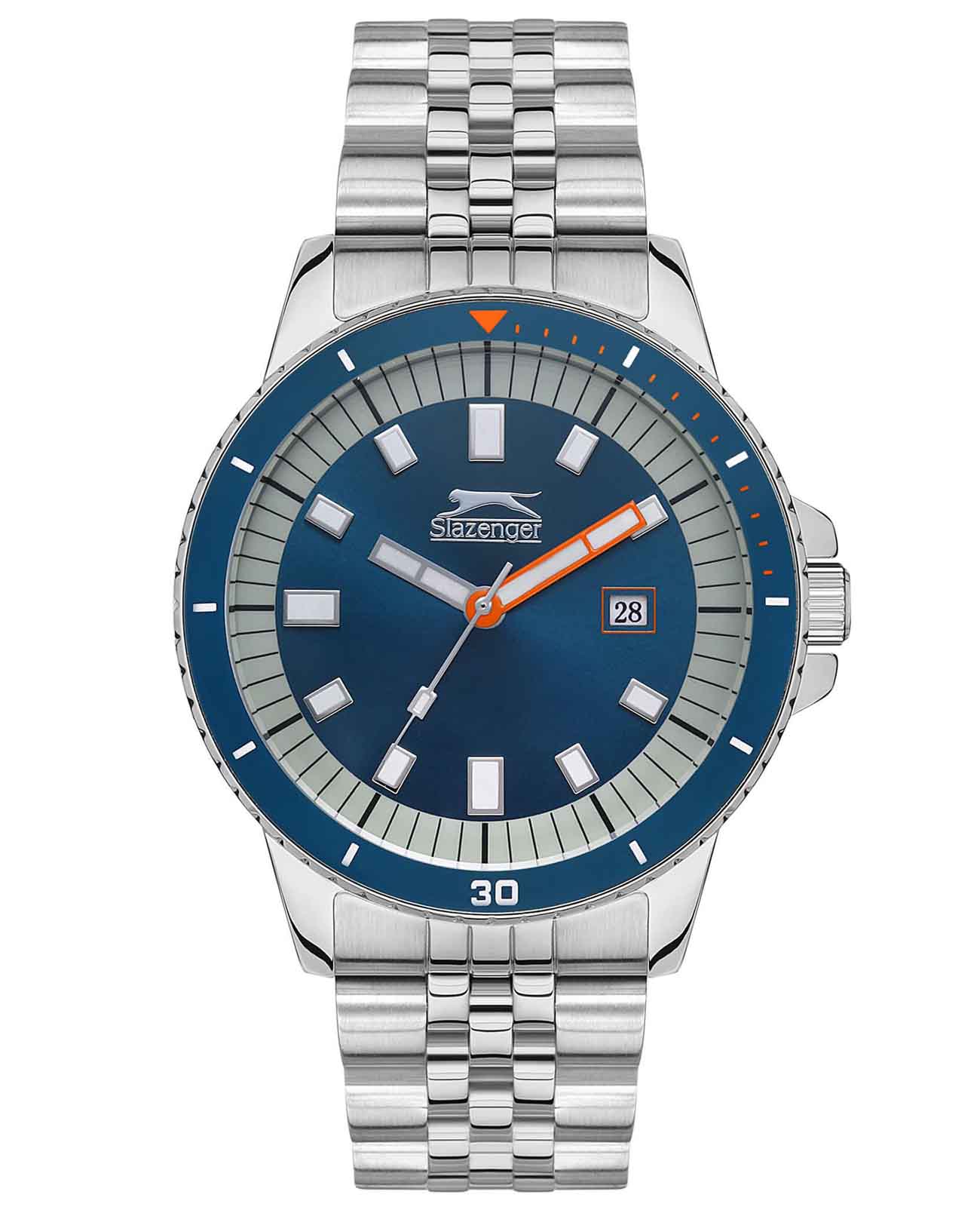 Часы Slazenger SL.09.2135.1.02 воплощают в себе элегантность и практичность, идеально подходящие для современных мужчин. Их синий циферблат, защищенный минеральным стекломМинеральное стеклоМинеральное стекло представляет собой искусственно выращенный минерал кварца. Такое стекло отличается особой устойчивостью к повреждениям и царапинам. Уступает по некоторым качествам сапфировому стеклу., заключен в серебристый корпус диаметром 45 мм, который изготовлен из прочного суперметалла. Неподвижный безельБезельВнешний ободок, закрепляющий стекло. В спортивных часах так называется поворотное кольцо с делениями на циферблате, выполняет роль таймера – замеряет отрезки времени на шкале. Неподвижный безель – элемент декора. Однонаправленно вращающийся безель на дайверских часах позволяет фиксировать моменты погружения и выныривания на поверхность. с IP-покрытиемIP-покрытиеМетод ионного напыления. Демонстрирует повышенную устойчивость к истиранию, окислению и химическим веществам. Под воздействием высокого давления и температуры около 1500°C молекулы металла надёжно соединяются с частицами корпуса часов. синего цвета. Часы оснащены удобным окошком даты и стрелками контрастного цвета. Надежный кварцевый механизм обеспечивает точность, а водозащита 5 ATM делает их устойчивыми к воздействию воды. Стальной браслет из суперметалла имеет раскладную застёжкуРаскладная застёжкаТакой тип застёжки используется только на браслетах из металла. Она никогда не раскрывается полностью, происходит разделение на 2 и более частей. Раскладывающая застёжка снизит вероятность потери часов к минимуму., что подчеркивает современный стиль и позволяет легко снимать часы. Люминесцентное покрытиеЛюминесцентное покрытиеПозволяет считывать показания времени в темноте. Производители наносят на стрелки, часовые индексы, безель или поверхность циферблата светонакопительный состав, дающий холодное свечение. на стрелках и метках обеспечивает отличную видимость в темноте.