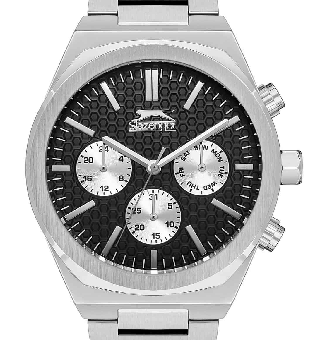 Часы Slazenger SL.09.2137.2.01 воплощают в себе элегантность и практичность, идеально подходящие для современных мужчин. Их черный циферблат с оригинальным рисунком в виде сот, защищен минеральным стекломМинеральное стеклоМинеральное стекло представляет собой искусственно выращенный минерал кварца. Такое стекло отличается особой устойчивостью к повреждениям и царапинам. Уступает по некоторым качествам сапфировому стеклу. и заключен в серебристый корпус диаметром 44 мм, который изготовлен из прочного суперметалла. Часы оснащены двойным форматом времени (12 и 24 часа), указателями дней недели и даты на дополнительных малых циферблатах. Надежный кварцевый механизм обеспечивает точность, а водозащита 5 ATM делает их устойчивыми к воздействию воды. Браслет из суперметалла имеет раскладную застёжкуРаскладная застёжкаТакой тип застёжки используется только на браслетах из металла. Она никогда не раскрывается полностью, происходит разделение на 2 и более частей. Раскладывающая застёжка снизит вероятность потери часов к минимуму., что подчеркивает современный стиль и позволяет легко снимать часы. Размер браслета (H1-H2): 24-20 мм.
