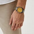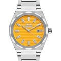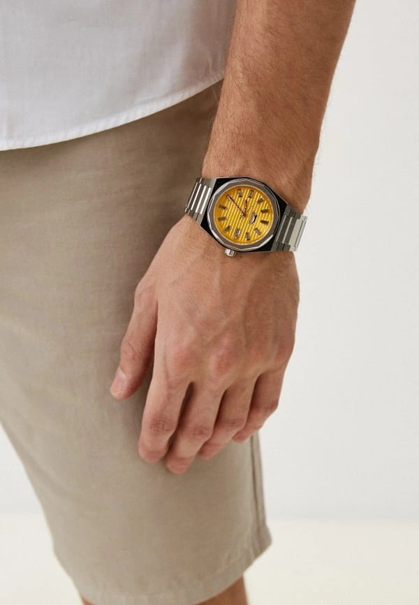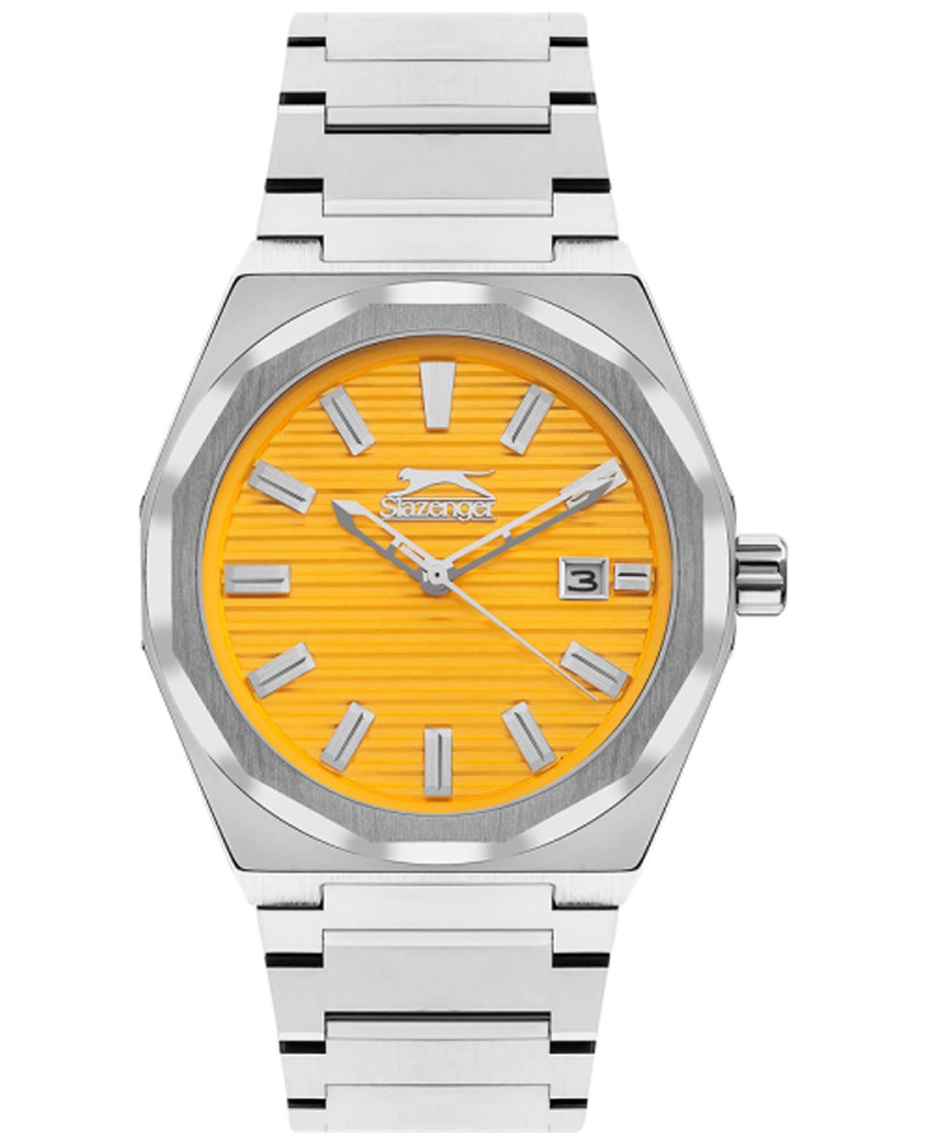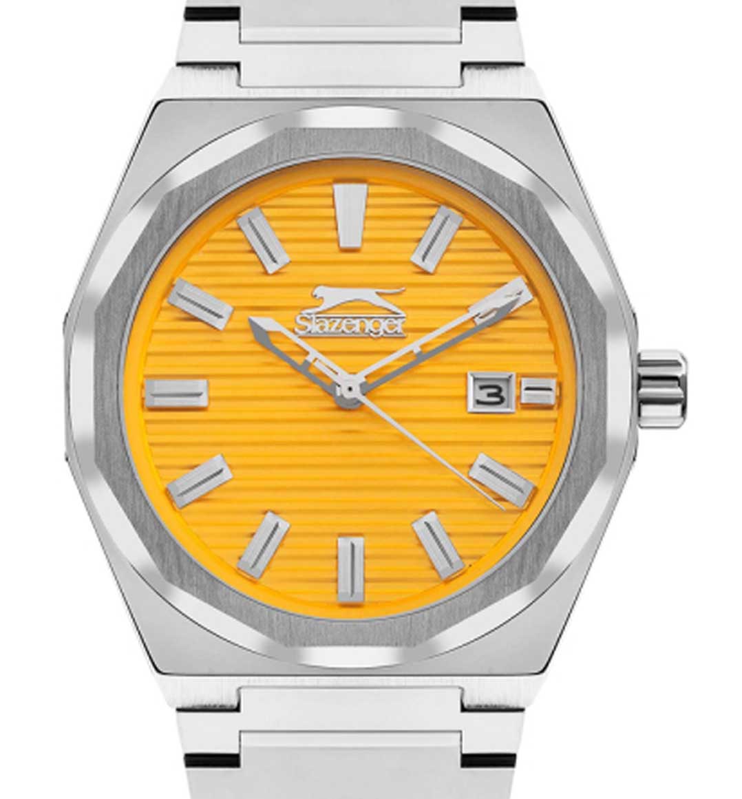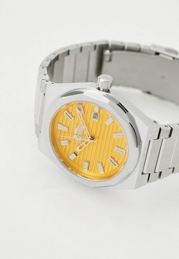 Часы Slazenger SL.09.2143.1.06 воплощают в себе элегантность и практичность, идеально подходящие для современных мужчин. Их желтый циферблат защищен минеральным стекломМинеральное стеклоМинеральное стекло представляет собой искусственно выращенный минерал кварца. Такое стекло отличается особой устойчивостью к повреждениям и царапинам. Уступает по некоторым качествам сапфировому стеклу. и заключен в серебристый корпус диаметром 41,5 мм, который изготовлен из прочного суперметалла. Окошко даты расположено в положении 3 часов. Надежный кварцевый механизм обеспечивает точность, а водозащита 5 ATM делает их устойчивыми к воздействию воды. Браслет из суперметалла имеет раскладную застёжкуРаскладная застёжкаТакой тип застёжки используется только на браслетах из металла. Она никогда не раскрывается полностью, происходит разделение на 2 и более частей. Раскладывающая застёжка снизит вероятность потери часов к минимуму., что подчеркивает современный стиль и позволяет легко снимать часы. Ширина браслета 22-26 мм.