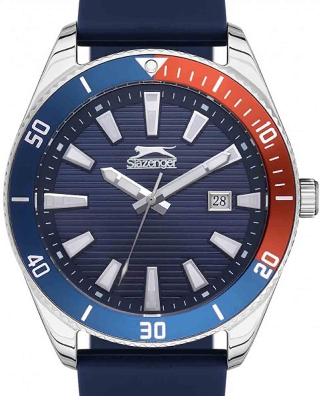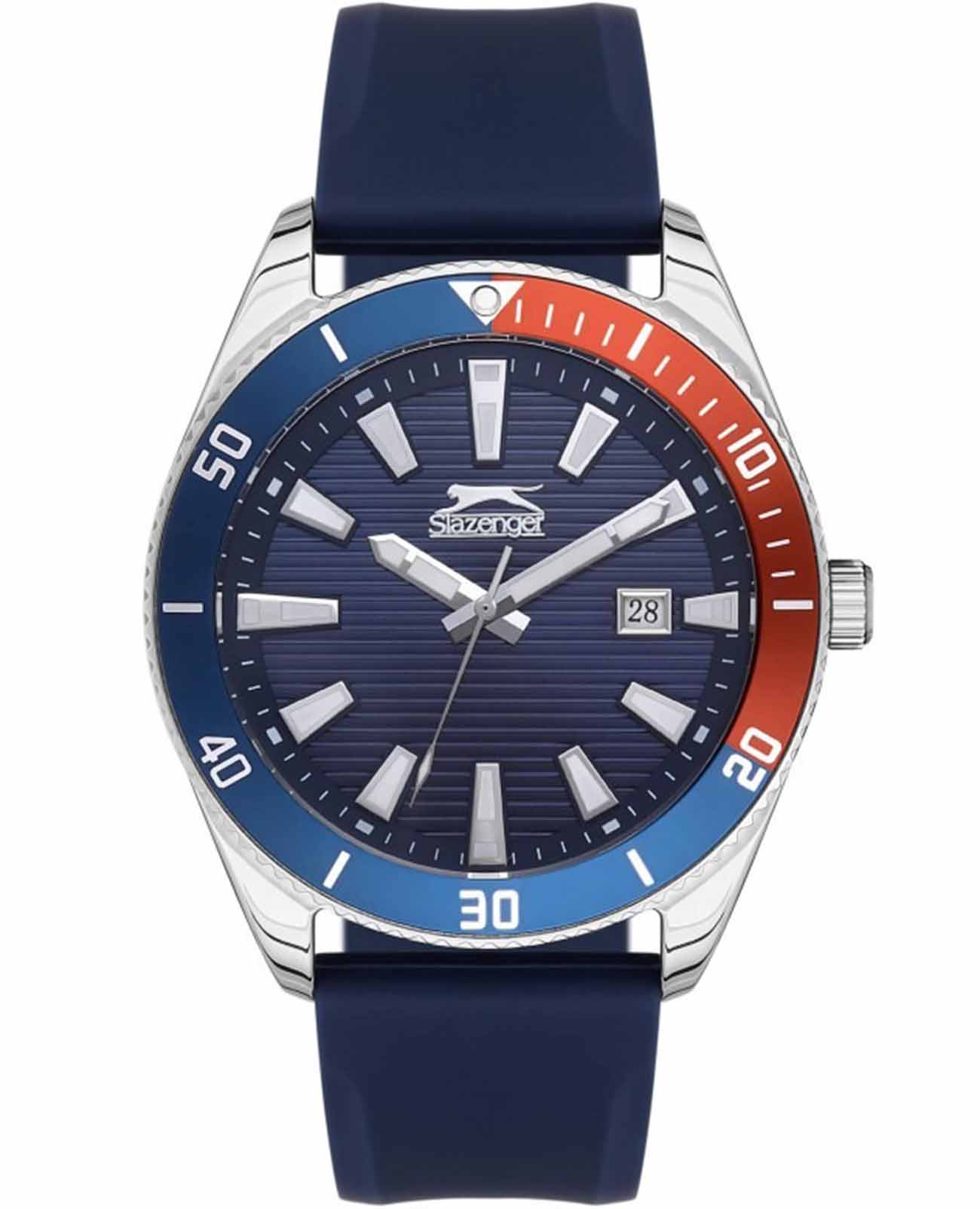 Мужские наручные часы Slazenger SL.09.2174.2.02 — стильный аксессуар с ярко выраженными спортивными чертами, который станет надежным спутником в повседневной жизни. Эти часы оснащены кварцевым механизмом, обеспечивающим высокую точность хода. Металлический корпус в сочетании с синим силиконовый ремешком на классической застежке шириной 22 мм создает гармоничный и современный образ. Диаметр корпуса составляет 44 мм, а толщина — 14 мм, что придает часам стильный и выразительный вид. Вращающийся безельБезельВнешний ободок, закрепляющий стекло. В спортивных часах так называется поворотное кольцо с делениями на циферблате, выполняет роль таймера – замеряет отрезки времени на шкале. Неподвижный безель – элемент декора. Однонаправленно вращающийся безель на дайверских часах позволяет фиксировать моменты погружения и выныривания на поверхность. с синим и красным IP-покрытиемIP-покрытиеМетод ионного напыления. Демонстрирует повышенную устойчивость к истиранию, окислению и химическим веществам. Под воздействием высокого давления и температуры около 1500°C молекулы металла надёжно соединяются с частицами корпуса часов., что придает ему дополнительную прочность и устойчивость к износу. Минеральное стеклоМинеральное стеклоМинеральное стекло представляет собой искусственно выращенный минерал кварца. Такое стекло отличается особой устойчивостью к повреждениям и царапинам. Уступает по некоторым качествам сапфировому стеклу. защищает циферблат от царапин и внешних воздействий, а водозащита уровня WR 50 позволяет не беспокоиться о случайных контактах с водой, будь то дождь или мытье рук. Часы также оснащены функцией отображения даты в отдельном окошке, что добавляет удобства в ежедневном использовании. Люминесцентное покрытиеЛюминесцентное покрытиеПозволяет считывать показания времени в темноте. Производители наносят на стрелки, часовые индексы, безель или поверхность циферблата светонакопительный состав, дающий холодное свечение. на стрелках и метках обеспечивает отличную видимость в темноте.