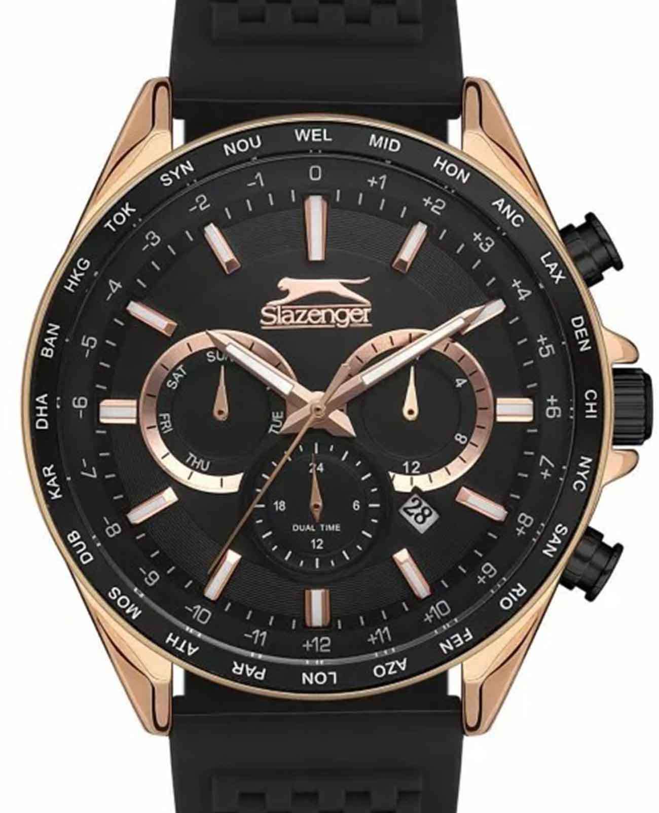 Мужские наручные часы Slazenger SL.09.2179.2.02 — стильный аксессуар с ярко выраженными спортивными чертами, который станет надежным спутником в повседневной жизни. Эти часы оснащены кварцевым механизмом, обеспечивающим высокую точность хода. Металлический корпус с золотистым IP-покрытиемIP-покрытиеМетод ионного напыления. Демонстрирует повышенную устойчивость к истиранию, окислению и химическим веществам. Под воздействием высокого давления и температуры около 1500°C молекулы металла надёжно соединяются с частицами корпуса часов. в сочетании с черным силиконовый ремешком на классической застежке шириной 22 мм создает гармоничный и современный образ. Диаметр корпуса составляет 45 мм, а толщина — 11 мм, что придает часам стильный и выразительный вид. БезельБезельВнешний ободок, закрепляющий стекло. В спортивных часах так называется поворотное кольцо с делениями на циферблате, выполняет роль таймера – замеряет отрезки времени на шкале. Неподвижный безель – элемент декора. Однонаправленно вращающийся безель на дайверских часах позволяет фиксировать моменты погружения и выныривания на поверхность. с черным IP-покрытиемIP-покрытиеМетод ионного напыления. Демонстрирует повышенную устойчивость к истиранию, окислению и химическим веществам. Под воздействием высокого давления и температуры около 1500°C молекулы металла надёжно соединяются с частицами корпуса часов., что придает ему дополнительную прочность и устойчивость к износу. Минеральное стеклоМинеральное стеклоМинеральное стекло представляет собой искусственно выращенный минерал кварца. Такое стекло отличается особой устойчивостью к повреждениям и царапинам. Уступает по некоторым качествам сапфировому стеклу. защищает циферблат от царапин и внешних воздействий, а водозащита уровня WR 50 позволяет не беспокоиться о случайных контактах с водой, будь то дождь или мытье рук. Особенностью данной модели является наличие календаря, отображающего дату и день недели, а также возможность следить за временем во втором часовом поясе. Люминесцентное покрытиеЛюминесцентное покрытиеПозволяет считывать показания времени в темноте. Производители наносят на стрелки, часовые индексы, безель или поверхность циферблата светонакопительный состав, дающий холодное свечение. на стрелках и метках обеспечивает отличную видимость в темноте.
