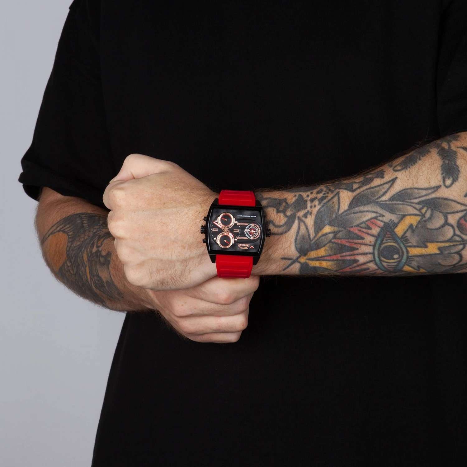 Часы Slazenger SL.09.2208.2.04 — это стильный и функциональный аксессуар для мужчин, созданный британским брендом, известным своим качеством и надежностью. Эти кварцевые часы отличаются современным дизайном и высоким уровнем функциональности. Металлический корпус с серым IP-покрытиемIP-покрытиеМетод ионного напыления. Демонстрирует повышенную устойчивость к истиранию, окислению и химическим веществам. Под воздействием высокого давления и температуры около 1500°C молекулы металла надёжно соединяются с частицами корпуса часов. обеспечивает прочность и долговечность, а минеральное стеклоМинеральное стеклоМинеральное стекло представляет собой искусственно выращенный минерал кварца. Такое стекло отличается особой устойчивостью к повреждениям и царапинам. Уступает по некоторым качествам сапфировому стеклу.  защищает циферблат от царапин и повреждений. Благодаря водозащите уровня WR 50, часы могут выдерживать случайные контакты с водой, такие как дождь или брызги. Часы снабжены резиновым ремешком красного цвета, который не только обеспечивает удобство и комфорт в ношении, но и придает им стильный и спортивный вид. Классическая застежка ремешка позволяет легко и надежно фиксировать часы на запястье. Размеры корпуса составляют 49 мм в ширину, 41,5 мм в высоту и 14 мм в толщину, что делает их заметным и выразительным аксессуаром на руке. Люминесцентное покрытиеЛюминесцентное покрытиеПозволяет считывать показания времени в темноте. Производители наносят на стрелки, часовые индексы, безель или поверхность циферблата светонакопительный состав, дающий холодное свечение. на стрелках и метках обеспечивает отличную видимость в темноте. Часы также оснащены функциями отображения второго часового поясаВторой часовой поясФункция, позволяющая отображать время двух часовых поясов одновременно., даты и дня недели, что делает их идеальным выбором для деловых поездок и путешествий.