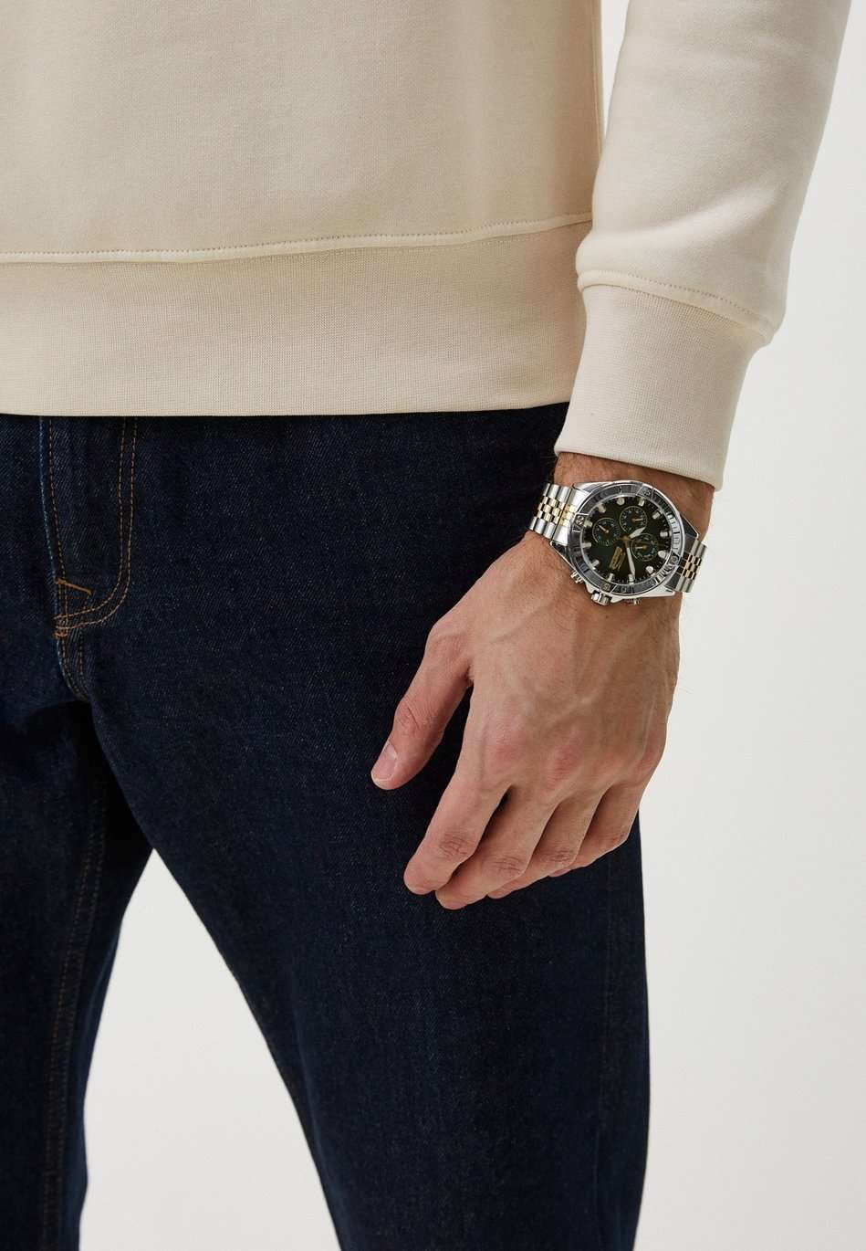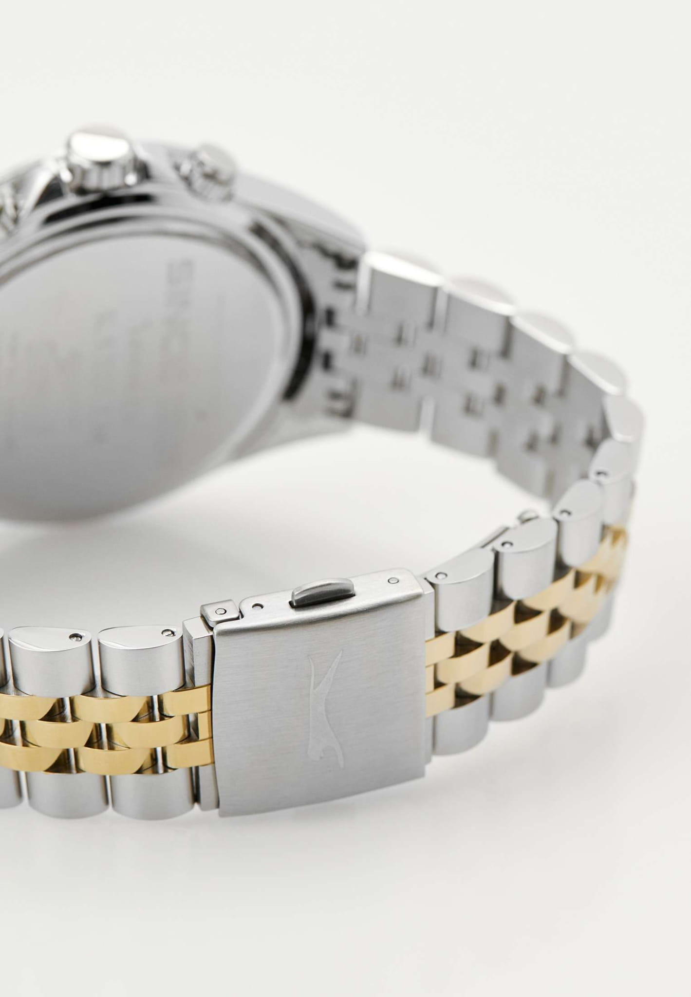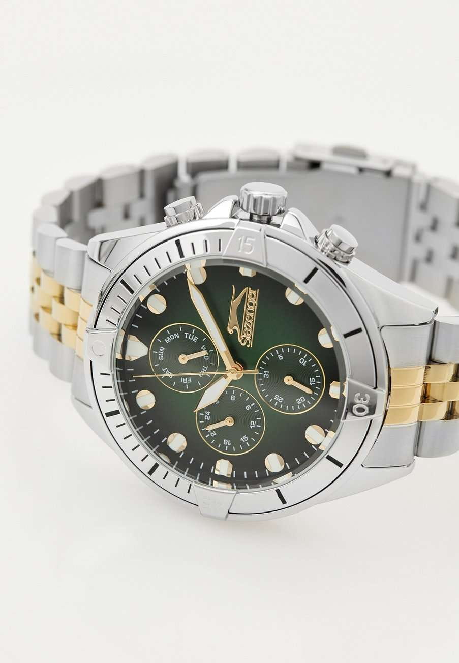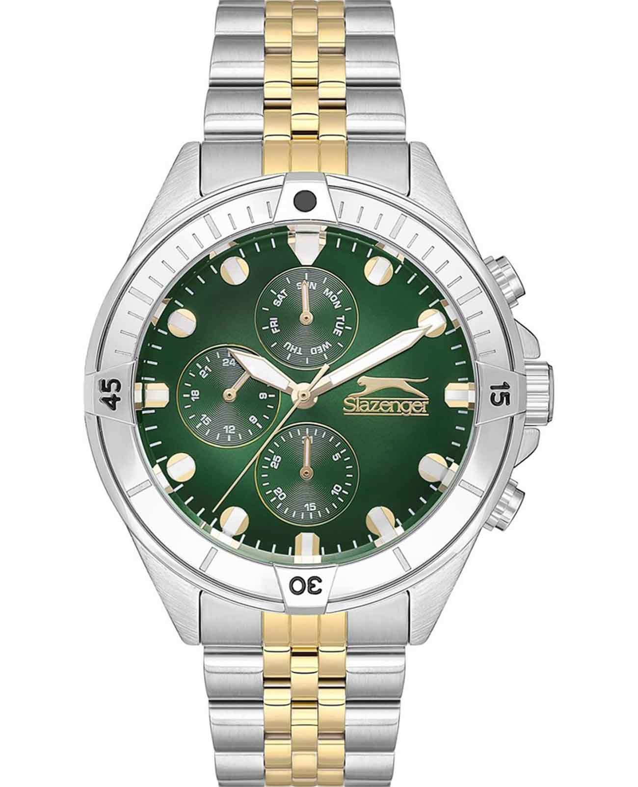 Часы Slazenger SL.09.2227.2.04 — это стильная и функциональная модель, созданная для современных мужчин, ценящих качество и надежность. Корпус из прочного металла и безельБезельВнешний ободок, закрепляющий стекло. В спортивных часах так называется поворотное кольцо с делениями на циферблате, выполняет роль таймера – замеряет отрезки времени на шкале. Неподвижный безель – элемент декора. Однонаправленно вращающийся безель на дайверских часах позволяет фиксировать моменты погружения и выныривания на поверхность. диаметром 46 мм и толщиной 12 мм придаёт часам солидный вид, а серебристый металлический браслет с частичным золотистым IP-покрытиемIP-покрытиеМетод ионного напыления. Демонстрирует повышенную устойчивость к истиранию, окислению и химическим веществам. Под воздействием высокого давления и температуры около 1500°C молекулы металла надёжно соединяются с частицами корпуса часов. с раскладной застёжкойРаскладная застёжкаТакой тип застёжки используется только на браслетах из металла. Она никогда не раскрывается полностью, происходит разделение на 2 и более частей. Раскладывающая застёжка снизит вероятность потери часов к минимуму. обеспечивает удобство при ношении. Надежный кварцевый механизм гарантирует точность хода, а минеральное стеклоМинеральное стеклоМинеральное стекло представляет собой искусственно выращенный минерал кварца. Такое стекло отличается особой устойчивостью к повреждениям и царапинам. Уступает по некоторым качествам сапфировому стеклу. защищает градиентный зеленый циферблат от царапин. Модель оснащена дополнительными малыми циферблатами, отображающими дату, день недели и текущее время в 24-часовом формате, что делает часы особенно практичными. Для удобства использования в темное время суток предусмотрено люминесцентное покрытиеЛюминесцентное покрытиеПозволяет считывать показания времени в темноте. Производители наносят на стрелки, часовые индексы, безель или поверхность циферблата светонакопительный состав, дающий холодное свечение. стрелок. Заводная головка имеет специальную защиту. Водозащита уровня WR 50 позволяет не беспокоиться о случайном попадании воды. Вес изделия составляет 161 грамм. Эти часы станут отличным выбором для тех, кто ценит элегантность и функциональность в одном аксессуаре.