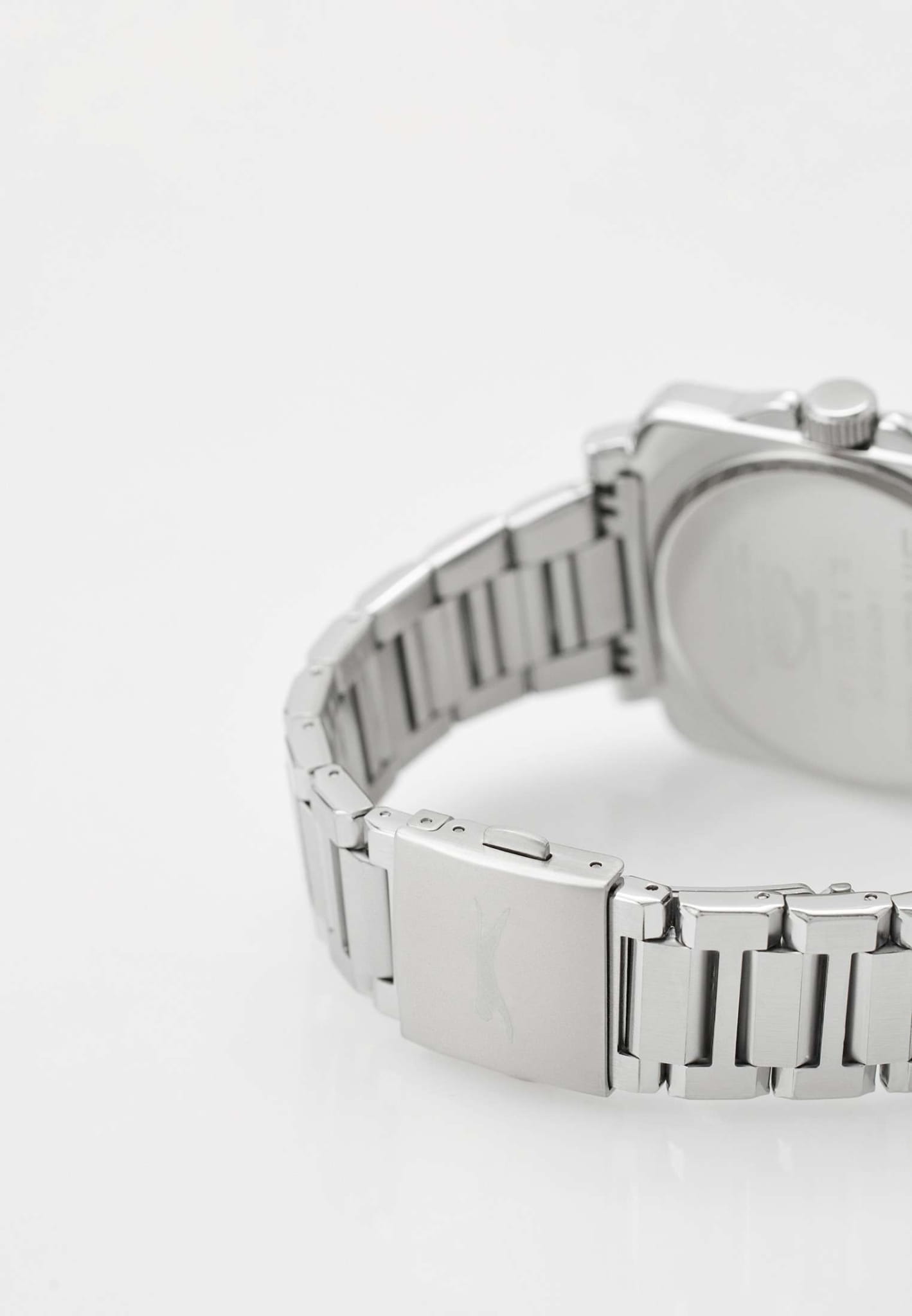 Часы Slazenger SL.09.2232.1.03 — это современная модель, сочетающая стиль и практичность. Корпус квадратной формы выполнен из прочного металла, а круглый синий циферблат придает дизайну особую выразительность. На вращающийся безельБезельВнешний ободок, закрепляющий стекло. В спортивных часах так называется поворотное кольцо с делениями на циферблате, выполняет роль таймера – замеряет отрезки времени на шкале. Неподвижный безель – элемент декора. Однонаправленно вращающийся безель на дайверских часах позволяет фиксировать моменты погружения и выныривания на поверхность. нанесено синее IP-покрытиеIP-покрытиеМетод ионного напыления. Демонстрирует повышенную устойчивость к истиранию, окислению и химическим веществам. Под воздействием высокого давления и температуры около 1500°C молекулы металла надёжно соединяются с частицами корпуса часов.. Серебристый металлический браслет снабжен надежной раскладной застёжкойРаскладная застёжкаТакой тип застёжки используется только на браслетах из металла. Она никогда не раскрывается полностью, происходит разделение на 2 и более частей. Раскладывающая застёжка снизит вероятность потери часов к минимуму., обеспечивающей удобство при повседневном ношении. Модель оснащена кварцевым механизмом, минеральное стеклоМинеральное стеклоМинеральное стекло представляет собой искусственно выращенный минерал кварца. Такое стекло отличается особой устойчивостью к повреждениям и царапинам. Уступает по некоторым качествам сапфировому стеклу., защищающим от случайных повреждений, и водозащитой уровня WR 50, позволяющей не бояться контакта с водой в повседневных ситуациях. На циферблате расположены окошки даты и дня недели. Для удобства использования в темное время суток предусмотрено люминесцентное покрытиеЛюминесцентное покрытиеПозволяет считывать показания времени в темноте. Производители наносят на стрелки, часовые индексы, безель или поверхность циферблата светонакопительный состав, дающий холодное свечение. стрелок. Заводная головка дополнительно защищена от случайных нажатий. Габариты корпуса составляют 43 на 43 мм, толщина — 11 мм.