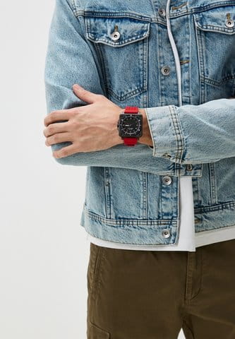 Часы Slazenger SL.09.2233.1.05 — это современная модель, сочетающая стиль и практичность. Корпус квадратной формы выполнен из прочного металла с черным IP-покрытиемIP-покрытиеМетод ионного напыления. Демонстрирует повышенную устойчивость к истиранию, окислению и химическим веществам. Под воздействием высокого давления и температуры около 1500°C молекулы металла надёжно соединяются с частицами корпуса часов., а круглый красный циферблат придает дизайну особую выразительность. На вращающийся безельБезельВнешний ободок, закрепляющий стекло. В спортивных часах так называется поворотное кольцо с делениями на циферблате, выполняет роль таймера – замеряет отрезки времени на шкале. Неподвижный безель – элемент декора. Однонаправленно вращающийся безель на дайверских часах позволяет фиксировать моменты погружения и выныривания на поверхность. нанесено черное IP-покрытиеIP-покрытиеМетод ионного напыления. Демонстрирует повышенную устойчивость к истиранию, окислению и химическим веществам. Под воздействием высокого давления и температуры около 1500°C молекулы металла надёжно соединяются с частицами корпуса часов.. Резиновый красный ремешок с классической застежкой обеспечивает удобство при повседневном ношении. Модель оснащена кварцевым механизмом, минеральное стеклоМинеральное стеклоМинеральное стекло представляет собой искусственно выращенный минерал кварца. Такое стекло отличается особой устойчивостью к повреждениям и царапинам. Уступает по некоторым качествам сапфировому стеклу., защищающим от случайных повреждений, и водозащитой уровня WR 50, позволяющей не бояться контакта с водой в повседневных ситуациях. На циферблате расположены окошки даты и дня недели. Для удобства использования в темное время суток предусмотрено люминесцентное покрытиеЛюминесцентное покрытиеПозволяет считывать показания времени в темноте. Производители наносят на стрелки, часовые индексы, безель или поверхность циферблата светонакопительный состав, дающий холодное свечение. стрелок. Заводная головка дополнительно защищена от случайных нажатий. Габариты корпуса составляют 43 на 43 мм, толщина — 11 мм.