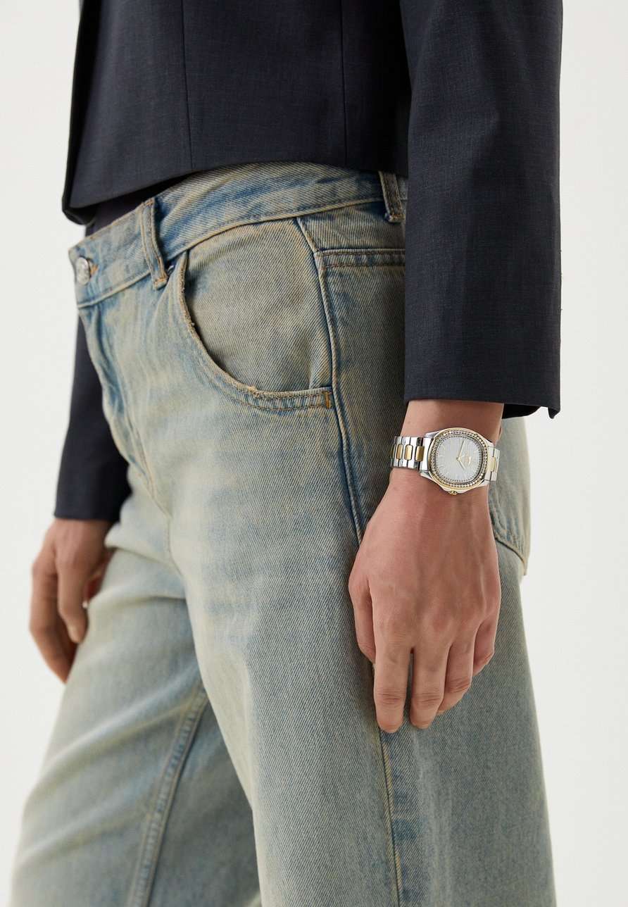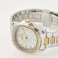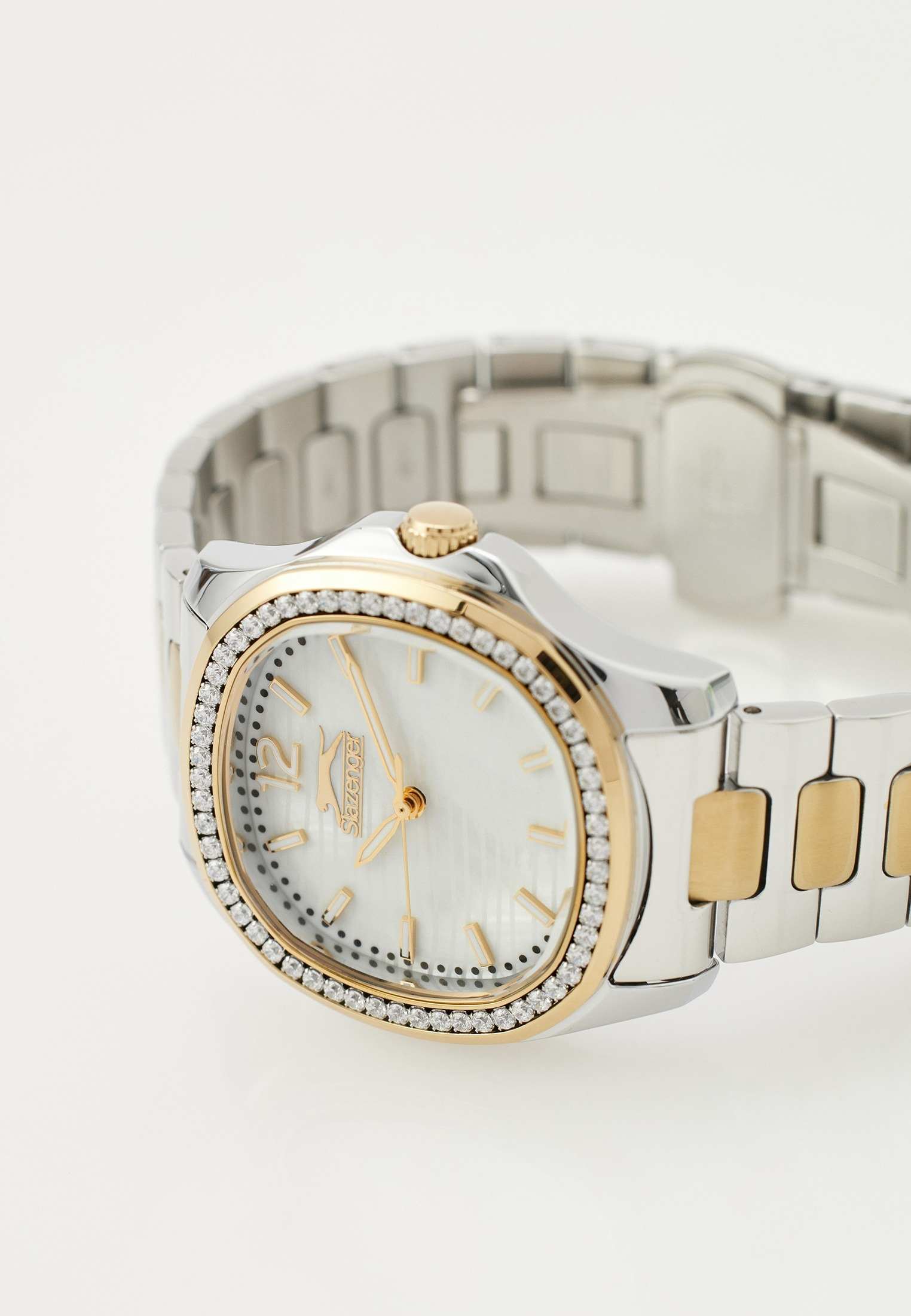 Часы Slazenger SL.09.2238.3.03 – это изысканный аксессуар, который станет стильным акцентом любого образа. Модель оснащена надежным кварцевым механизмом. Корпус из прочного металла размером 34х34 мм украшен россыпью сверкающих фианитов по безелюБезельВнешний ободок, закрепляющий стекло. В спортивных часах так называется поворотное кольцо с делениями на циферблате, выполняет роль таймера – замеряет отрезки времени на шкале. Неподвижный безель – элемент декора. Однонаправленно вращающийся безель на дайверских часах позволяет фиксировать моменты погружения и выныривания на поверхность., который к тому же с золотистым IP-покрытиемIP-покрытиеМетод ионного напыления. Демонстрирует повышенную устойчивость к истиранию, окислению и химическим веществам. Под воздействием высокого давления и температуры около 1500°C молекулы металла надёжно соединяются с частицами корпуса часов., что придает часам особое сияние и элегантность. Белый перламутровый циферблат с логотипом бренда защищен стойким к царапинам минеральным стекломМинеральное стеклоМинеральное стекло представляет собой искусственно выращенный минерал кварца. Такое стекло отличается особой устойчивостью к повреждениям и царапинам. Уступает по некоторым качествам сапфировому стеклу.. Четкие часовые метки в виде лаконичных штрихов и крупная арабская цифра 12 обеспечивают удобство чтения времени. Заводная головка с рифлением дополнена защитой для повышения долговечности. Металлический браслет с частичным золотистым IP-покрытиемIP-покрытиеМетод ионного напыления. Демонстрирует повышенную устойчивость к истиранию, окислению и химическим веществам. Под воздействием высокого давления и температуры около 1500°C молекулы металла надёжно соединяются с частицами корпуса часов. шириной 18 мм надежно фиксируется на запястье с помощью застежки «бабочка»Застёжка "бабочка"Такой вид застёжки дополняется предохранителями, помогающими избежать случайного раскрытия браслета. Обладают изящным исполнением. . Для удобства использования в темное время суток предусмотрено люминесцентное покрытиеЛюминесцентное покрытиеПозволяет считывать показания времени в темноте. Производители наносят на стрелки, часовые индексы, безель или поверхность циферблата светонакопительный состав, дающий холодное свечение. стрелок. Водозащита 30WR позволяет не беспокоиться о случайных брызгах. Вес изделия составляет 92 грамма, что делает часы комфортными для ежедневного ношения. Эти часы идеально подойдут для тех, кто ценит гармонию стиля, качества и функциональности.