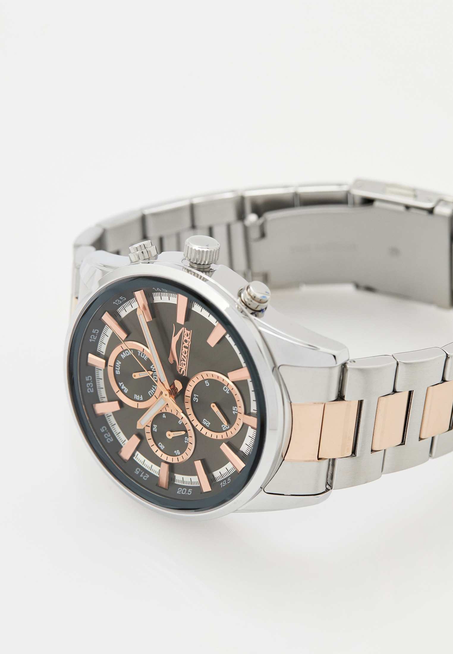Часы Slazenger SL.09.2242.2.02 – это стильная и надежная модель, созданная для современных мужчин, ценящих качество и функциональность. Корпус и браслет выполнены из прочного металла серебряного цвета, что придает аксессуару элегантный внешний вид и обеспечивает долговечность. Часы фиксируются на руке с помощью браслета из металла с частичным золотистым IP-покрытиемIP-покрытиеМетод ионного напыления. Демонстрирует повышенную устойчивость к истиранию, окислению и химическим веществам. Под воздействием высокого давления и температуры около 1500°C молекулы металла надёжно соединяются с частицами корпуса часов. и удобной раскладной застёжкойРаскладная застёжкаТакой тип застёжки используется только на браслетах из металла. Она никогда не раскрывается полностью, происходит разделение на 2 и более частей. Раскладывающая застёжка снизит вероятность потери часов к минимуму.. Кварцевый механизм гарантирует точность хода, а минеральное стеклоМинеральное стеклоМинеральное стекло представляет собой искусственно выращенный минерал кварца. Такое стекло отличается особой устойчивостью к повреждениям и царапинам. Уступает по некоторым качествам сапфировому стеклу. защищает графитовый циферблат от царапин и повреждений. Диаметр корпуса составляет 46 мм, толщина – 13 мм, ширина ремешка – 24 мм, а вес часов – 146 грамм, что делает их удобными для повседневного ношения. Водозащита уровня WR 50 позволяет не снимать часы во время мытья рук и при незначительном контакте с водой. Для удобства использования в темное время суток предусмотрено люминесцентное покрытиеЛюминесцентное покрытиеПозволяет считывать показания времени в темноте. Производители наносят на стрелки, часовые индексы, безель или поверхность циферблата светонакопительный состав, дающий холодное свечение. стрелок. Модель оснащена дополнительными циферблатами, отображающими дату, день недели и текущее время в 24-часовом формате.