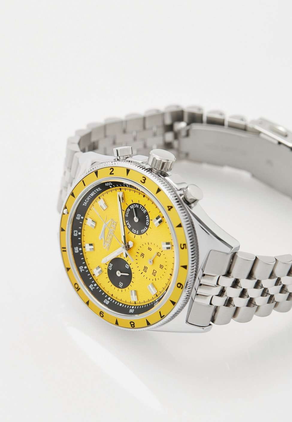Часы Slazenger SL.09.2248.2.04 — это современная модель с выразительным спортивным характером, идеально подходящая для активного образа жизни. Корпус выполнен из прочного металла, желтый циферблат защищён минеральным стекломМинеральное стеклоМинеральное стекло представляет собой искусственно выращенный минерал кварца. Такое стекло отличается особой устойчивостью к повреждениям и царапинам. Уступает по некоторым качествам сапфировому стеклу., устойчивым к царапинам. Часы также оснащены шкалой тахиметраТахиметрРазмеченная шкала, располагается на ободке или безеле часов. Тахиметр позволяет рассчитать скорость на определённом участке пути, расстояние измеряется в километрах или милях., что добавляет им функциональности и может быть полезно для измерения скорости.  На безельБезельВнешний ободок, закрепляющий стекло. В спортивных часах так называется поворотное кольцо с делениями на циферблате, выполняет роль таймера – замеряет отрезки времени на шкале. Неподвижный безель – элемент декора. Однонаправленно вращающийся безель на дайверских часах позволяет фиксировать моменты погружения и выныривания на поверхность. нанесено желтое IP-покрытиеIP-покрытиеМетод ионного напыления. Демонстрирует повышенную устойчивость к истиранию, окислению и химическим веществам. Под воздействием высокого давления и температуры около 1500°C молекулы металла надёжно соединяются с частицами корпуса часов..  Диаметр корпуса составляет 46 мм, толщина — 11 мм, а ширина браслета — 22 мм.  Часы оснащены металлическим браслетом с надежной раскладной застёжкойРаскладная застёжкаТакой тип застёжки используется только на браслетах из металла. Она никогда не раскрывается полностью, происходит разделение на 2 и более частей. Раскладывающая застёжка снизит вероятность потери часов к минимуму., благодаря чему часы удобно сидят на руке и не вызывают дискомфорта даже при длительном ношении. Вес модели составляет 130 грамм. Надёжный кварцевый механизм обеспечивает точность времени, а уровень водозащиты WR 50 позволяет использовать часы в повседневных условиях, не опасаясь случайных брызг или дождя. Для удобства использования в темное время суток предусмотрено люминесцентное покрытиеЛюминесцентное покрытиеПозволяет считывать показания времени в темноте. Производители наносят на стрелки, часовые индексы, безель или поверхность циферблата светонакопительный состав, дающий холодное свечение. стрелок и меток. Дополнительные малые циферблаты показывают дату, день недели и текущее время в 24-часовом формате, что делает использование часов ещё более удобным и функциональным.