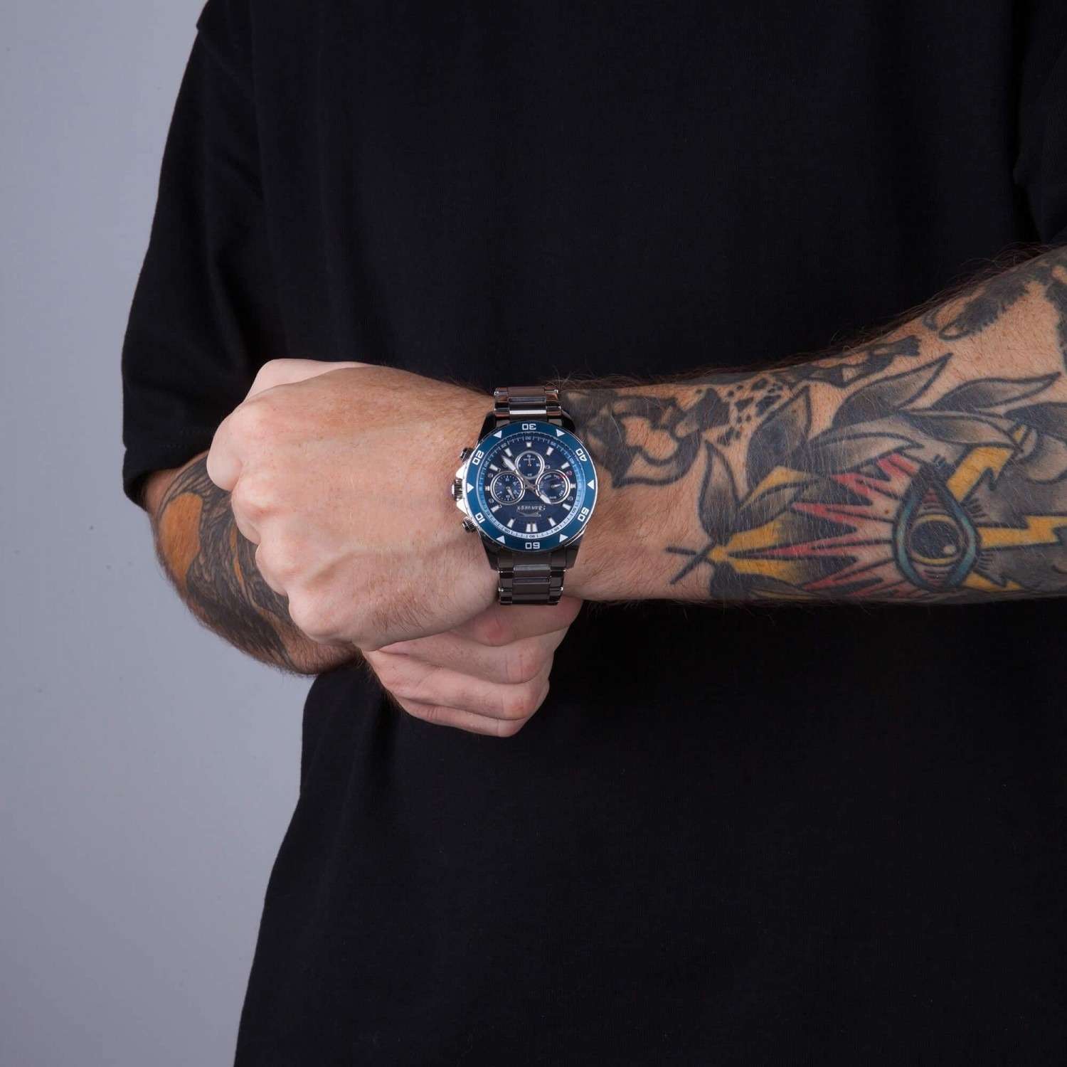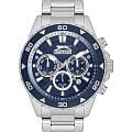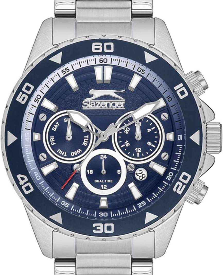 Часы Slazenger SL.09.2250.2.03 — это стильная и практичная модель, выполненная в элегантном серебристом цвете. Корпус и браслет изготовлены из металла, что обеспечивает прочность и долговечность. На безельБезельВнешний ободок, закрепляющий стекло. В спортивных часах так называется поворотное кольцо с делениями на циферблате, выполняет роль таймера – замеряет отрезки времени на шкале. Неподвижный безель – элемент декора. Однонаправленно вращающийся безель на дайверских часах позволяет фиксировать моменты погружения и выныривания на поверхность. нанесено синее IP-покрытиеIP-покрытиеМетод ионного напыления. Демонстрирует повышенную устойчивость к истиранию, окислению и химическим веществам. Под воздействием высокого давления и температуры около 1500°C молекулы металла надёжно соединяются с частицами корпуса часов.. Минеральное стеклоМинеральное стеклоМинеральное стекло представляет собой искусственно выращенный минерал кварца. Такое стекло отличается особой устойчивостью к повреждениям и царапинам. Уступает по некоторым качествам сапфировому стеклу. надежно защищает синий циферблат от царапин и повреждений. Диаметр корпуса составляет 44 мм, а толщина — 11 мм, благодаря чему часы смотрятся солидно и современно. Модель оснащена кварцевым механизмом, отличающимся точностью и надежностью. На циферблате представлены дополнительные малые циферблаты для отображения второго часового поясаВторой часовой поясФункция, позволяющая отображать время двух часовых поясов одновременно., дня недели и времени в 24-часовом формате, а также имеется отдельное окошко даты. Для удобства использования в темное время суток предусмотрено люминесцентное покрытиеЛюминесцентное покрытиеПозволяет считывать показания времени в темноте. Производители наносят на стрелки, часовые индексы, безель или поверхность циферблата светонакопительный состав, дающий холодное свечение. стрелок и меток. Удобный металлический браслет шириной 22 мм снабжен раскладной застёжкойРаскладная застёжкаТакой тип застёжки используется только на браслетах из металла. Она никогда не раскрывается полностью, происходит разделение на 2 и более частей. Раскладывающая застёжка снизит вероятность потери часов к минимуму., обеспечивающей надежную фиксацию на запястье. Заводная головка оснащена защитой. Водозащита уровня WR 50 позволяет не снимать часы при мытье рук или попадании под дождь. Вес модели составляет 152 грамм.