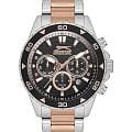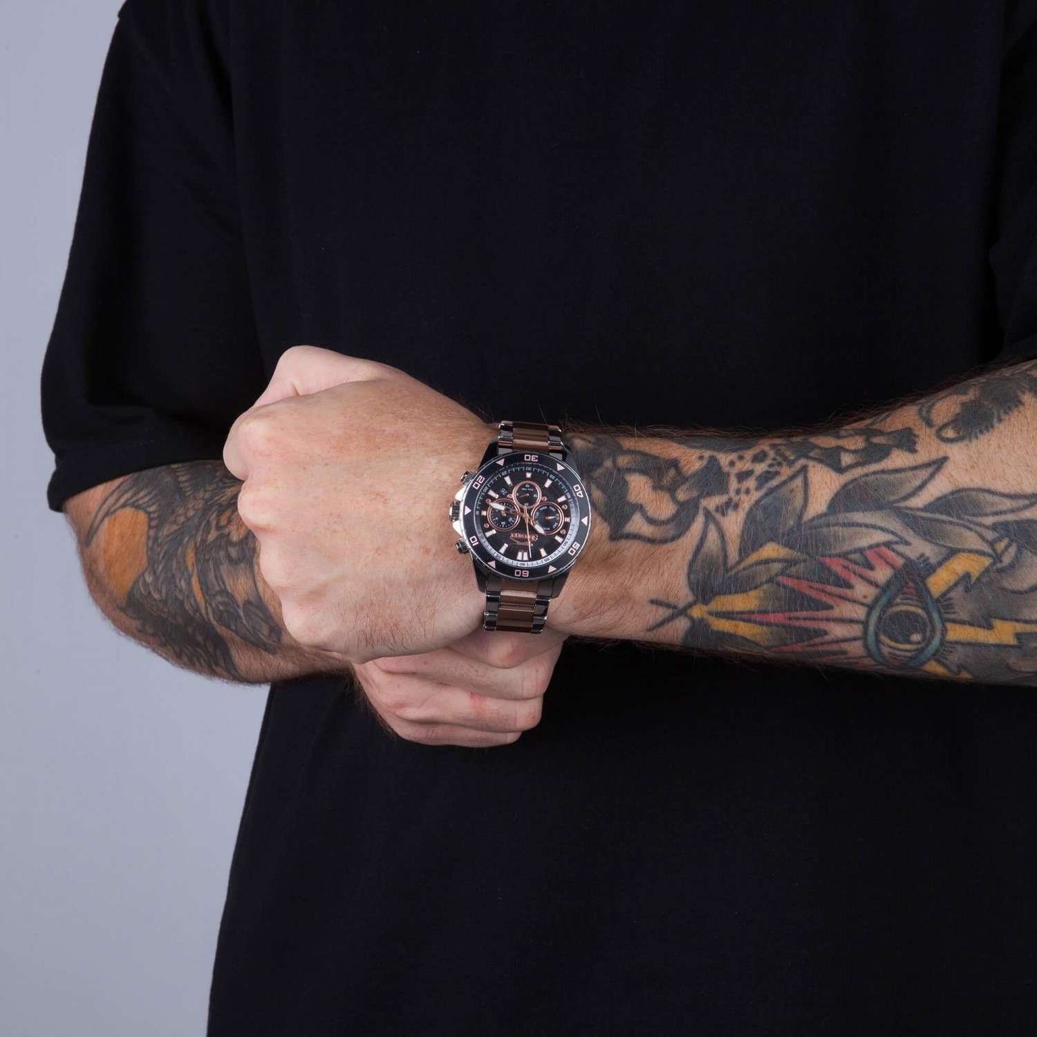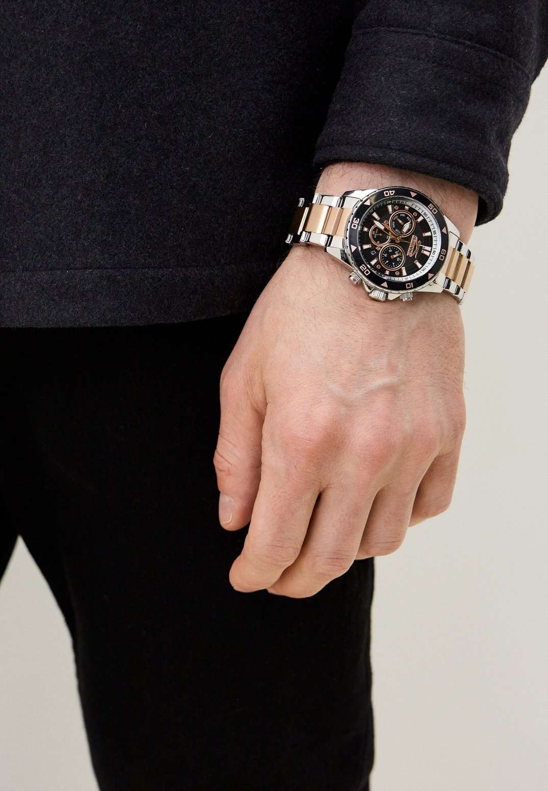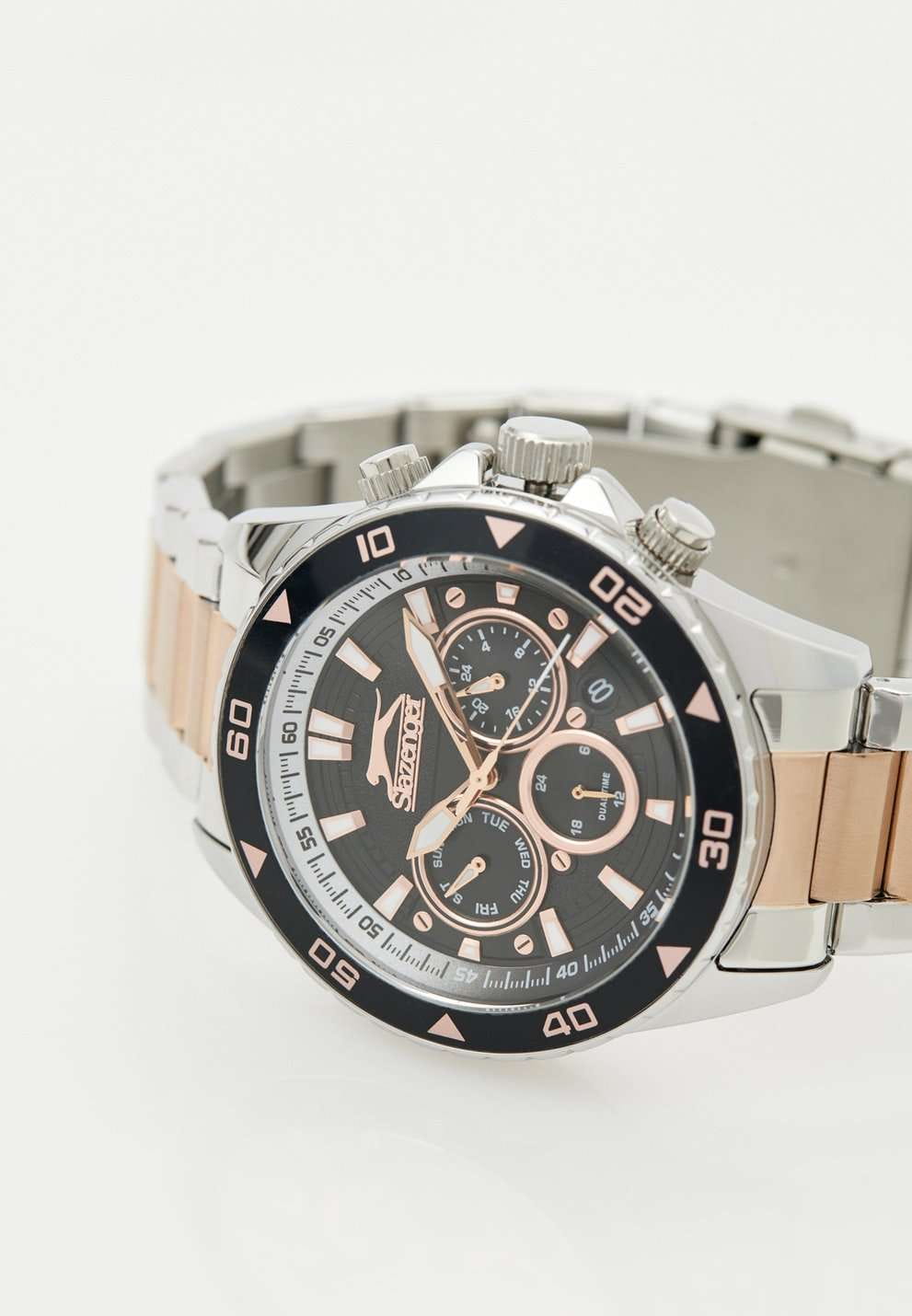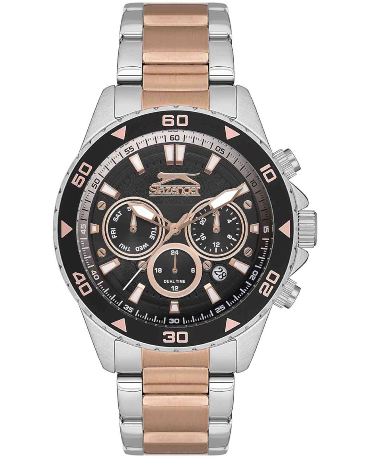 Часы Slazenger SL.09.2250.2.04 — это стильная и практичная модель, выполненная в элегантном серебристом цвете. Корпус изготовлен из металла, а на металлический браслет нанесено частичное розово-золотистое IP-покрытиеIP-покрытиеМетод ионного напыления. Демонстрирует повышенную устойчивость к истиранию, окислению и химическим веществам. Под воздействием высокого давления и температуры около 1500°C молекулы металла надёжно соединяются с частицами корпуса часов., что обеспечивает прочность и долговечность. На безельБезельВнешний ободок, закрепляющий стекло. В спортивных часах так называется поворотное кольцо с делениями на циферблате, выполняет роль таймера – замеряет отрезки времени на шкале. Неподвижный безель – элемент декора. Однонаправленно вращающийся безель на дайверских часах позволяет фиксировать моменты погружения и выныривания на поверхность. нанесено черное IP-покрытиеIP-покрытиеМетод ионного напыления. Демонстрирует повышенную устойчивость к истиранию, окислению и химическим веществам. Под воздействием высокого давления и температуры около 1500°C молекулы металла надёжно соединяются с частицами корпуса часов.. Минеральное стеклоМинеральное стеклоМинеральное стекло представляет собой искусственно выращенный минерал кварца. Такое стекло отличается особой устойчивостью к повреждениям и царапинам. Уступает по некоторым качествам сапфировому стеклу. надежно защищает синий циферблат от царапин и повреждений. Диаметр корпуса составляет 44 мм, а толщина — 11 мм, благодаря чему часы смотрятся солидно и современно. Модель оснащена кварцевым механизмом, отличающимся точностью и надежностью. На циферблате представлены дополнительные малые циферблаты для отображения второго часового поясаВторой часовой поясФункция, позволяющая отображать время двух часовых поясов одновременно., дня недели и времени в 24-часовом формате, а также имеется отдельное окошко даты. Для удобства использования в темное время суток предусмотрено люминесцентное покрытиеЛюминесцентное покрытиеПозволяет считывать показания времени в темноте. Производители наносят на стрелки, часовые индексы, безель или поверхность циферблата светонакопительный состав, дающий холодное свечение. стрелок и меток. Удобный металлический браслет шириной 22 мм снабжен раскладной застёжкойРаскладная застёжкаТакой тип застёжки используется только на браслетах из металла. Она никогда не раскрывается полностью, происходит разделение на 2 и более частей. Раскладывающая застёжка снизит вероятность потери часов к минимуму., обеспечивающей надежную фиксацию на запястье. Заводная головка оснащена защитой. Водозащита уровня WR 50 позволяет не снимать часы при мытье рук или попадании под дождь. Вес модели составляет 152 грамм.