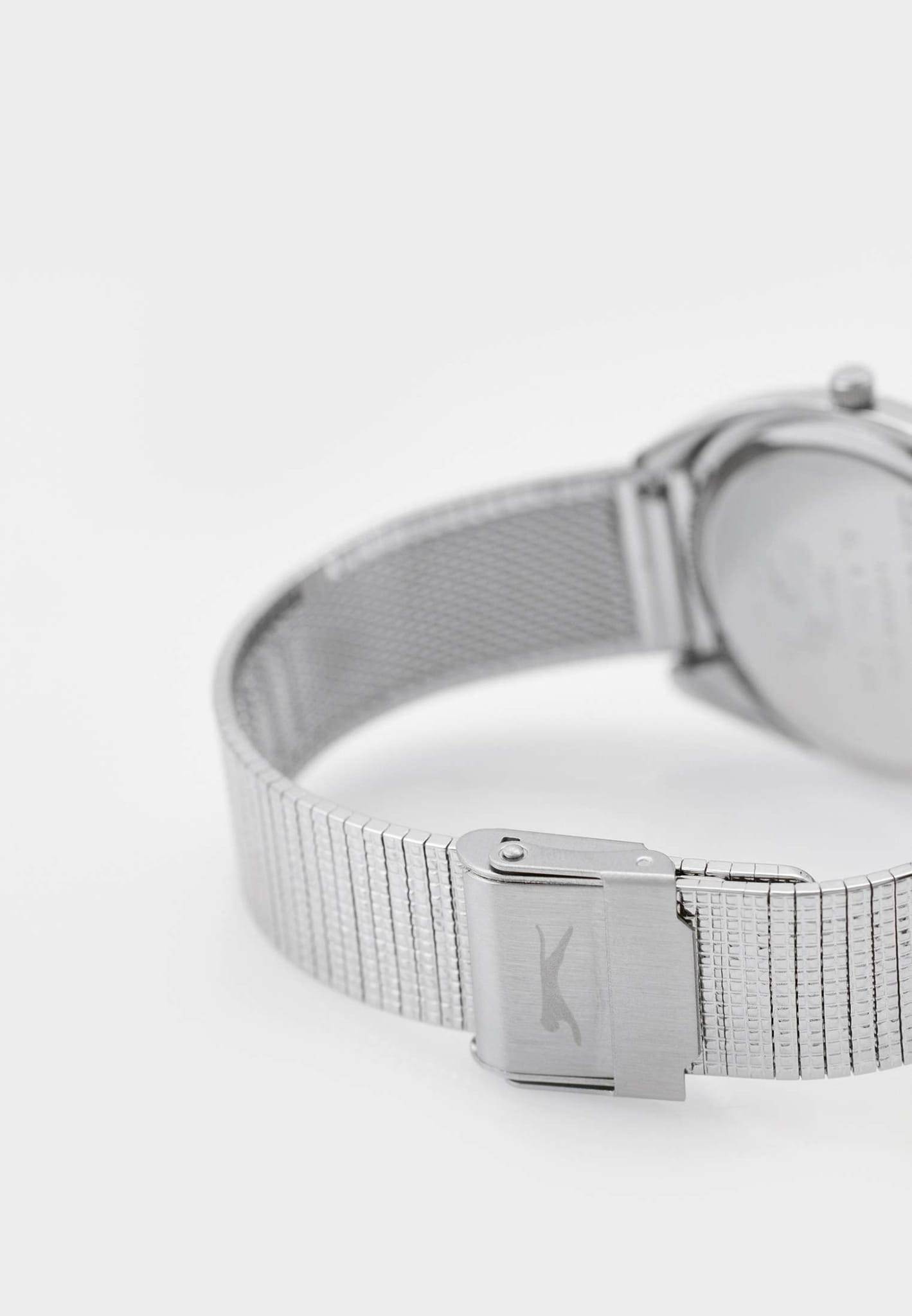 Часы Slazenger SL.09.2261.3.04 — это утонченное сочетание современного дизайна и классической элегантности. Изделие оснащено надежным кварцевым механизмом, который обеспечивает точность хода и простоту эксплуатации. Корпус из суперметалла гармонично сочетается с металлическим браслетом аналогичного оттенка и покрытия, подчеркивая изысканность аксессуара и его актуальность в модных тенденциях. Бирюзовый циферблат украшен изысканным гильоше Clous de Paris и дополнен лаконичными метками в виде штрихов, а также фирменным логотипом бренда. Минеральное стеклоМинеральное стеклоМинеральное стекло представляет собой искусственно выращенный минерал кварца. Такое стекло отличается особой устойчивостью к повреждениям и царапинам. Уступает по некоторым качествам сапфировому стеклу. надежно защищает циферблат от случайных царапин. Диаметр корпуса составляет 34 мм, толщина — 8 мм, ширина браслета — 18 мм, а вес часов — всего 54 г, благодаря чему аксессуар удобно сидит на запястье. Стальной браслет c раскладным замкомРаскладной замокДанный вариант застежки используется только на часах с металлическим браслетом. Отличительная особенность такого крепления в том, что длина браслета становится универсальной и вы можете самостоятельно отрегулировать нужный вам размер – застежка просто двигается по браслету часов. удобно фиксируется на запястье и подчёркивает современный характер часов. Водозащита 30WR позволяет не беспокоиться о случайных брызгах. Модель отличается отсутствием секундной стрелки и оснащена рифленой заводной головкой для легкой корректировки времени. Эти часы станут стильным завершением любого образа, подчеркивая индивидуальность и чувство вкуса обладателя.
