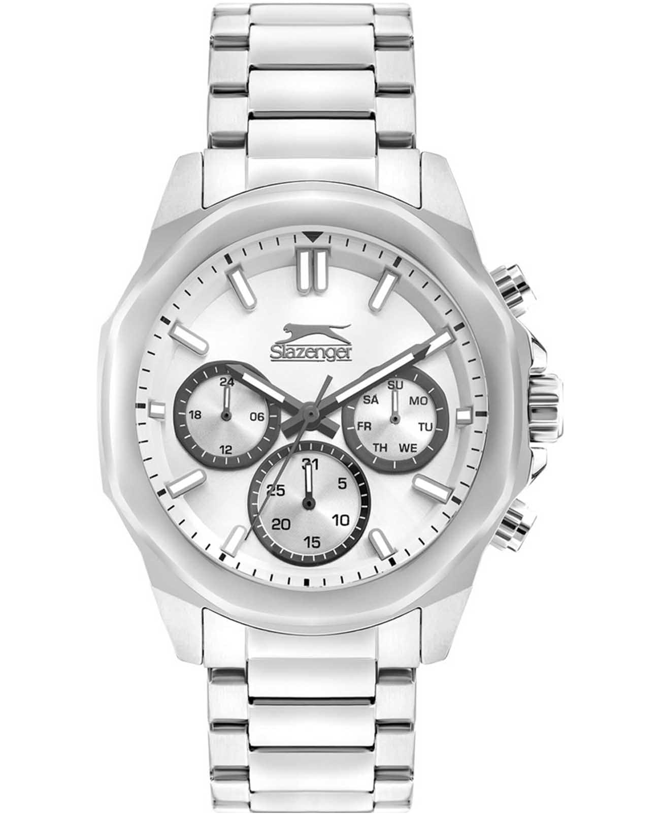 Часы Slazenger SL.09.2289.2.04 — это сочетание современного дизайна и функциональности, идеально подходящее для тех, кто ценит стиль и надежность. Корпус и браслет выполнены из прочного суперметалла, что придаёт модели солидный и эффектный вид. Серебристый циферблат с лаконичными отметками и фирменным логотипом защищён устойчивым к царапинам минеральным стекломМинеральное стеклоМинеральное стекло представляет собой искусственно выращенный минерал кварца. Такое стекло отличается особой устойчивостью к повреждениям и царапинам. Уступает по некоторым качествам сапфировому стеклу.. Дополнительные функции включают отображение даты и дня недели, а также 12- и 24-часовой формат времени на отдельных мини-циферблатах, что делает использование часов максимально удобным. Заводная головка оснащена защитой, а надёжная раскладная застёжкаРаскладная застёжкаТакой тип застёжки используется только на браслетах из металла. Она никогда не раскрывается полностью, происходит разделение на 2 и более частей. Раскладывающая застёжка снизит вероятность потери часов к минимуму. обеспечивает комфортную посадку на запястье. Особое внимание привлекает восьмигранный безельБезельВнешний ободок, закрепляющий стекло. В спортивных часах так называется поворотное кольцо с делениями на циферблате, выполняет роль таймера – замеряет отрезки времени на шкале. Неподвижный безель – элемент декора. Однонаправленно вращающийся безель на дайверских часах позволяет фиксировать моменты погружения и выныривания на поверхность.. Циферблат оснащён люминесцентным покрытиемЛюминесцентное покрытиеПозволяет считывать показания времени в темноте. Производители наносят на стрелки, часовые индексы, безель или поверхность циферблата светонакопительный состав, дающий холодное свечение. стрелок и меток, что позволяет легко определять время даже в условиях плохой освещенности. Водозащита 50WR позволяет не беспокоиться о случайных брызгах и дождевых каплях. Диаметр корпуса составляет 46 мм, толщина — 14 мм, вес — 165 г, благодаря чему часы выглядят внушительно и подчёркивают индивидуальный стиль владельца. Эта модель станет отличным акцентом в вашем образе и подчеркнёт вашу уверенность в любой ситуации.