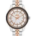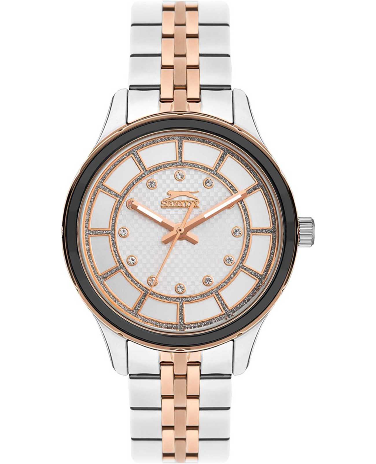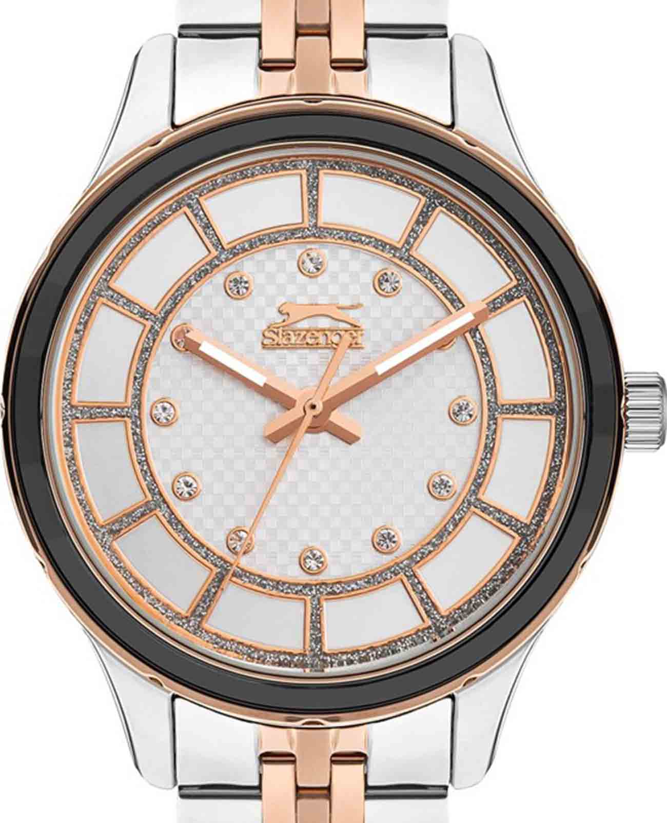 Женские наручные часы Slazenger SL.09.2295.3.04 — это элегантный аксессуар, который подчеркнет утончённый стиль своей обладательницы. Корпус диаметром 36 мм и толщиной 11,5 мм выполнен из прочного металла и надёжно защищён минеральным стекломМинеральное стеклоМинеральное стекло представляет собой искусственно выращенный минерал кварца. Такое стекло отличается особой устойчивостью к повреждениям и царапинам. Уступает по некоторым качествам сапфировому стеклу., устойчивым к царапинам. Серебристый циферблат украшен изящными кристаллами, придающими часам особый блеск и изысканность. Модель оснащена люминесцентным покрытиемЛюминесцентное покрытиеПозволяет считывать показания времени в темноте. Производители наносят на стрелки, часовые индексы, безель или поверхность циферблата светонакопительный состав, дающий холодное свечение. стрелок, что облегчает считывание времени в темноте. Особое внимание привлекает безельБезельВнешний ободок, закрепляющий стекло. В спортивных часах так называется поворотное кольцо с делениями на циферблате, выполняет роль таймера – замеряет отрезки времени на шкале. Неподвижный безель – элемент декора. Однонаправленно вращающийся безель на дайверских часах позволяет фиксировать моменты погружения и выныривания на поверхность. с черным IP-покрытиемIP-покрытиеМетод ионного напыления. Демонстрирует повышенную устойчивость к истиранию, окислению и химическим веществам. Под воздействием высокого давления и температуры около 1500°C молекулы металла надёжно соединяются с частицами корпуса часов.. Металлический браслет с частичным розово-золотистым IP-покрытиемIP-покрытиеМетод ионного напыления. Демонстрирует повышенную устойчивость к истиранию, окислению и химическим веществам. Под воздействием высокого давления и температуры около 1500°C молекулы металла надёжно соединяются с частицами корпуса часов. шириной 16 мм оснащён удобной раскладной застёжкойРаскладная застёжкаТакой тип застёжки используется только на браслетах из металла. Она никогда не раскрывается полностью, происходит разделение на 2 и более частей. Раскладывающая застёжка снизит вероятность потери часов к минимуму. для комфортной посадки на запястье. Кварцевый механизм обеспечивает точность хода, а водозащита уровня WR 30 защищает часы от случайных брызг. Для удобства в условиях плохой освещённости предусмотрена подсветка стрелок. Вес изделия составляет 95 граммов.