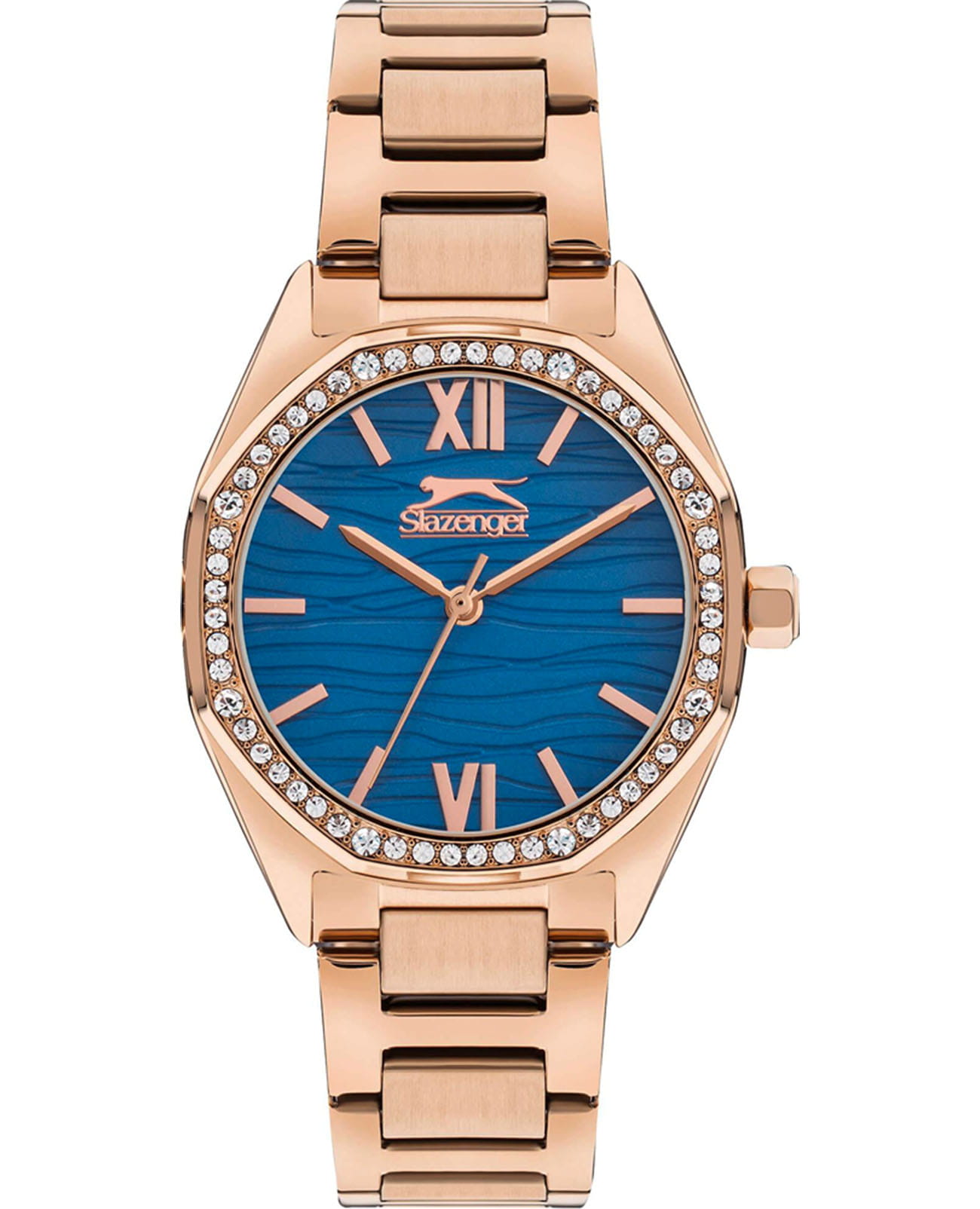 Женские кварцевые часы Slazenger SL.09.2301.3.02 — это элегантный и изысканный аксессуар, подчеркивающий стиль и утончённость. Корпус и браслет выполнены из суперметалла с IP-покрытиемIP-покрытиеМетод ионного напыления. Демонстрирует повышенную устойчивость к истиранию, окислению и химическим веществам. Под воздействием высокого давления и температуры около 1500°C молекулы металла надёжно соединяются с частицами корпуса часов., защищён минеральным стекломМинеральное стеклоМинеральное стекло представляет собой искусственно выращенный минерал кварца. Такое стекло отличается особой устойчивостью к повреждениям и царапинам. Уступает по некоторым качествам сапфировому стеклу.. Циферблат синего цвета с волнистым рельефным рисунком оформлен штриховыми метками и римскими цифрами VI и XII, дополнен логотипом бренда. Безель гранёный, украшен паве из фианитов, придающих модели изысканное сияние. Заводная головка — граненая, добавляющая детали дизайна. Браслет из суперметалла фиксируется на раскладной застёжкеРаскладная застёжкаТакой тип застёжки используется только на браслетах из металла. Она никогда не раскрывается полностью, происходит разделение на 2 и более частей. Раскладывающая застёжка снизит вероятность потери часов к минимуму., обеспечивая надёжность и комфорт ношения. Водонепроницаемость 30 м позволяет использовать часы в повседневных условиях, защищая от случайных брызг и капель дождя. Модель идеально подходит как для повседневного, так и для торжественного образа.