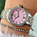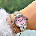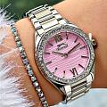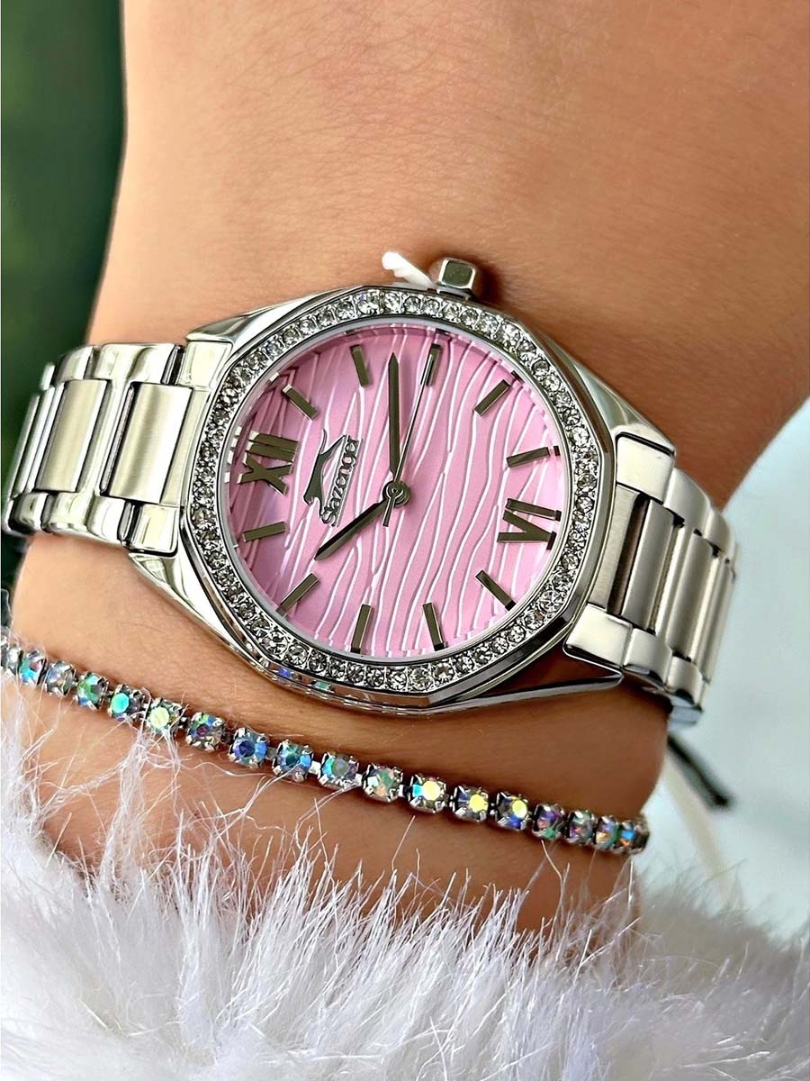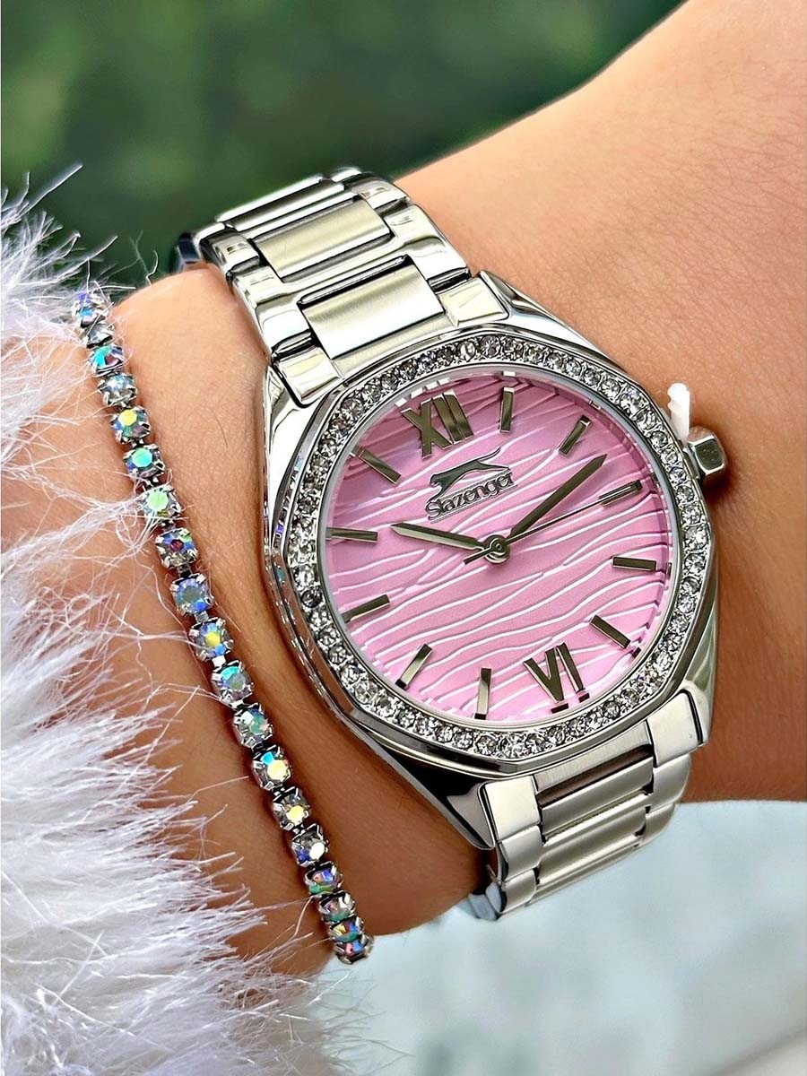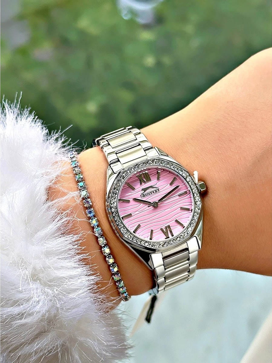Женские кварцевые часы Slazenger SL.09.2301.3.09 — это элегантный и изысканный аксессуар, подчеркивающий стиль и утончённость. Корпус и браслет выполнены из суперметалла, защищён минеральным стекломМинеральное стеклоМинеральное стекло представляет собой искусственно выращенный минерал кварца. Такое стекло отличается особой устойчивостью к повреждениям и царапинам. Уступает по некоторым качествам сапфировому стеклу.. Циферблат розового цвета с волнистым рельефным рисунком оформлен штриховыми метками и римскими цифрами VI и XII, дополнен логотипом бренда. Безель гранёный, украшен паве из фианитов, придающих модели изысканное сияние. Заводная головка — граненая, добавляющая детали дизайна. Браслет из суперметалла фиксируется на раскладной застёжкеРаскладная застёжкаТакой тип застёжки используется только на браслетах из металла. Она никогда не раскрывается полностью, происходит разделение на 2 и более частей. Раскладывающая застёжка снизит вероятность потери часов к минимуму., обеспечивая надёжность и комфорт ношения. Водонепроницаемость 30 м позволяет использовать часы в повседневных условиях, защищая от случайных брызг и капель дождя. Модель идеально подходит как для повседневного, так и для торжественного образа.